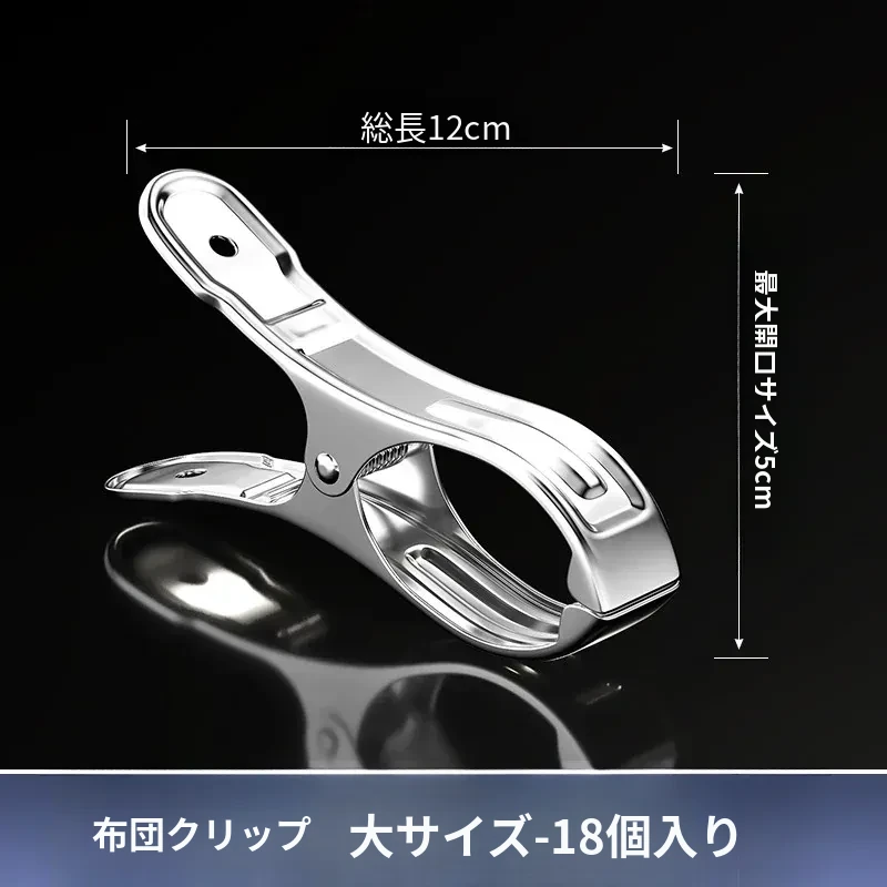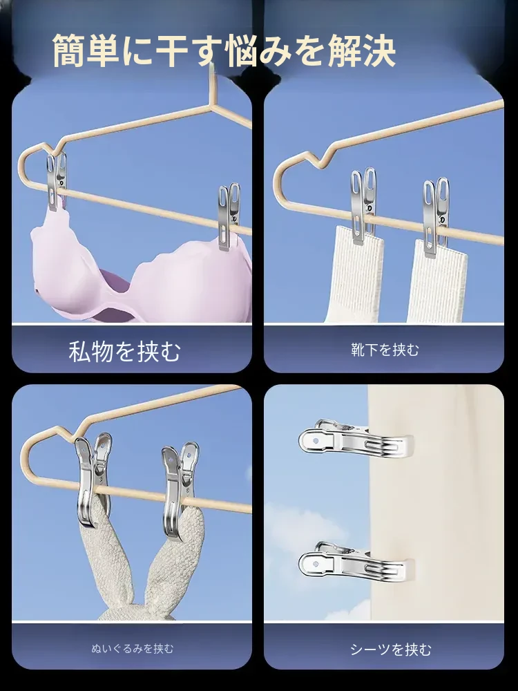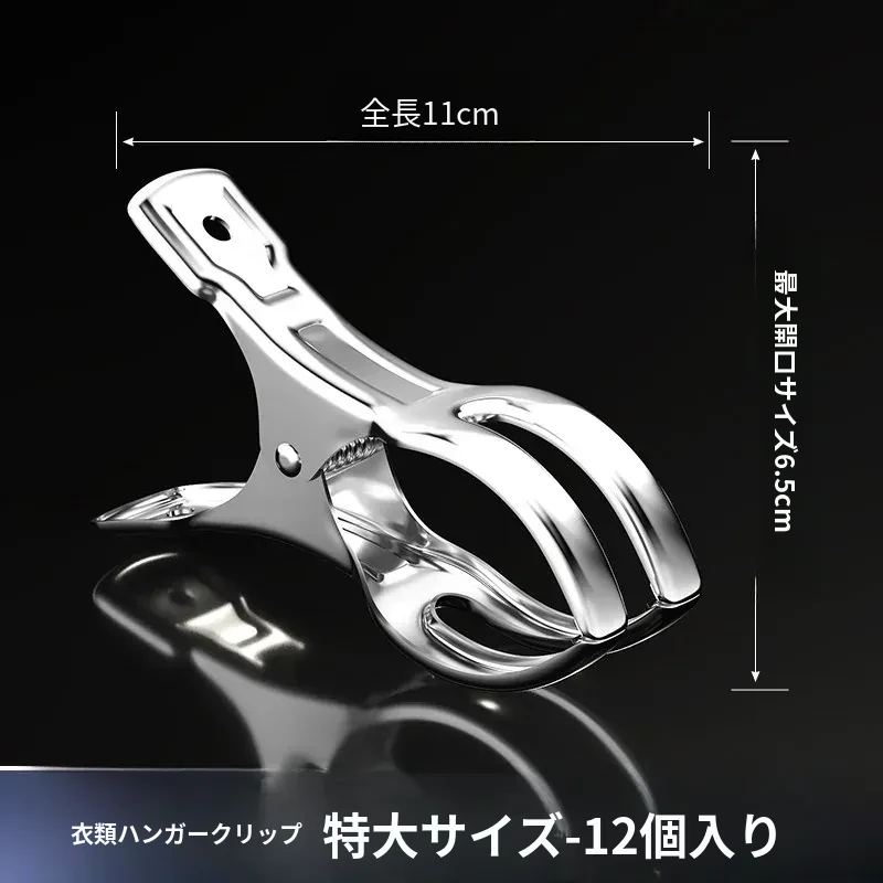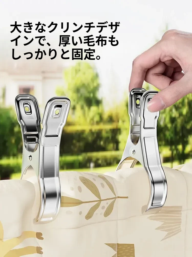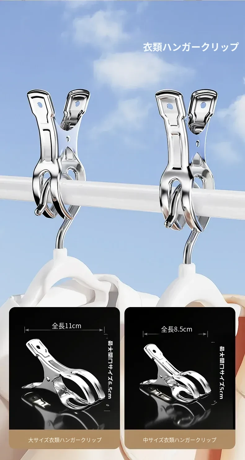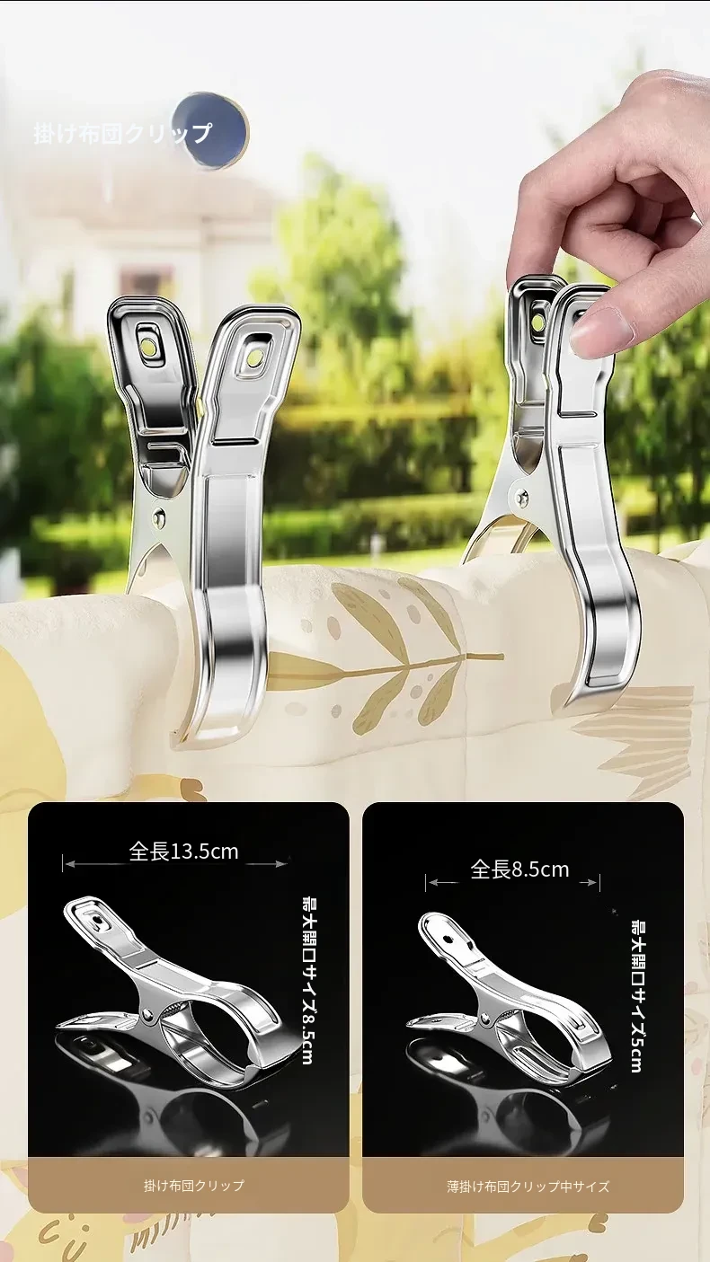 風に強いステンレス製大クリップ!洗濯物や布団をしっかり固定する万能クリップ。靴下や衣類も安心して干せる、家庭必備の便利グッズ!