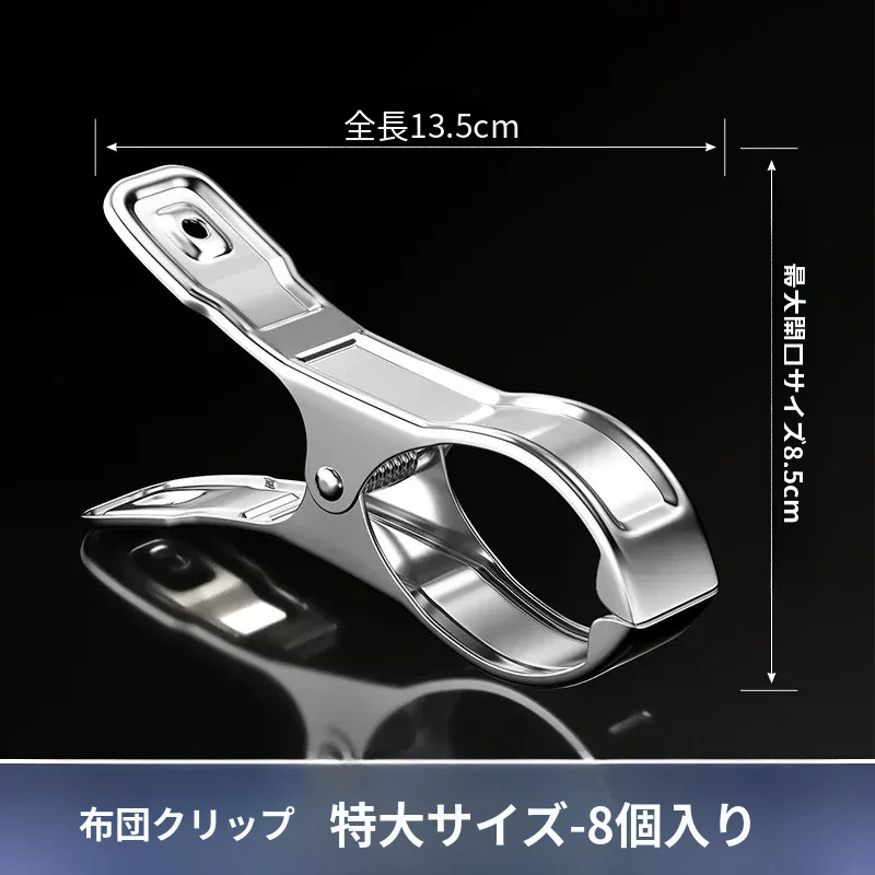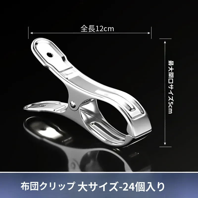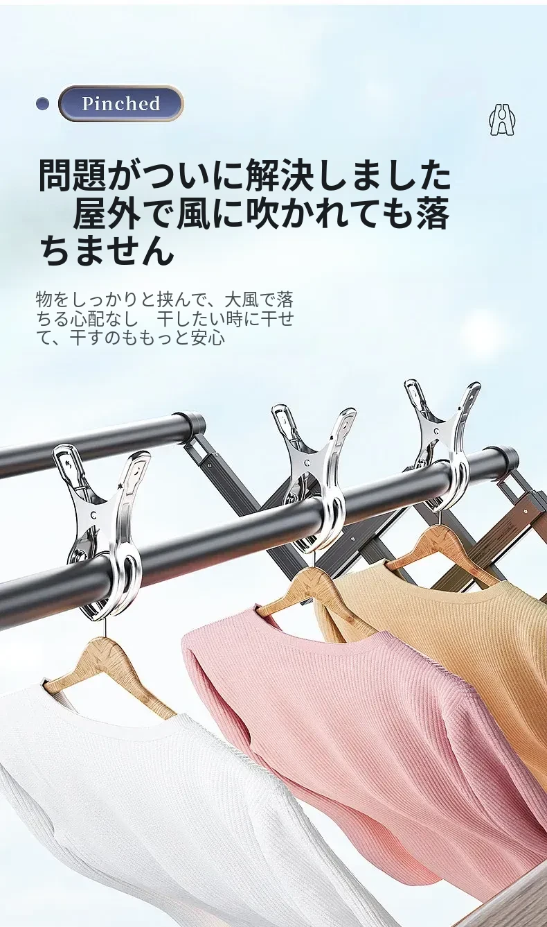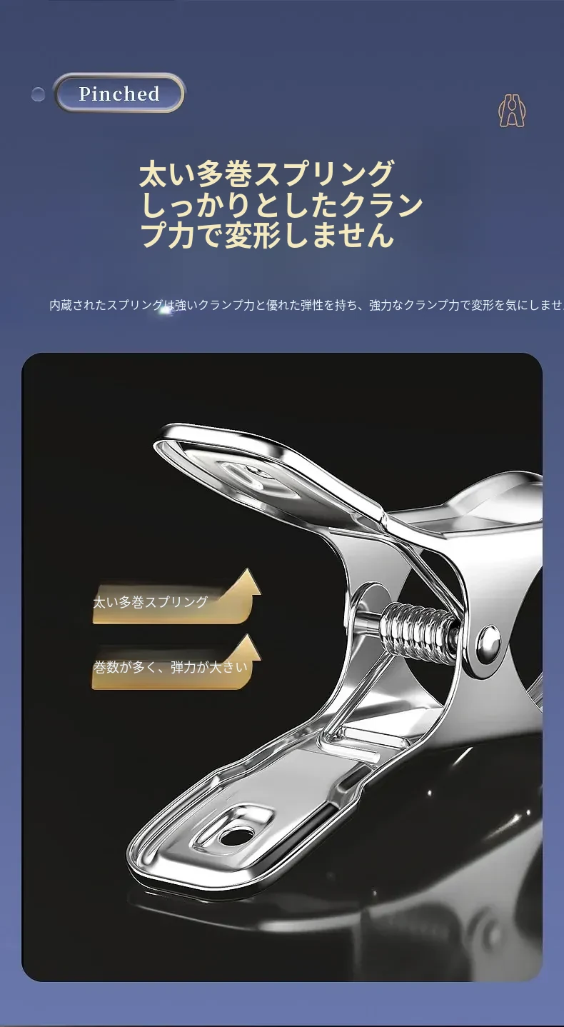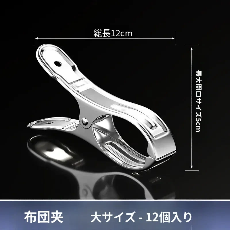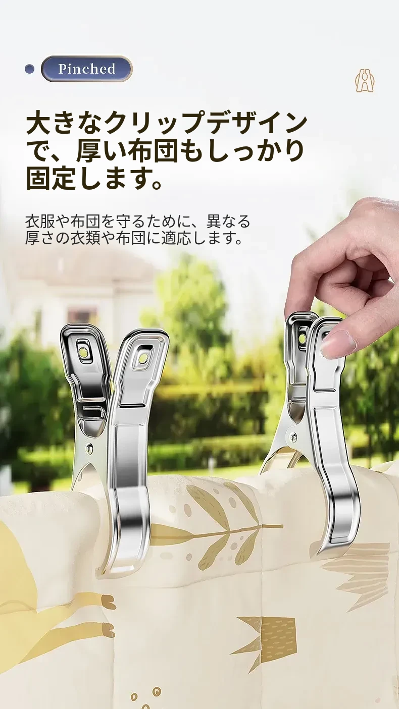 風に強いステンレス製大クリップ!洗濯物や布団をしっかり固定する万能クリップ。靴下や衣類も安心して干せる、家庭必備の便利グッズ!