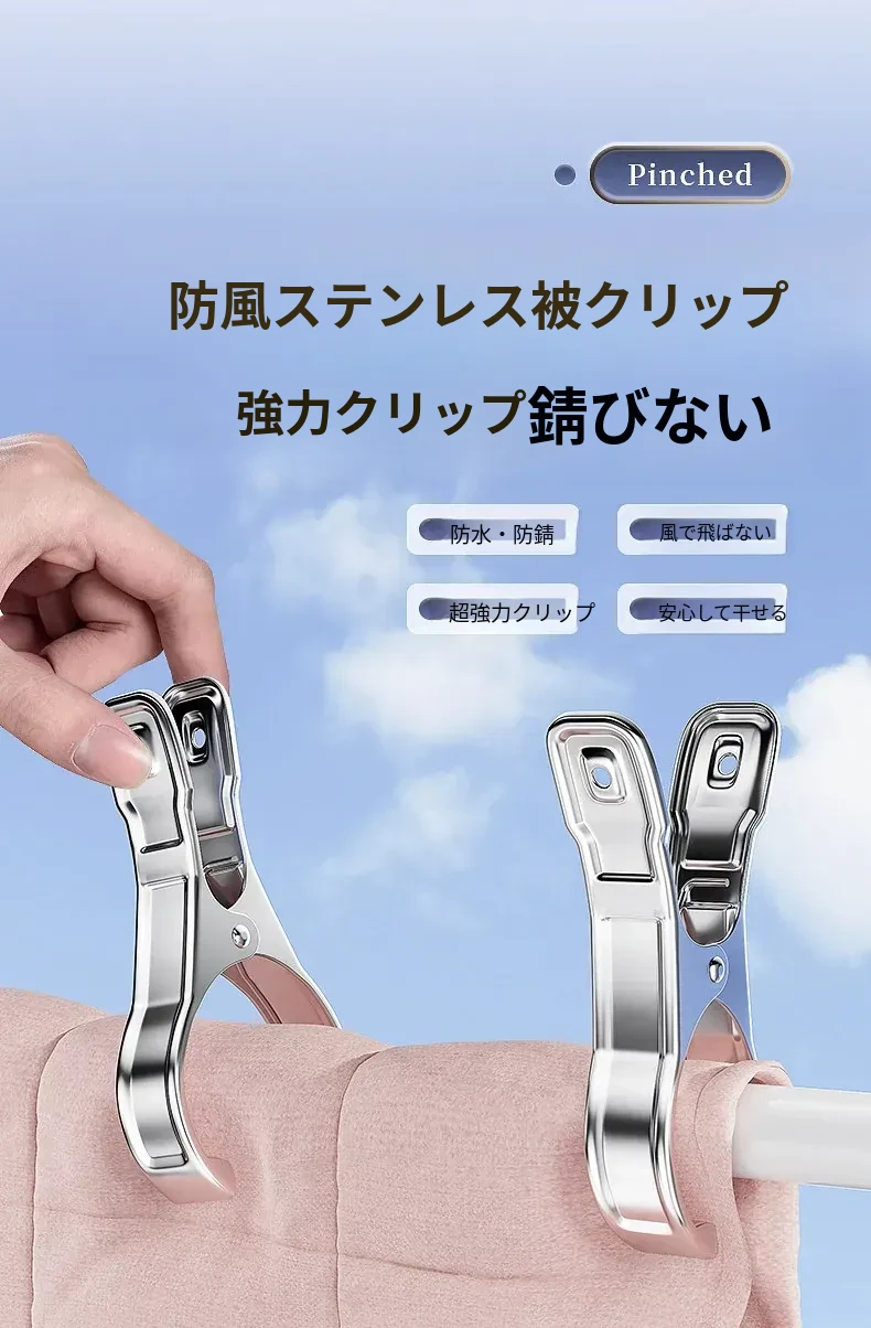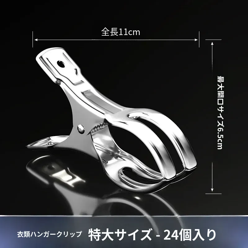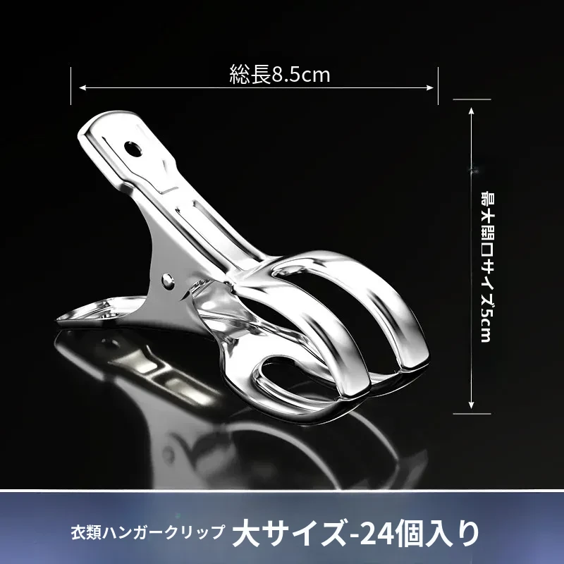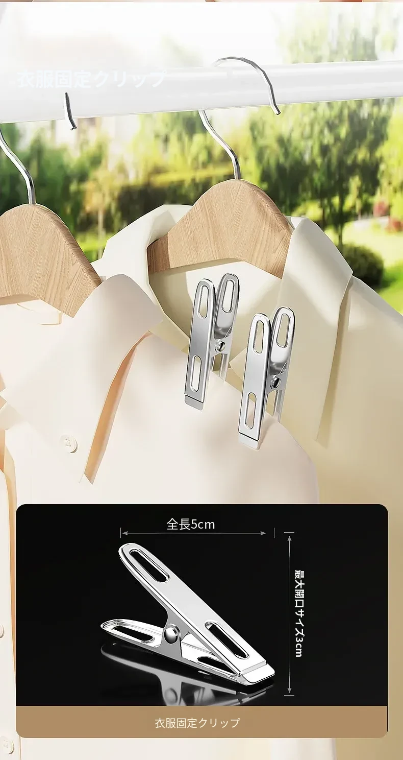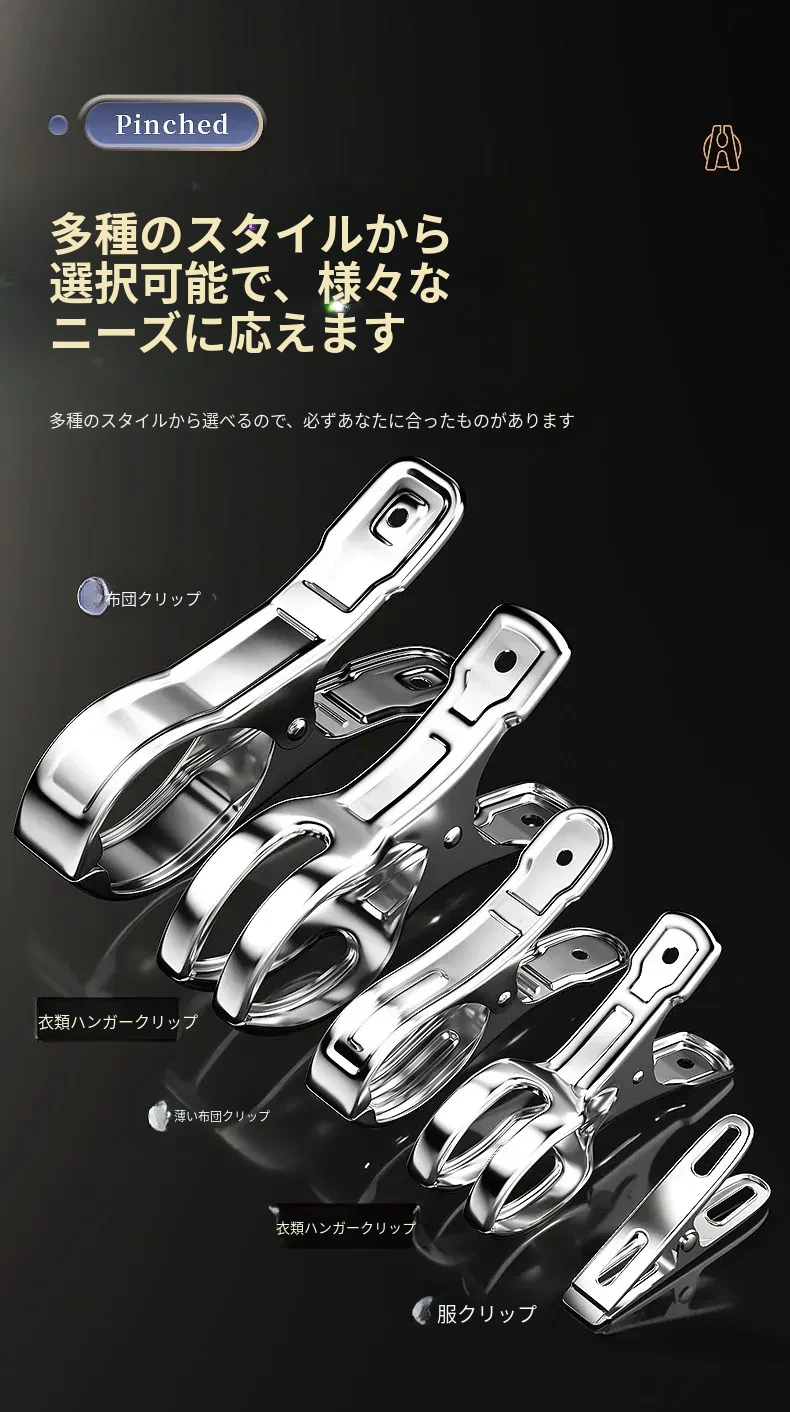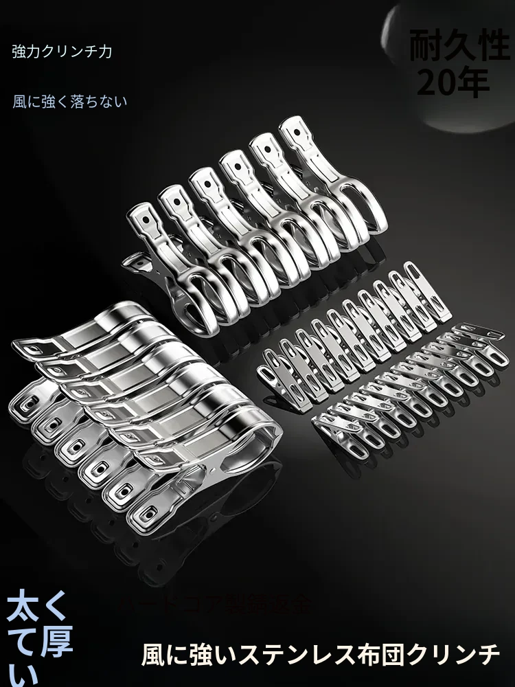 風に強いステンレス製大クリップ!洗濯物や布団をしっかり固定する万能クリップ。靴下や衣類も安心して干せる、家庭必備の便利グッズ!