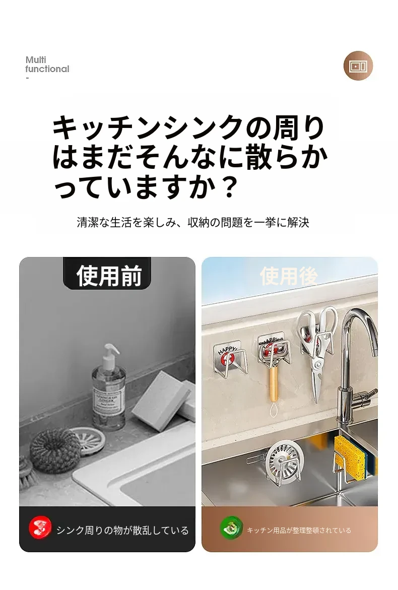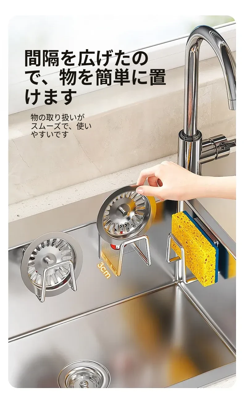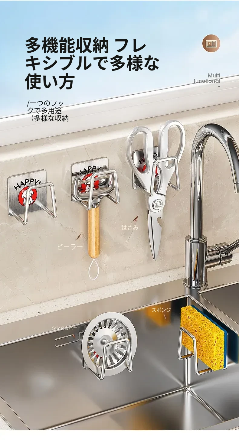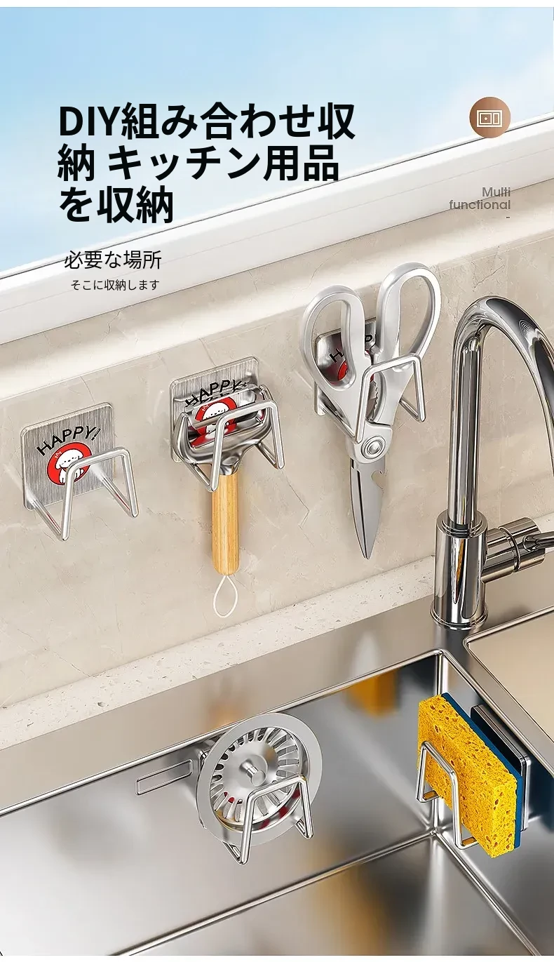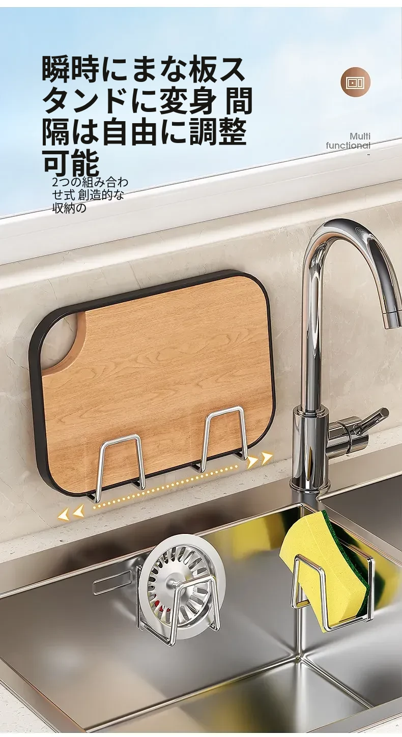 ステンレス製シンク用スポンジ水切りフック - キッチンの水槽に最適!穴あけ不要で鍋のフタや洗剤をすっきり収納できる便利グッズ!清潔感あふれるデザインで、キッチンをもっと快適に!