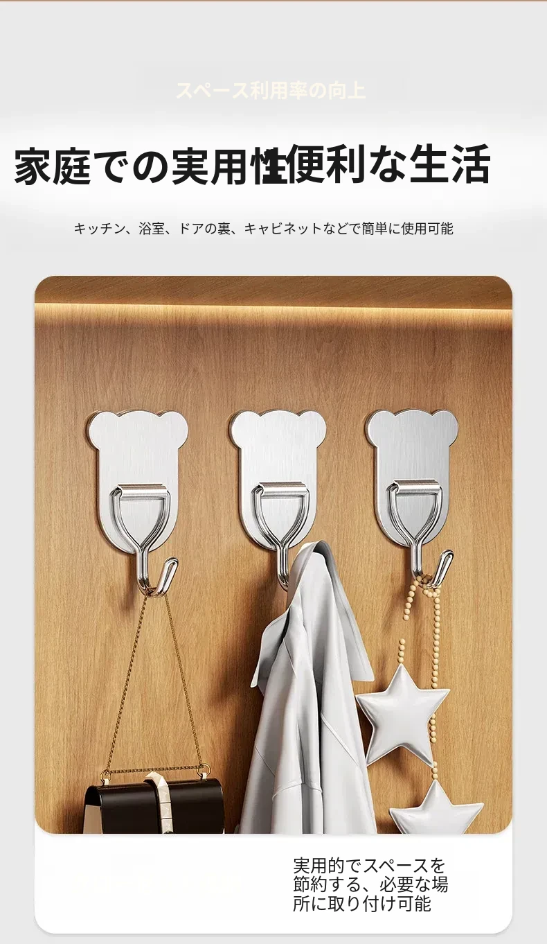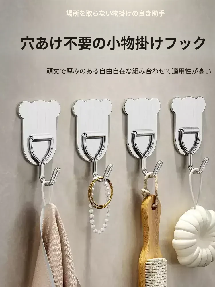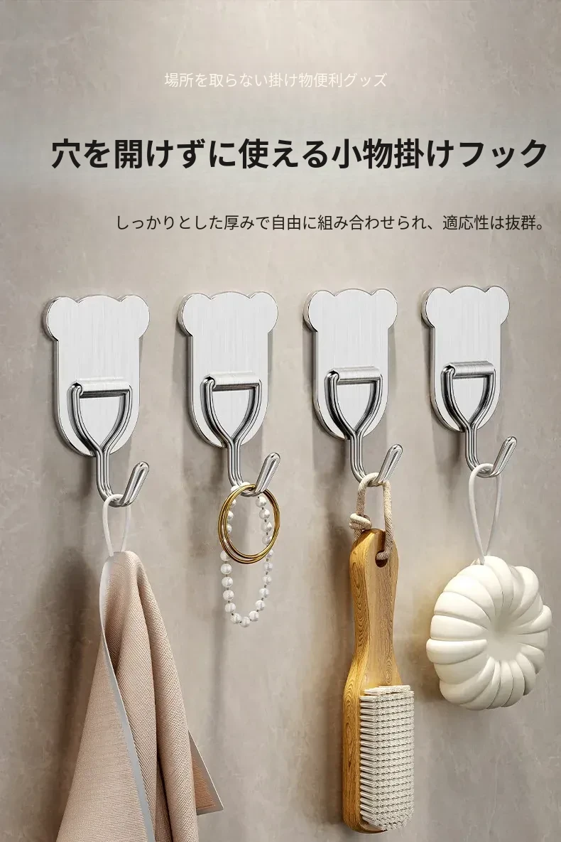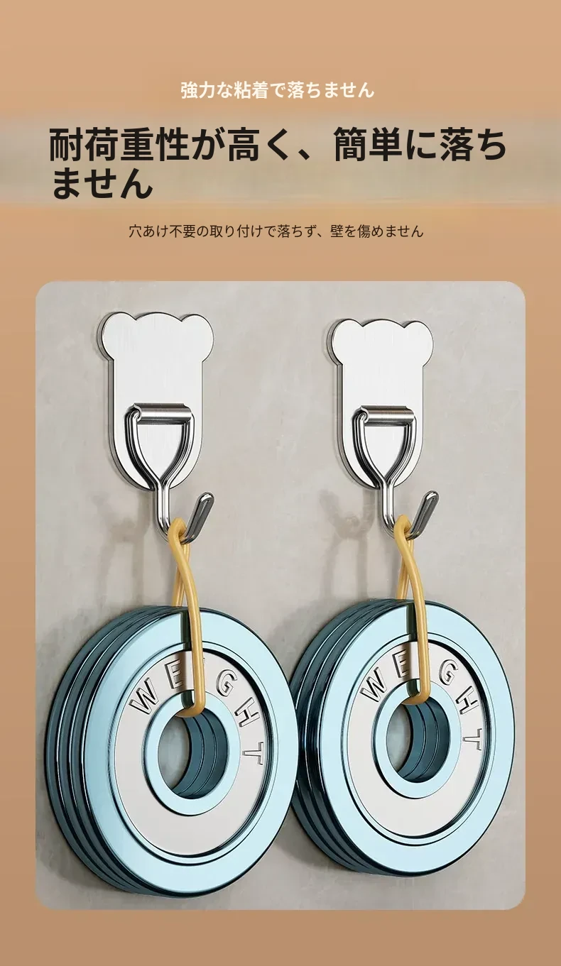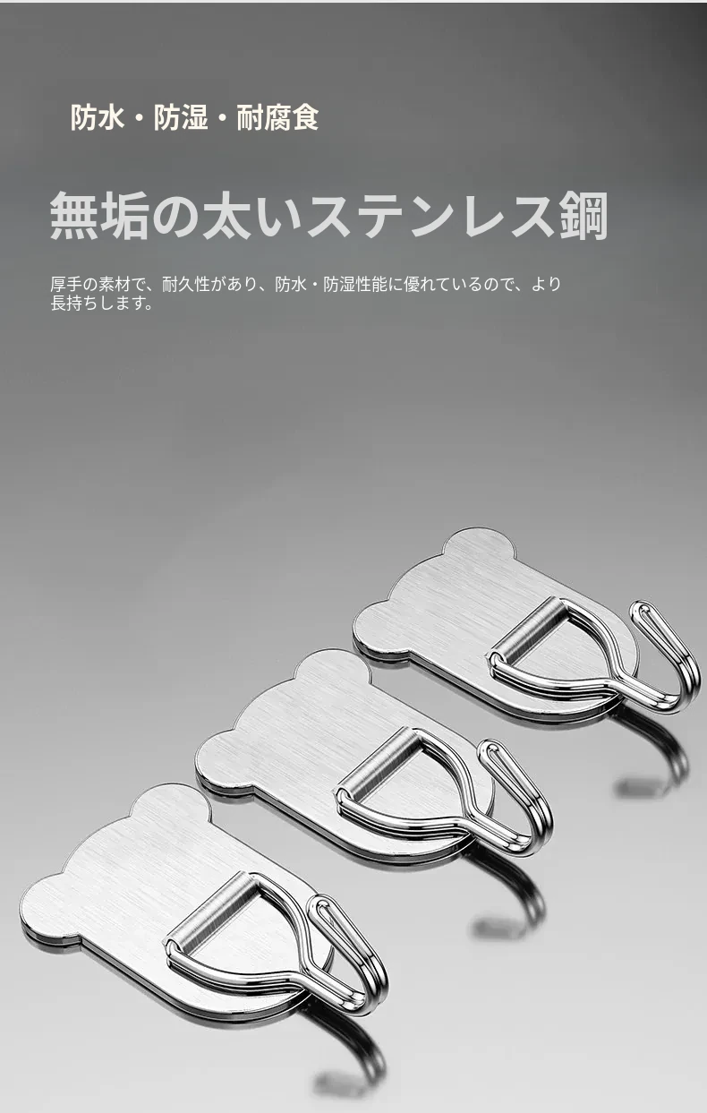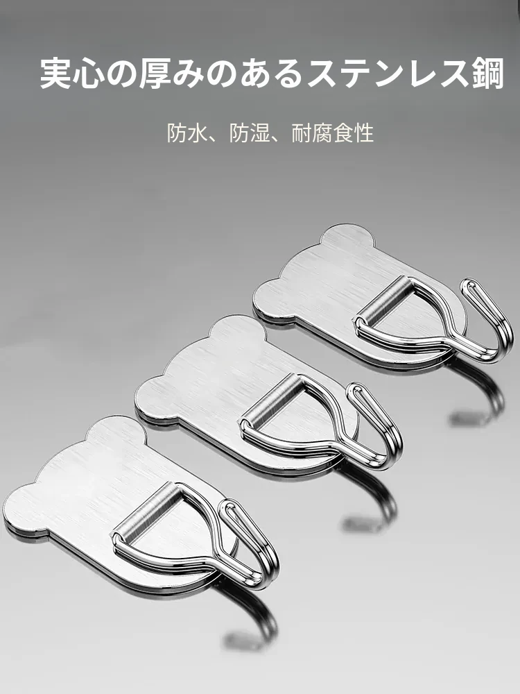 強力粘着フック【取り付け簡単】穴あけ不要!バスルームやキッチン、ドアの裏に最適。衣類やタオルをしっかりサポートするステンレス製の粘着フックで、スッキリ整理整頓!