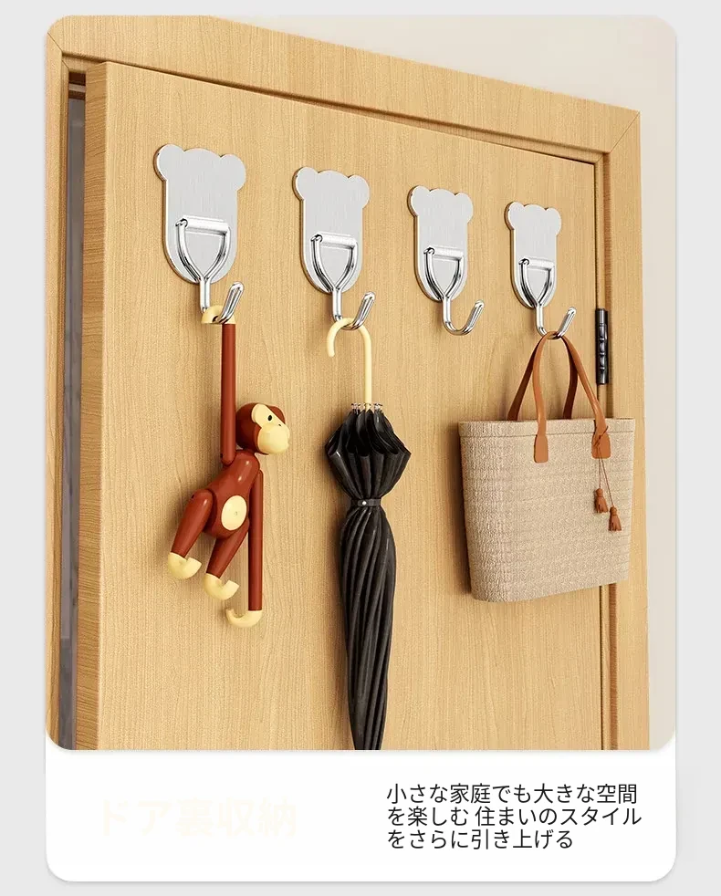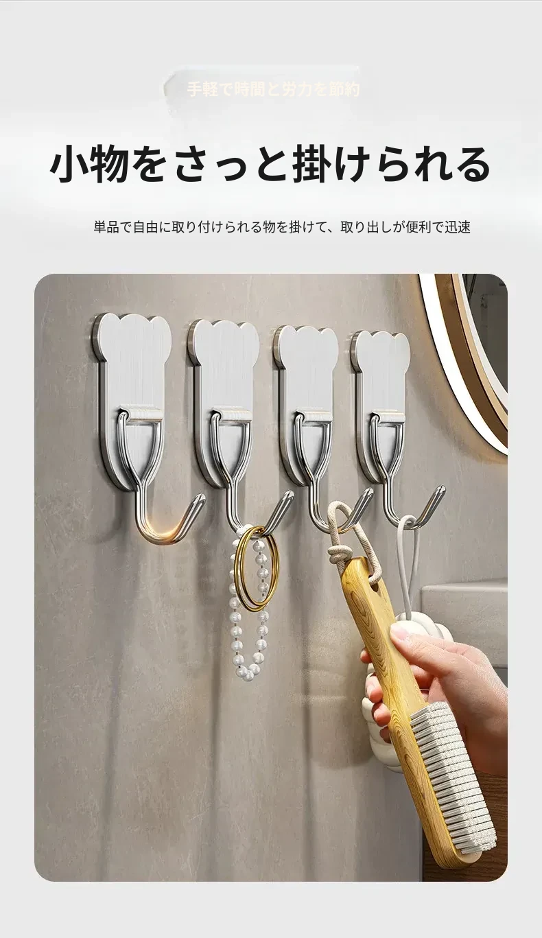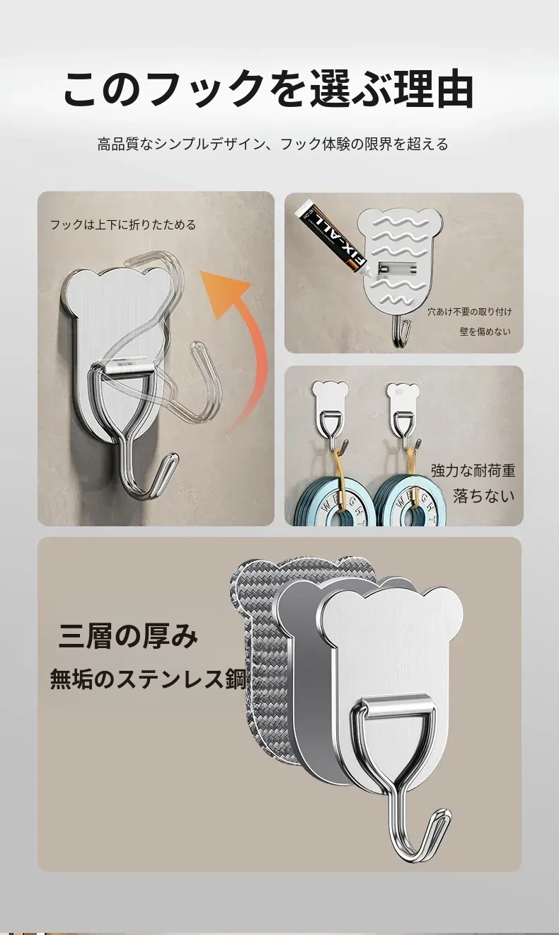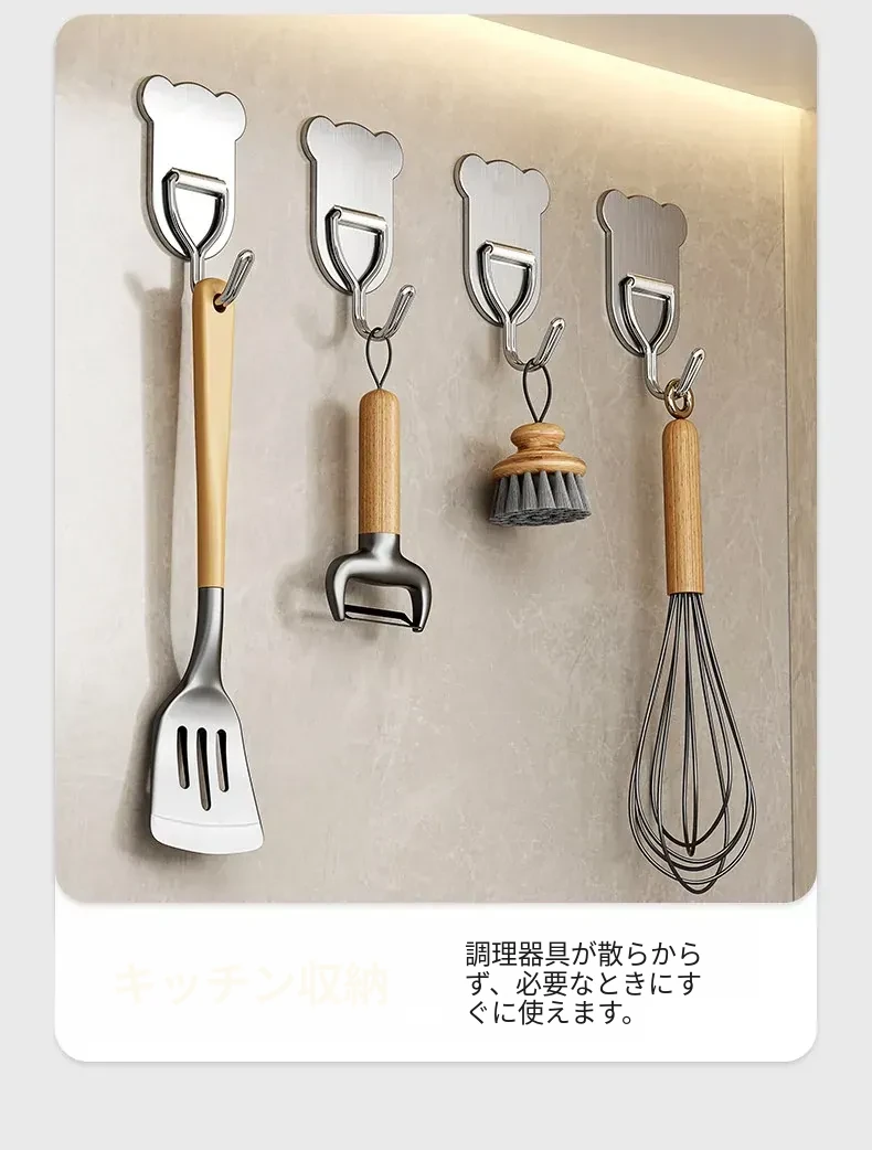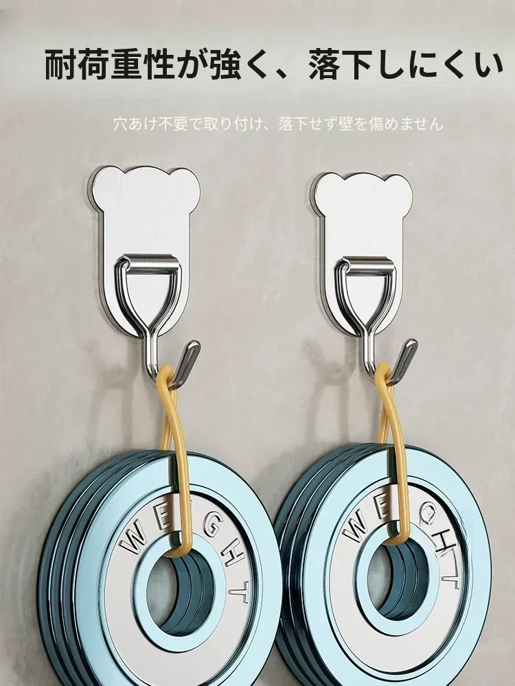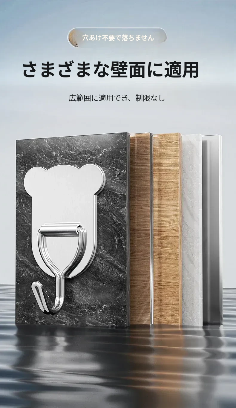 強力粘着フック【取り付け簡単】穴あけ不要!バスルームやキッチン、ドアの裏に最適。衣類やタオルをしっかりサポートするステンレス製の粘着フックで、スッキリ整理整頓!