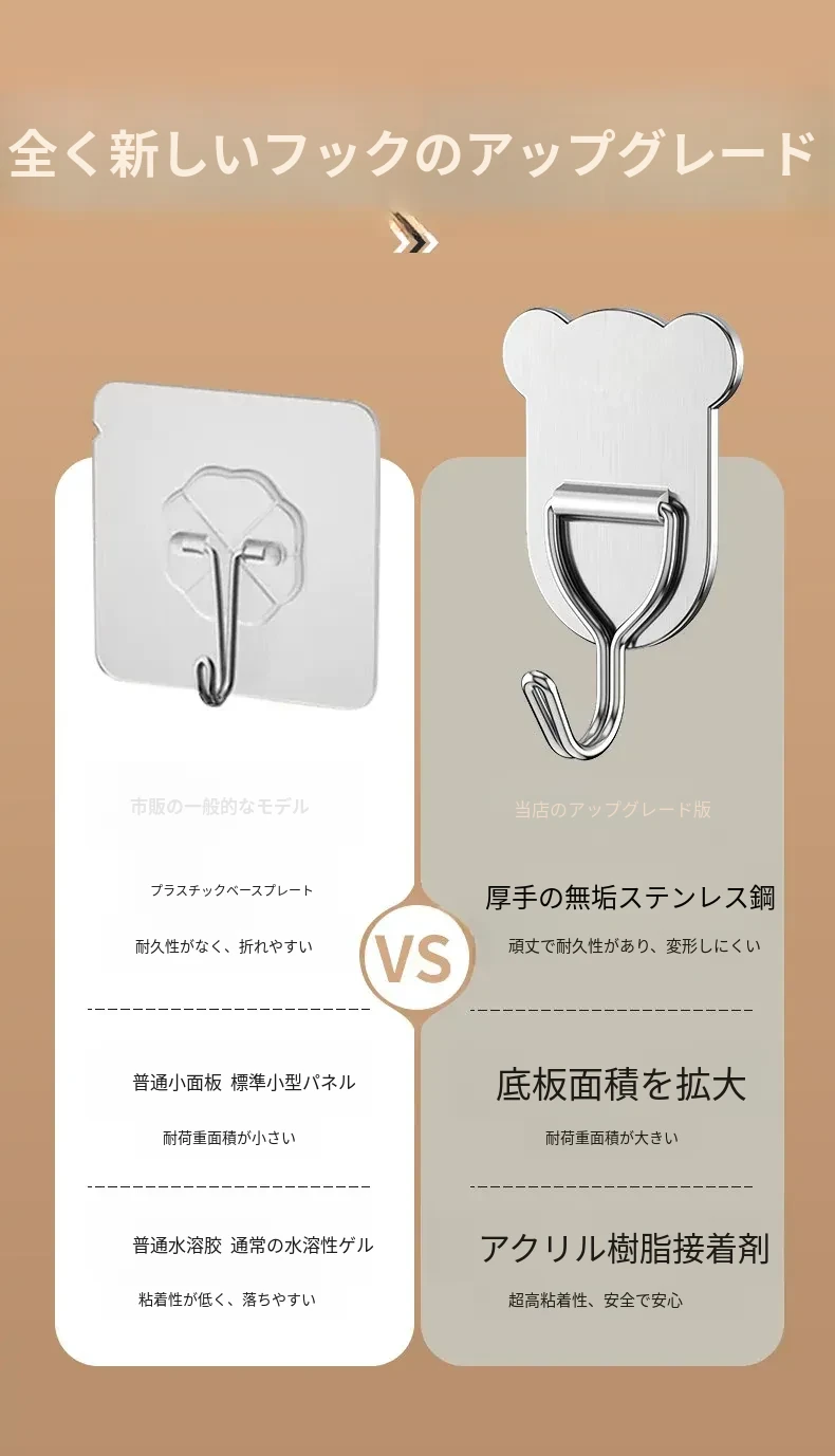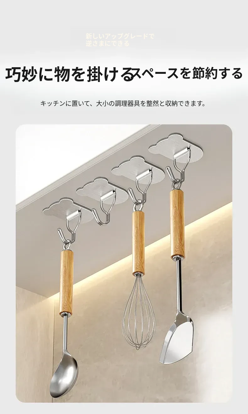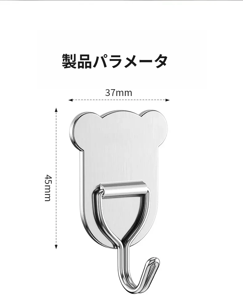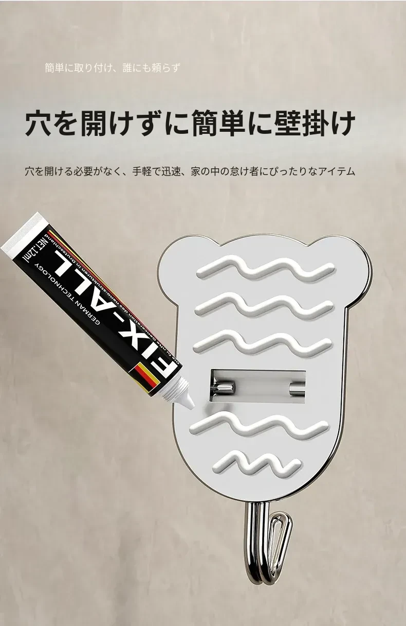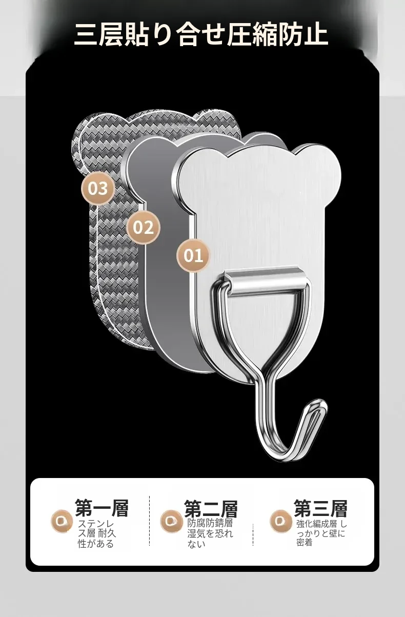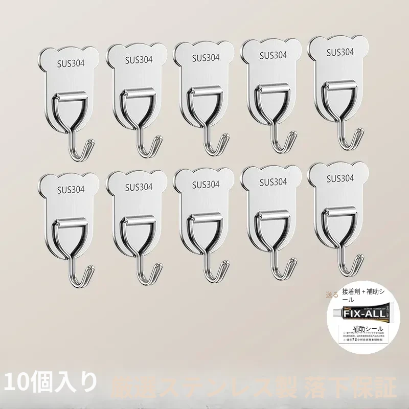 強力粘着フック【取り付け簡単】穴あけ不要!バスルームやキッチン、ドアの裏に最適。衣類やタオルをしっかりサポートするステンレス製の粘着フックで、スッキリ整理整頓!