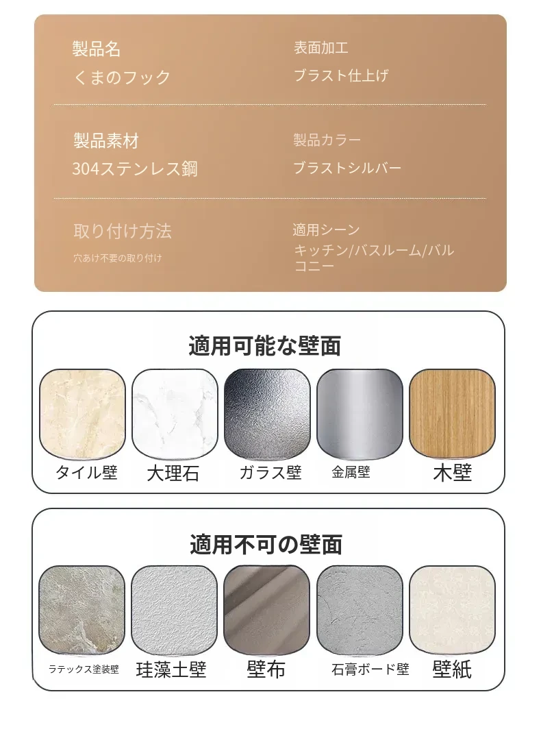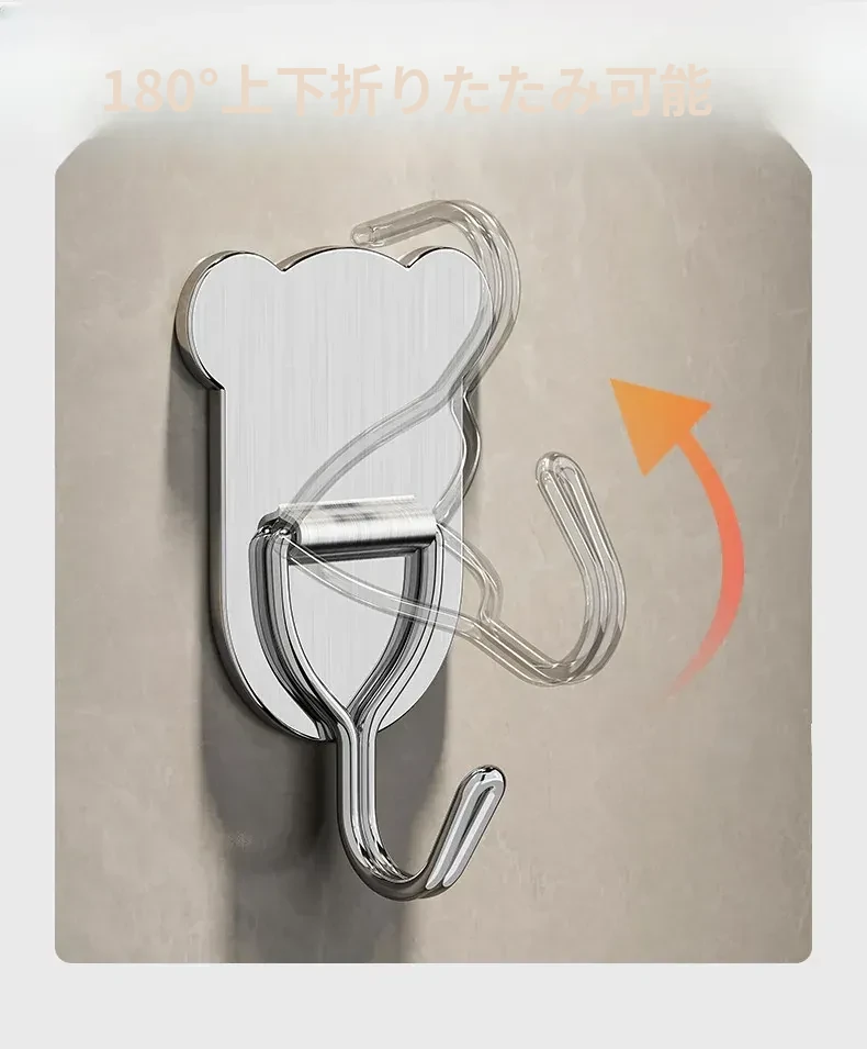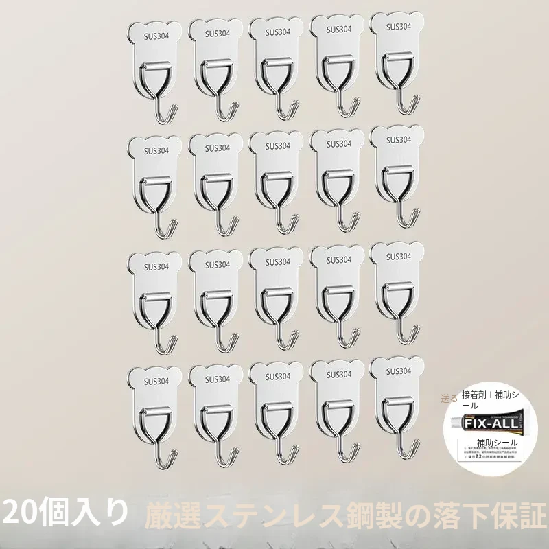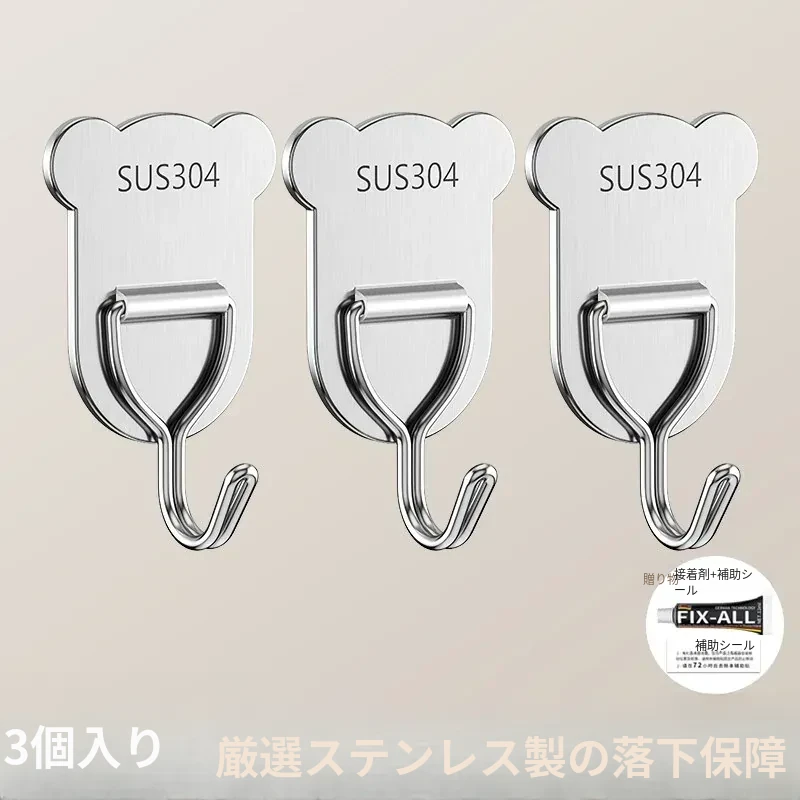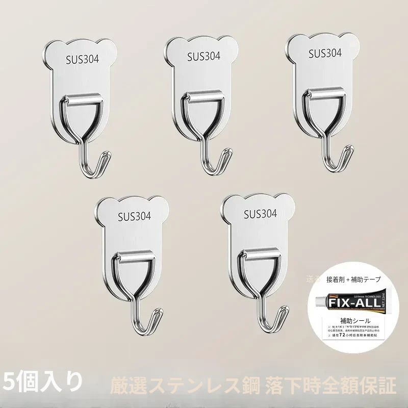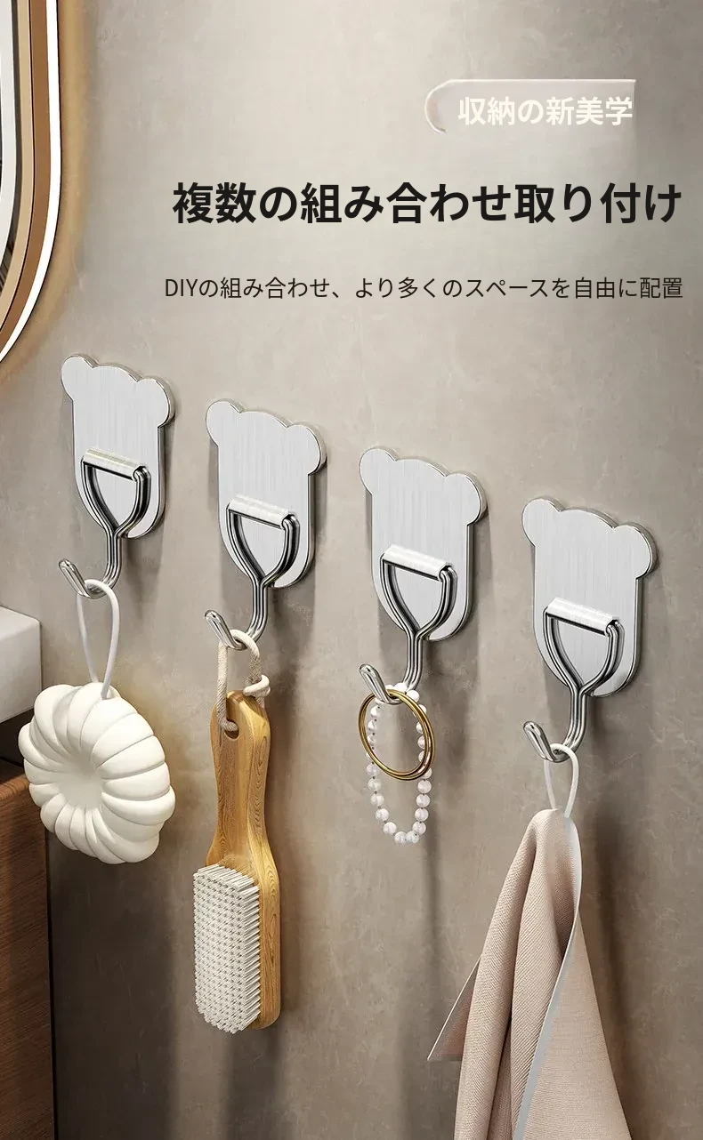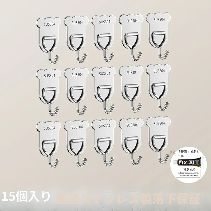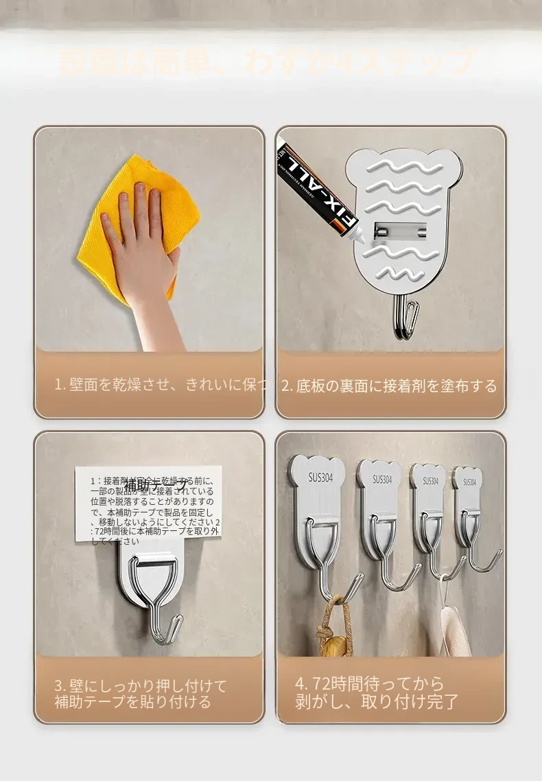 強力粘着フック【取り付け簡単】穴あけ不要!バスルームやキッチン、ドアの裏に最適。衣類やタオルをしっかりサポートするステンレス製の粘着フックで、スッキリ整理整頓!