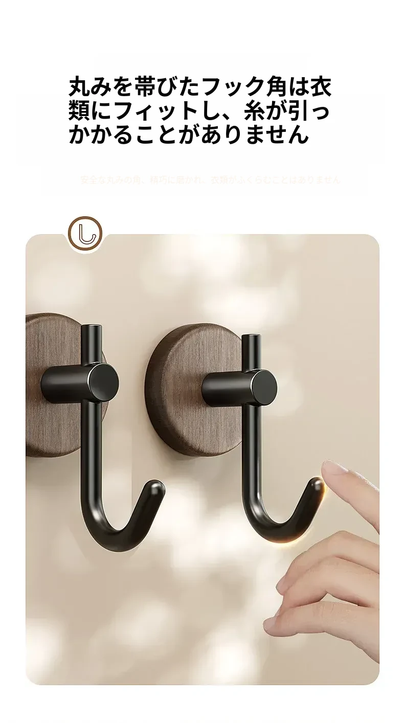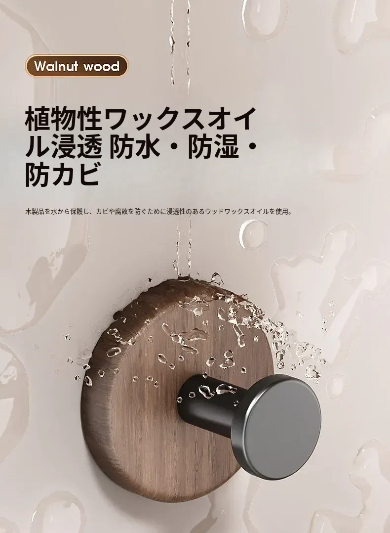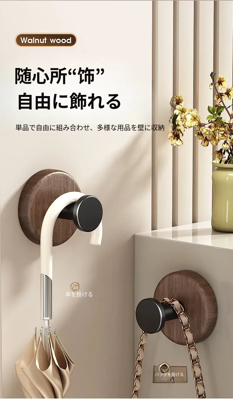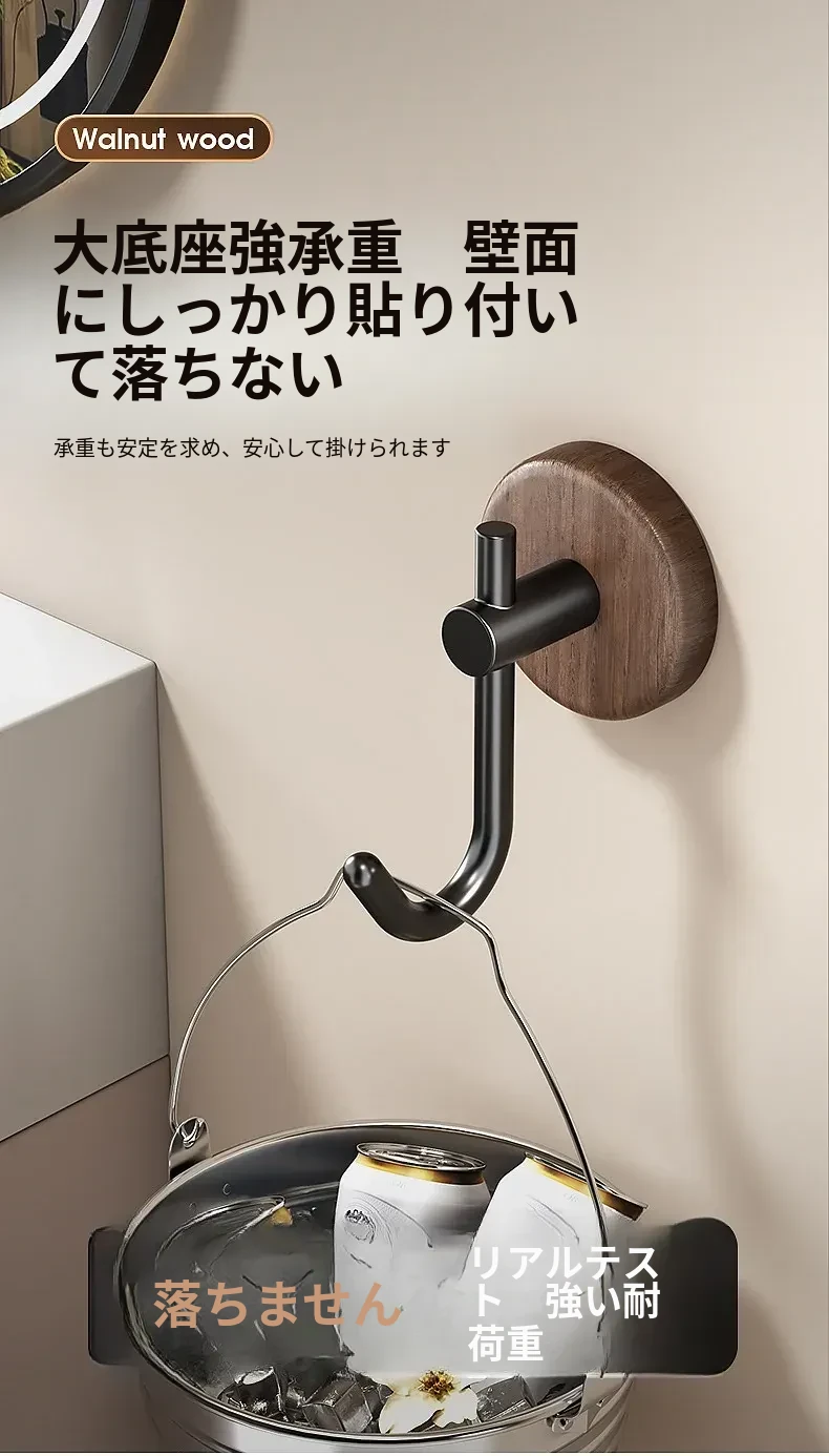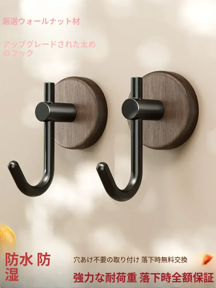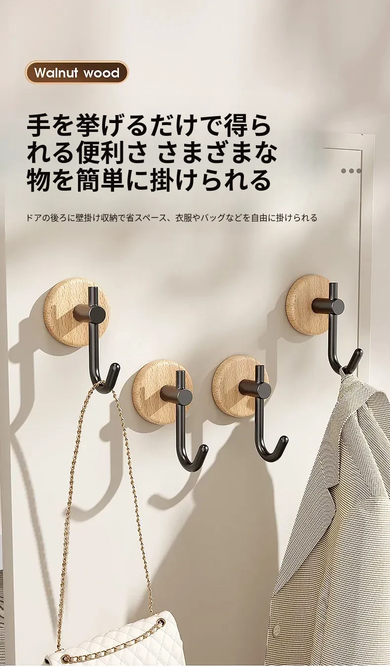 強力粘着フック - ウォールマウントの無穴胡桃木製フック!バスルームやドアの裏に最適、衣類や帽子をしっかり支える便利アイテム。おしゃれで機能的な収納を実現します!