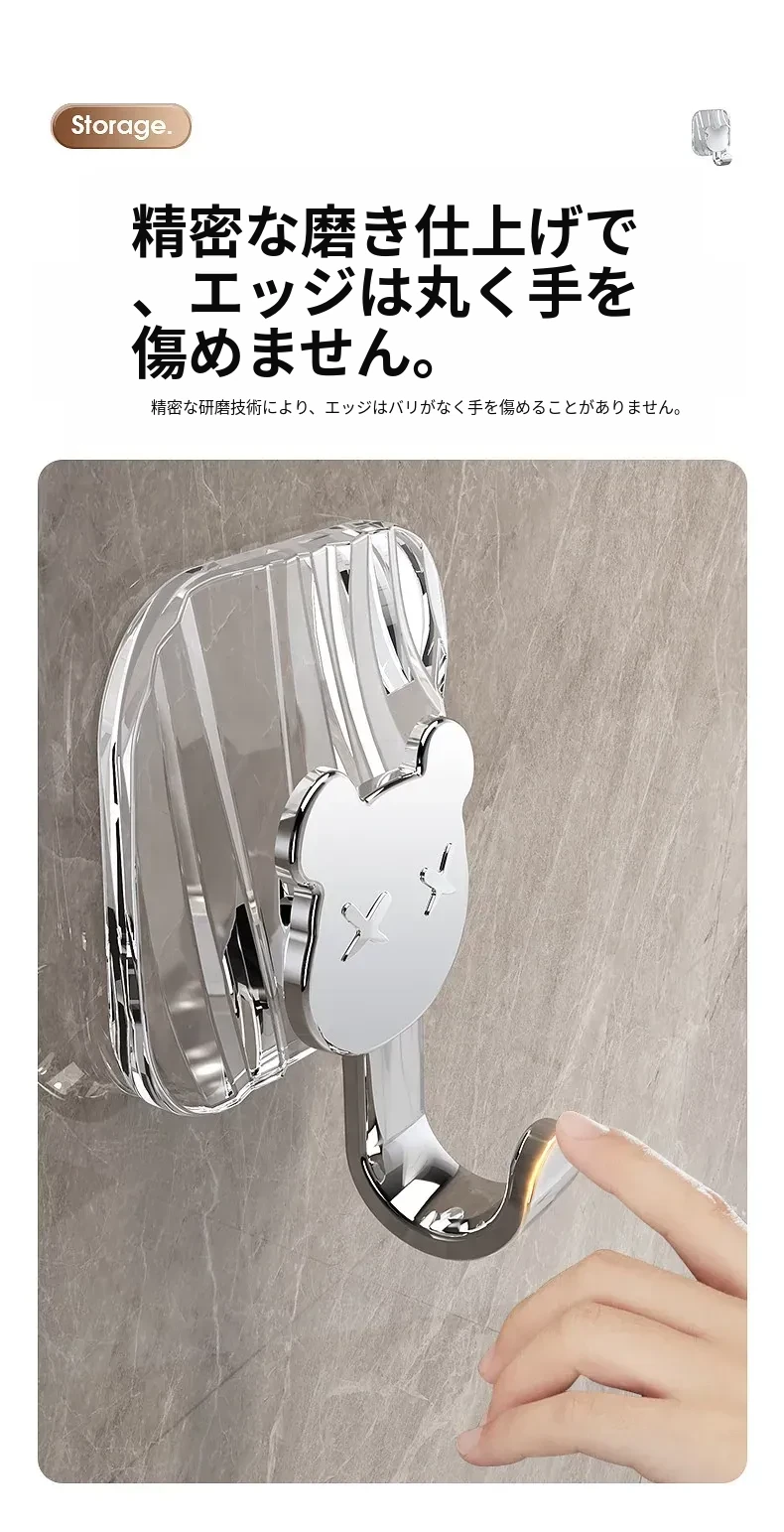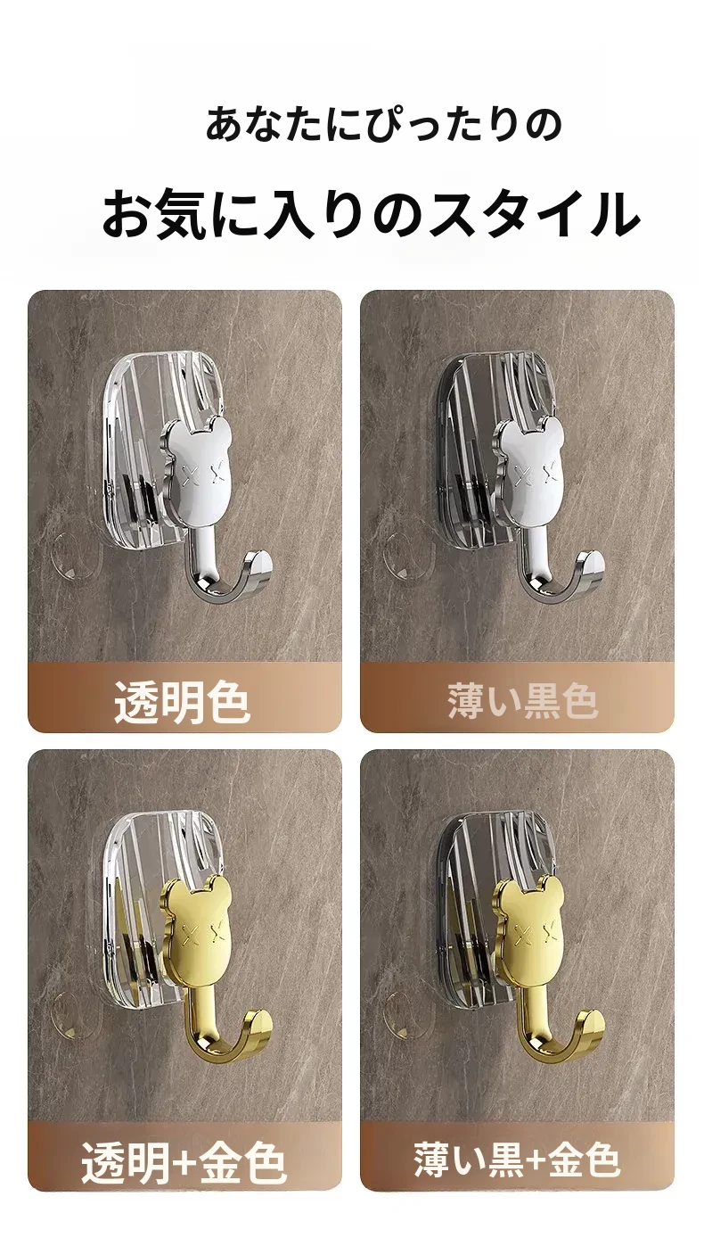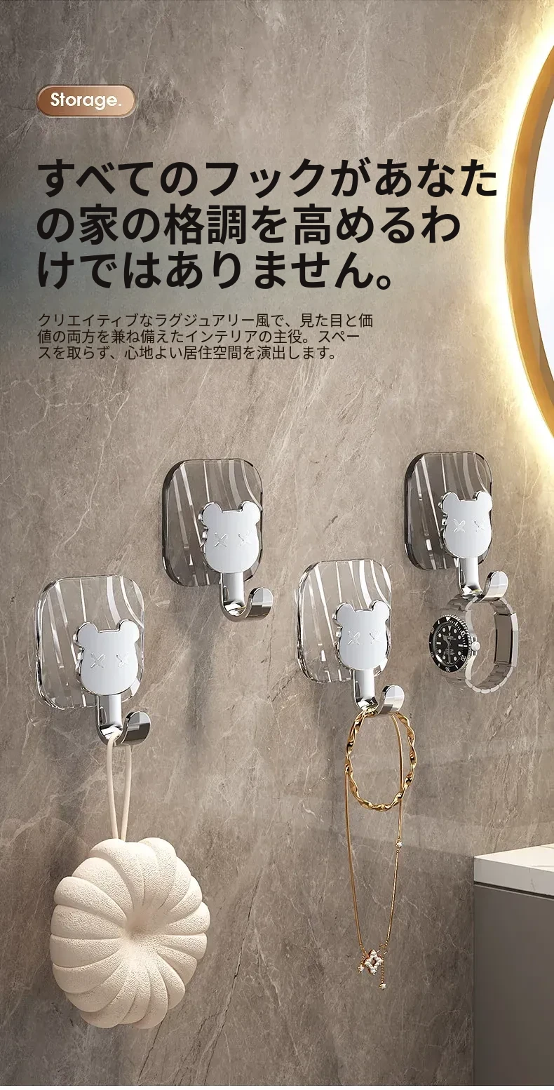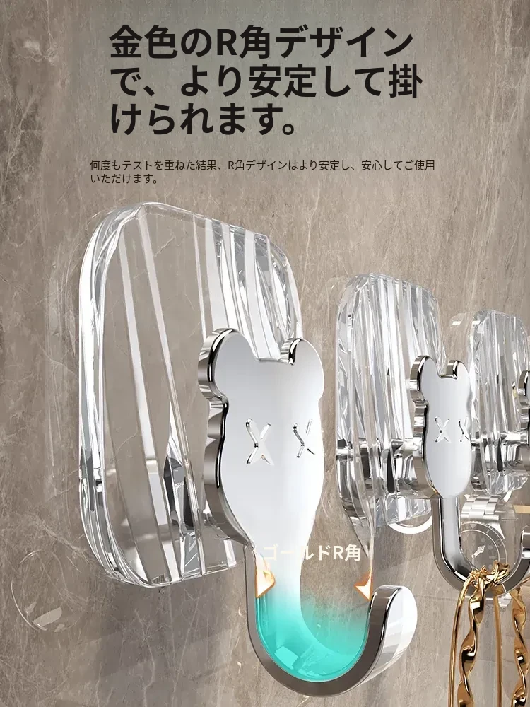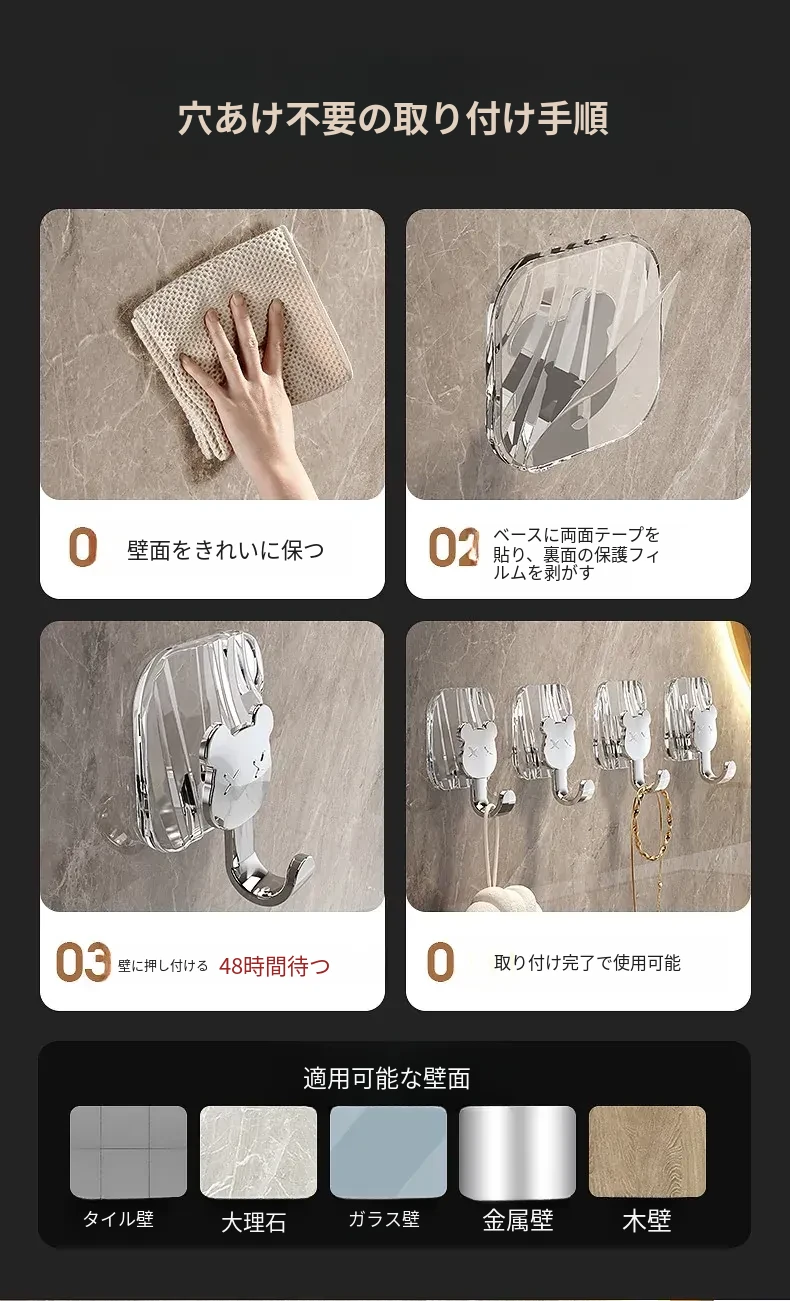 軽やかな高級感!強力耐荷重・穴あけ不要の粘着フック。バスルームやトイレの壁、ドア裏に無痕で衣類やタオルをスタイリッシュに収納!