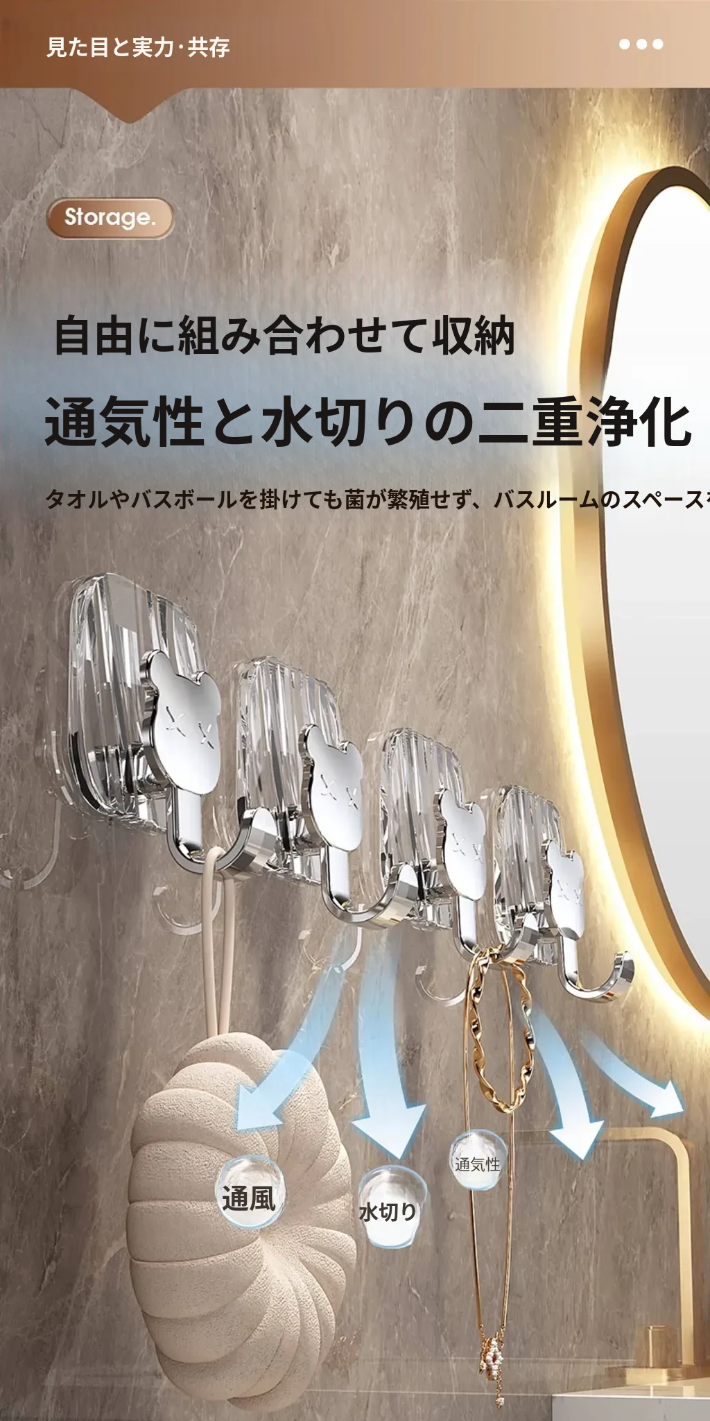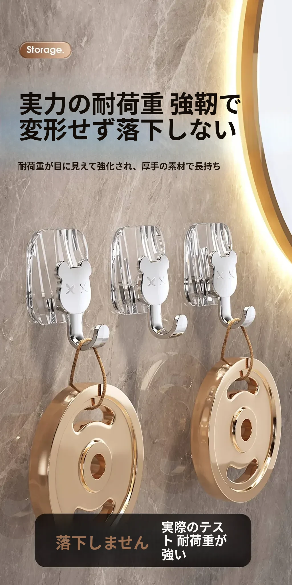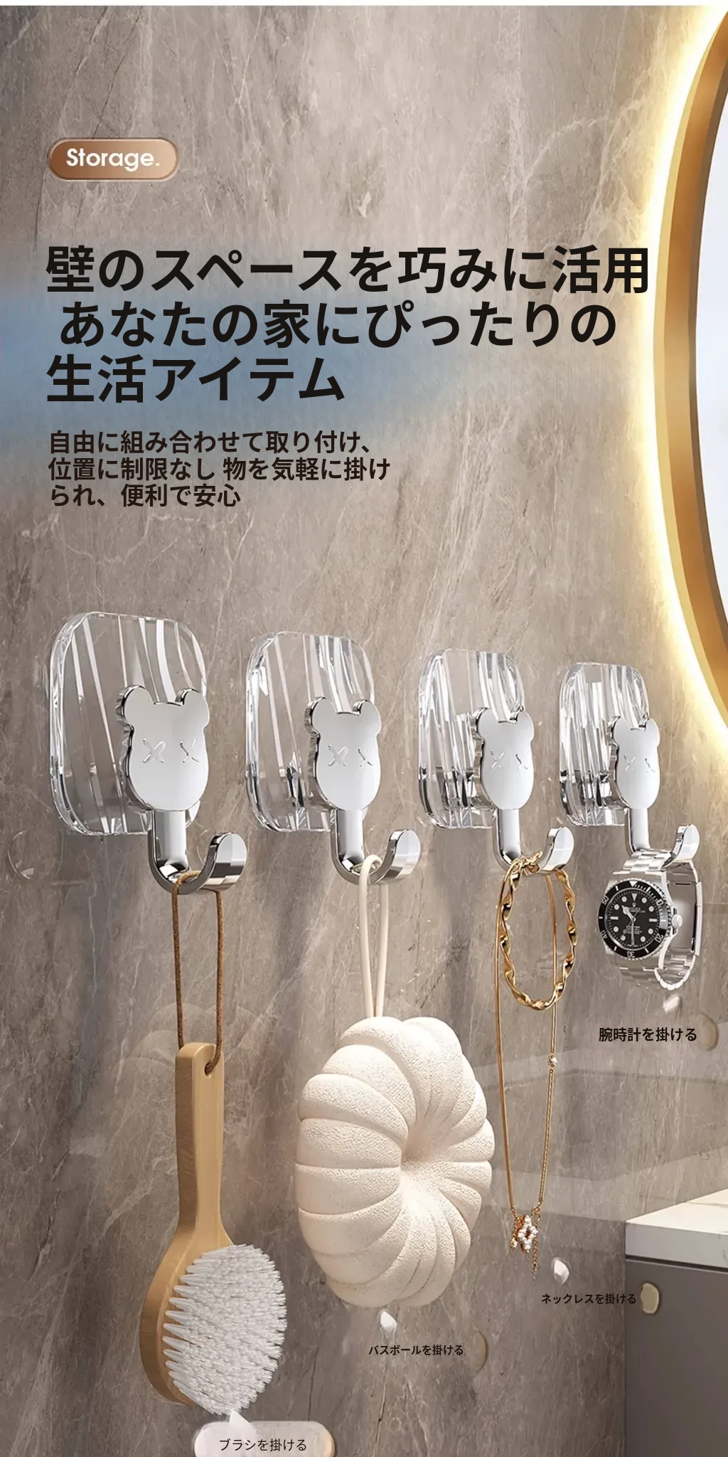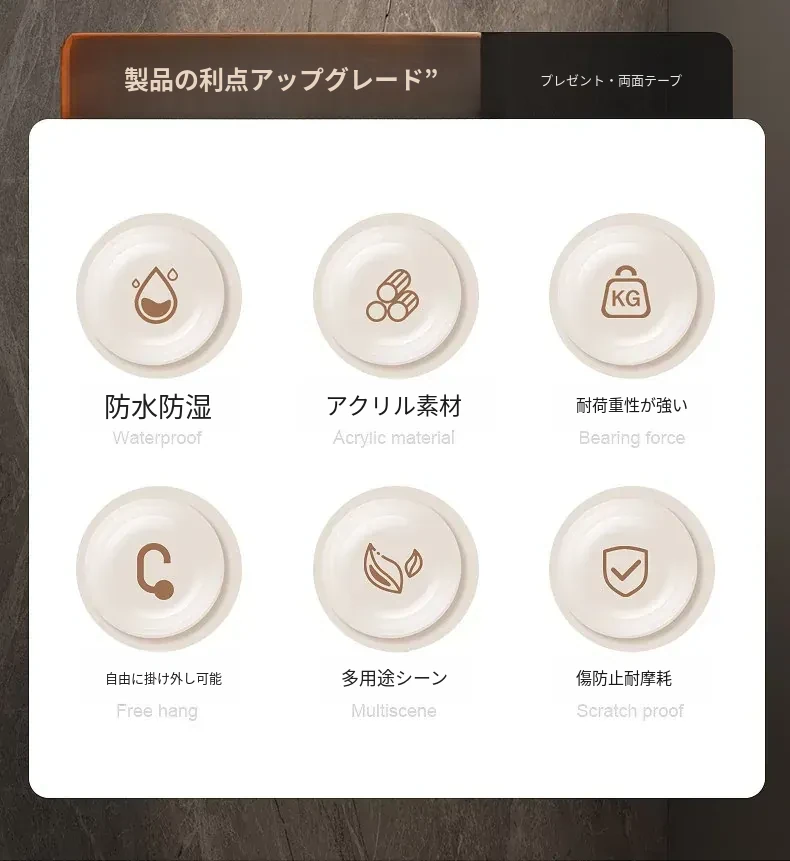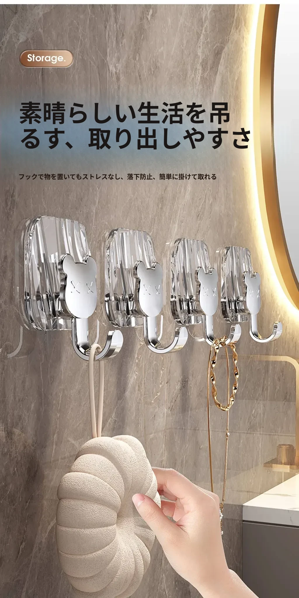 軽やかな高級感!強力耐荷重・穴あけ不要の粘着フック。バスルームやトイレの壁、ドア裏に無痕で衣類やタオルをスタイリッシュに収納!