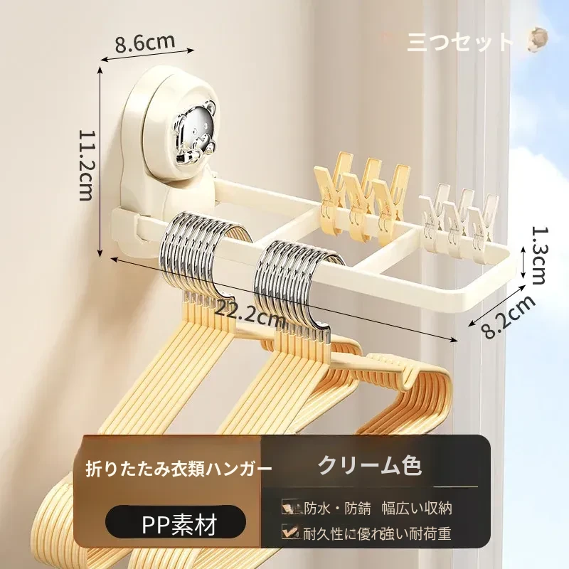 クリーム色 - 吸盤折りたたみ衣類ハンガー【3個入り】