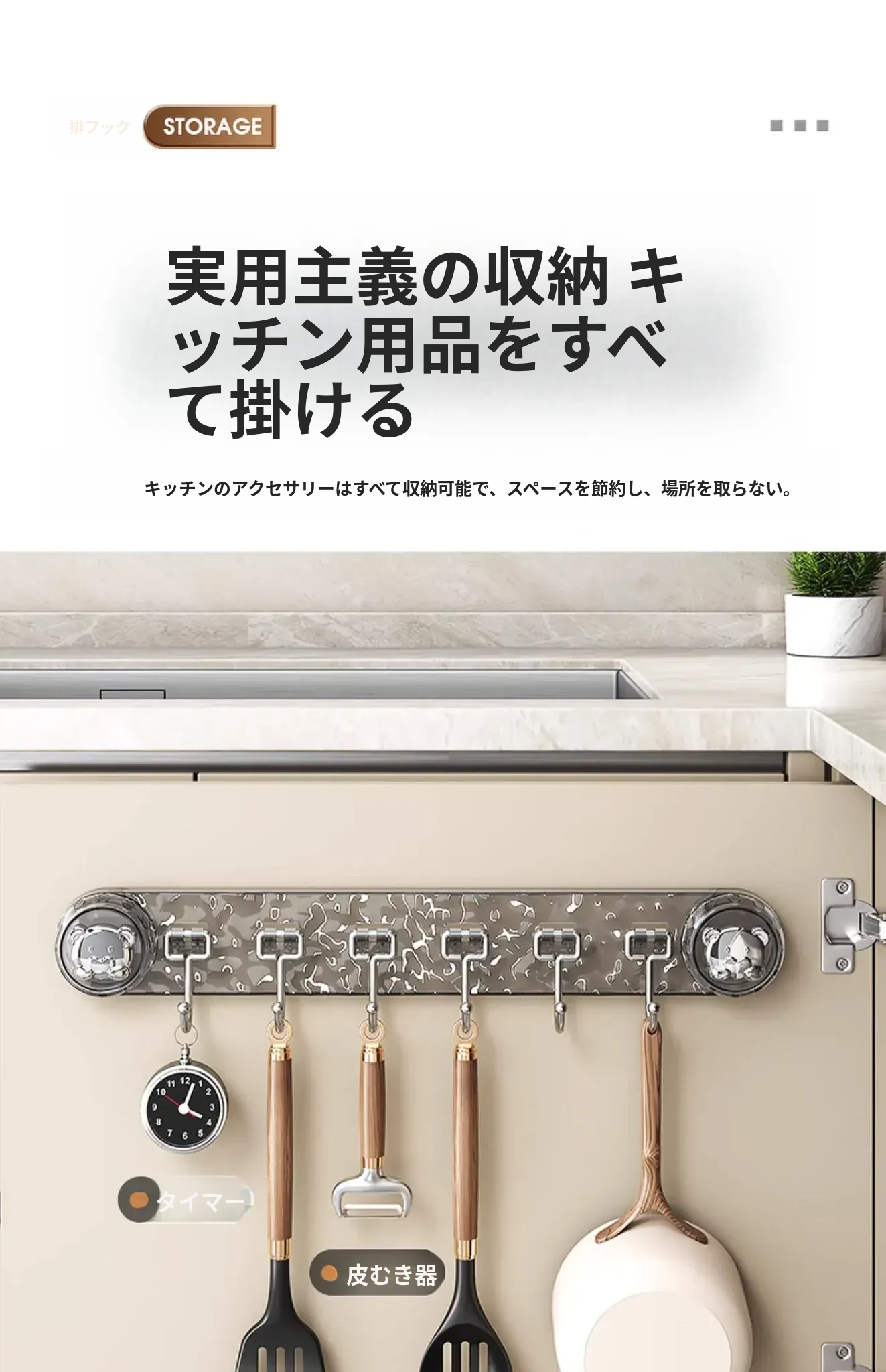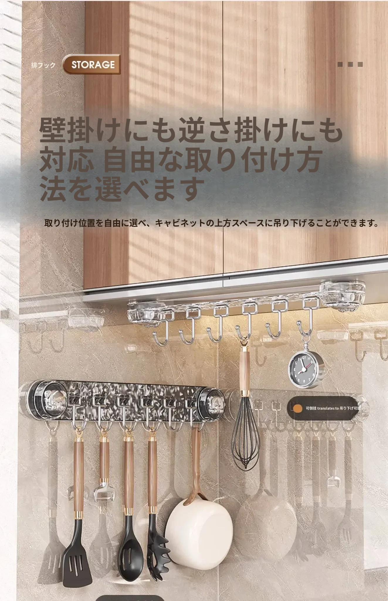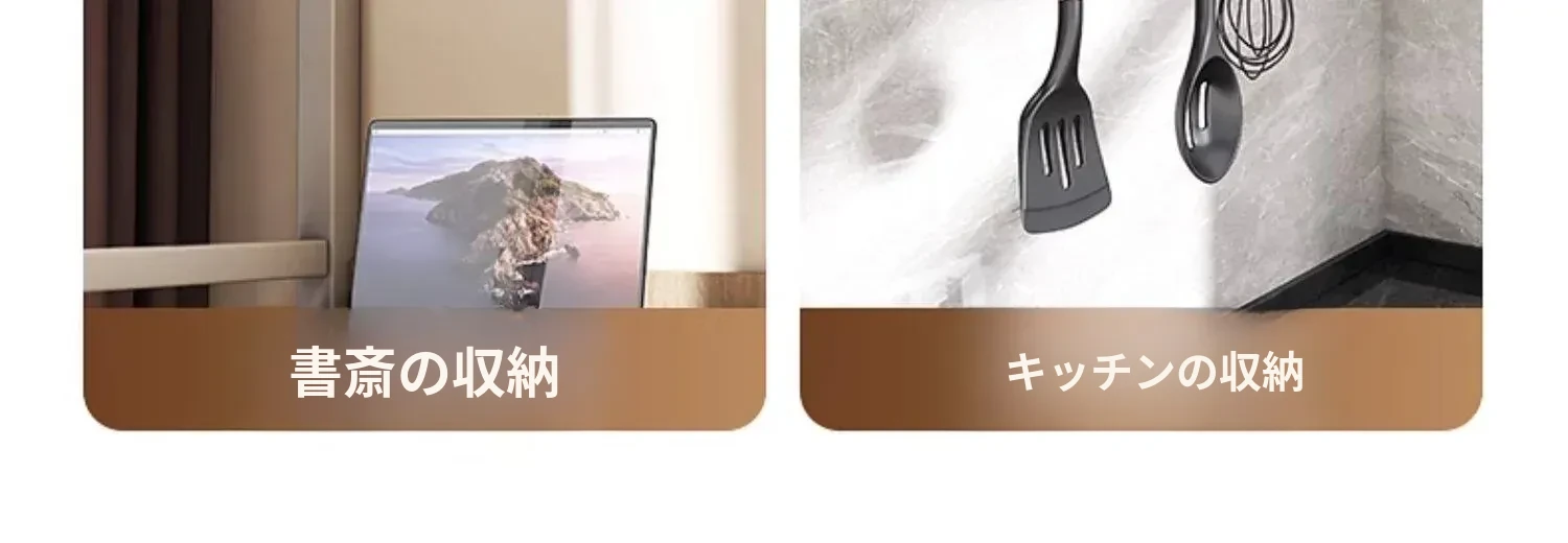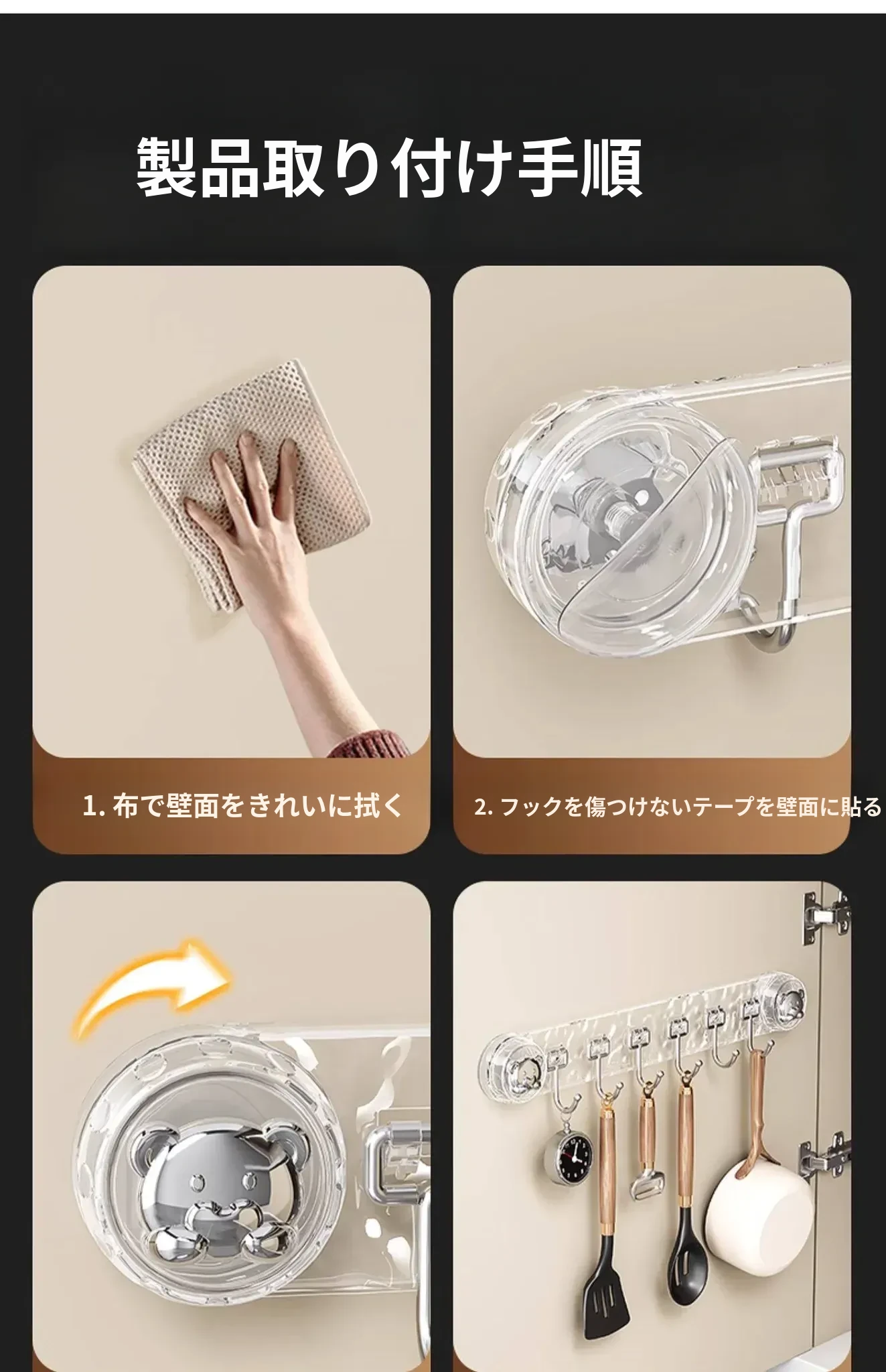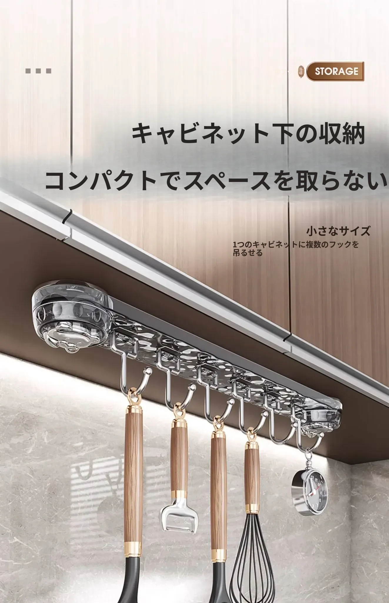 吸盤式キッチンフック - 穴あけ不要で簡単取り付け!スプーンやヘラをスッキリ収納できる、キッチンキャビネット内側用の便利な収納ラック。スペースを有効活用し、料理をもっと楽しく!