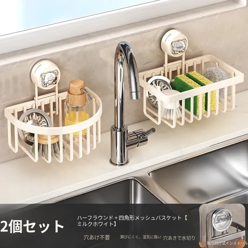 ミルキーホワイト・吸盤水切りバスケット【スクエア+ハーフサークル】