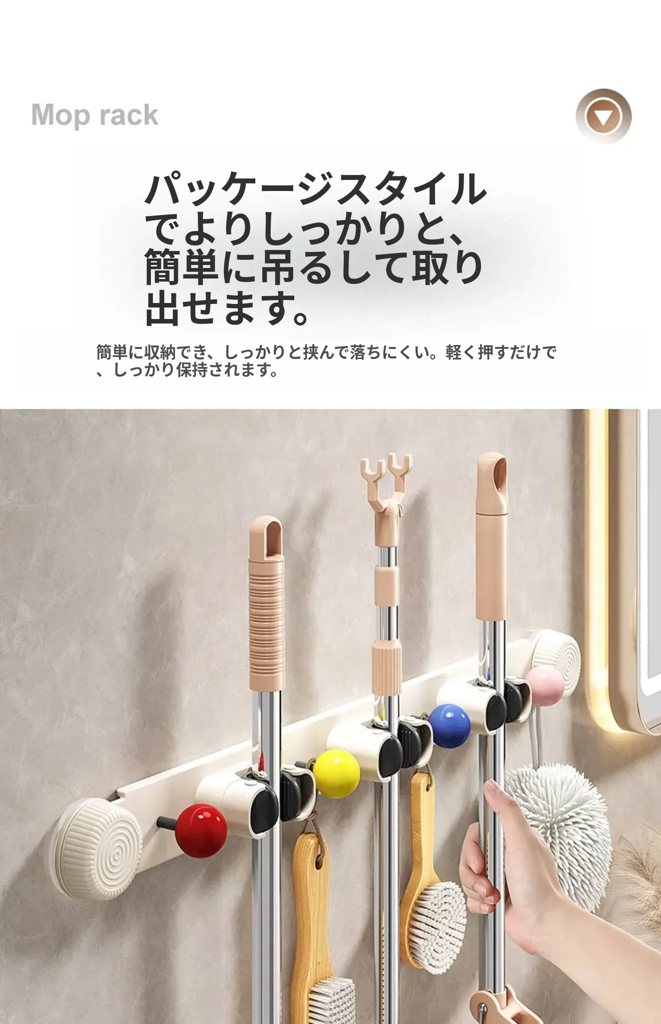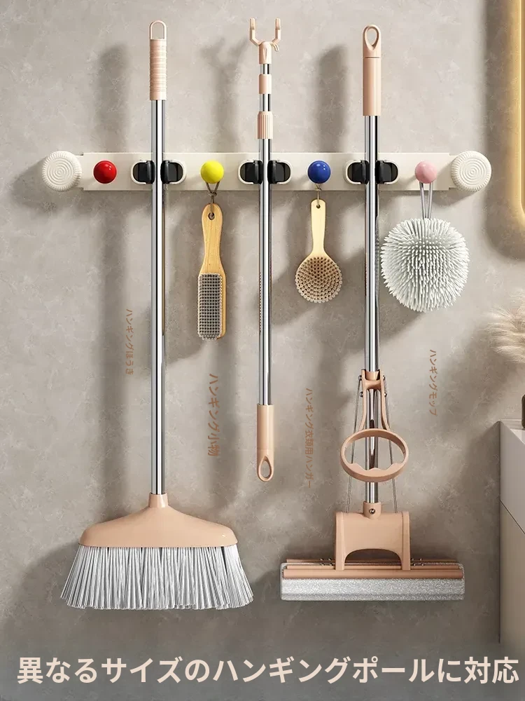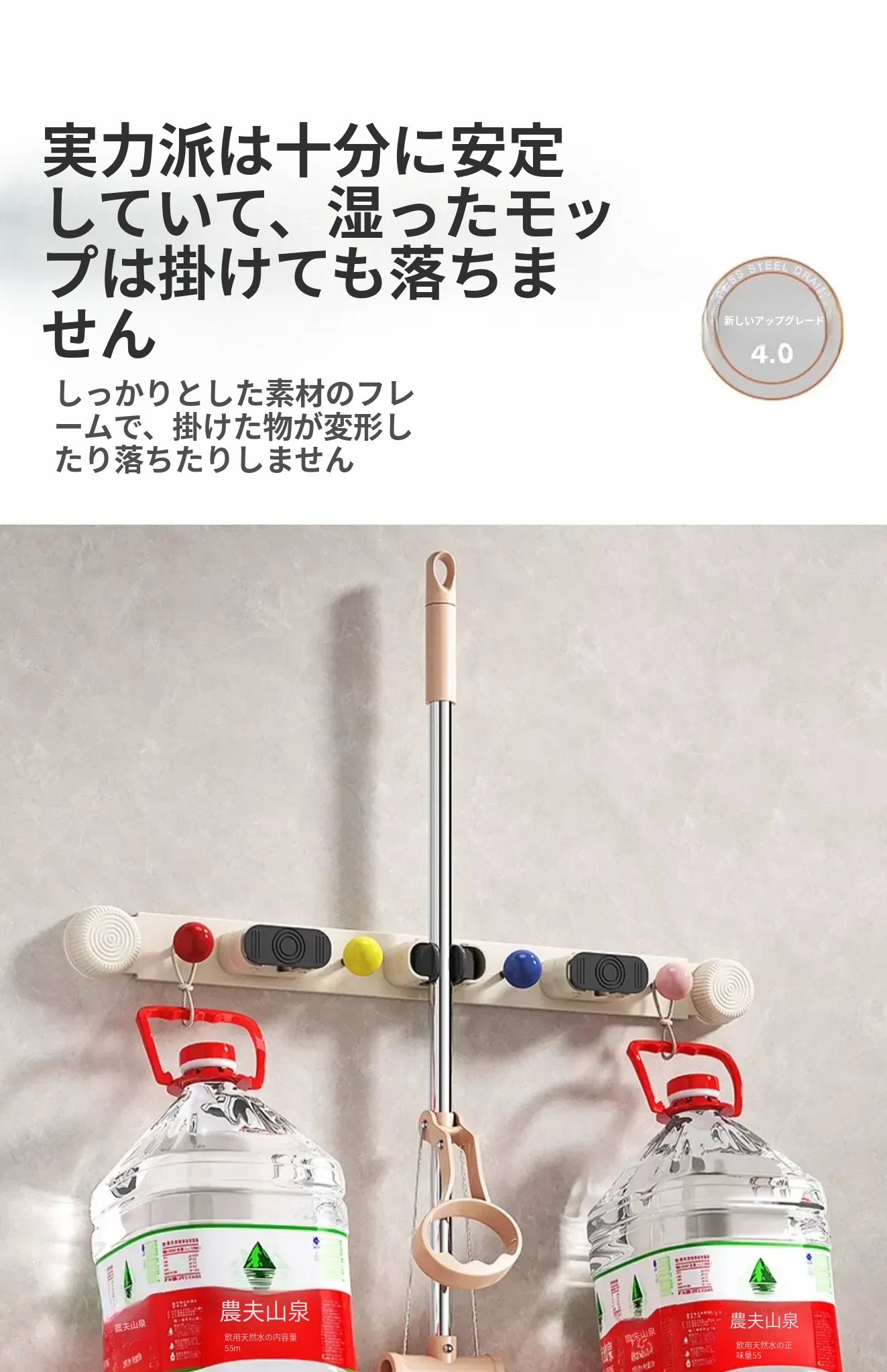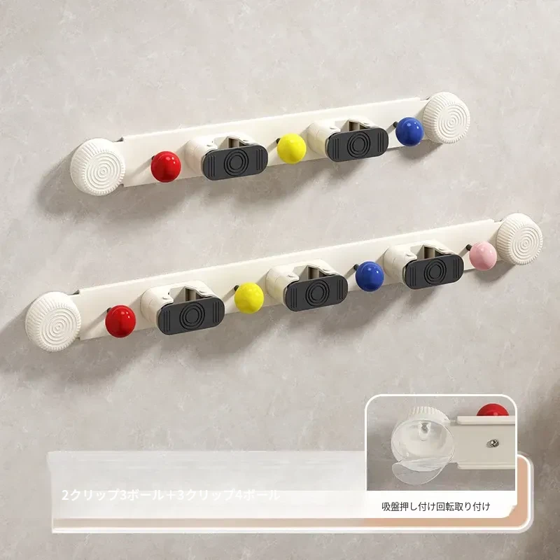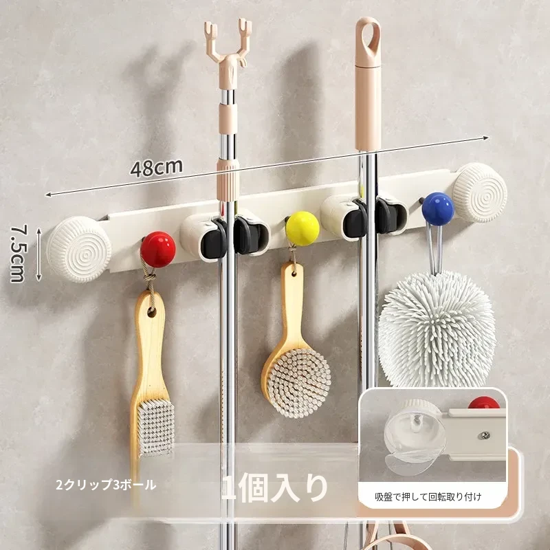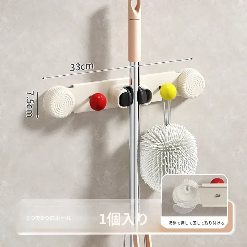 吸盤モップ壁掛けクリップ - 穴を開けずに簡単取り付け!バスルームやトイレの掃除道具をすっきり収納できる、便利なフック付きの固定ラック。お掃除がもっと楽しくなるアイテムです!