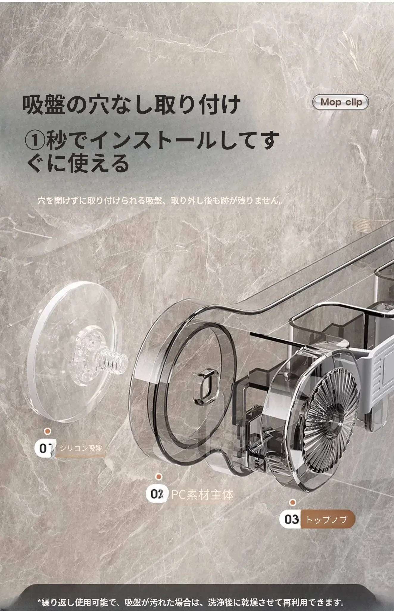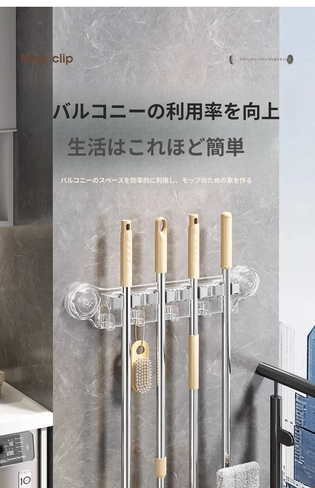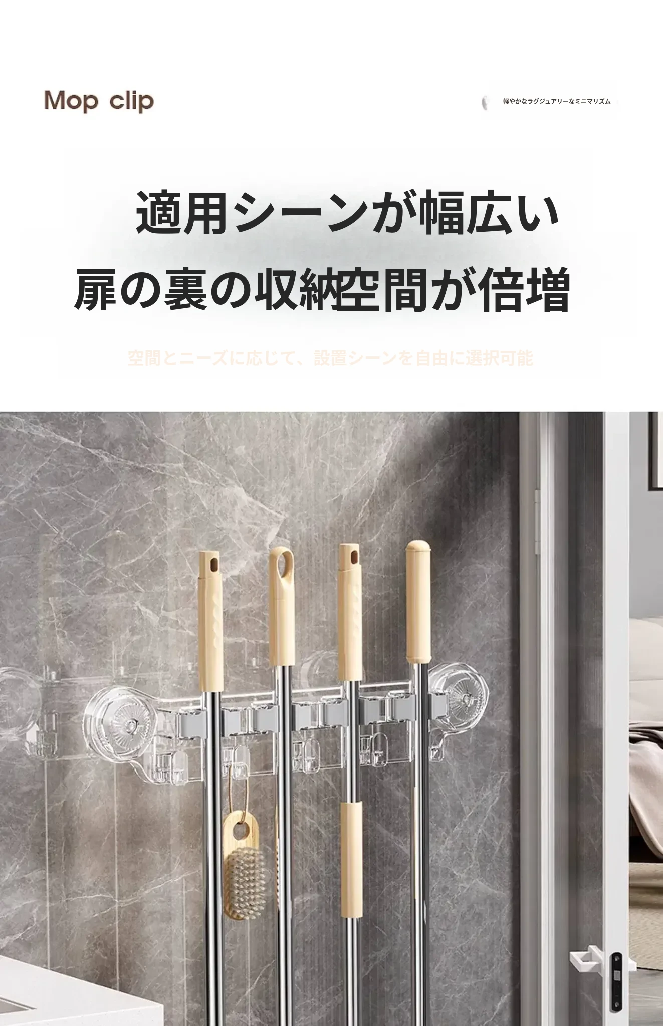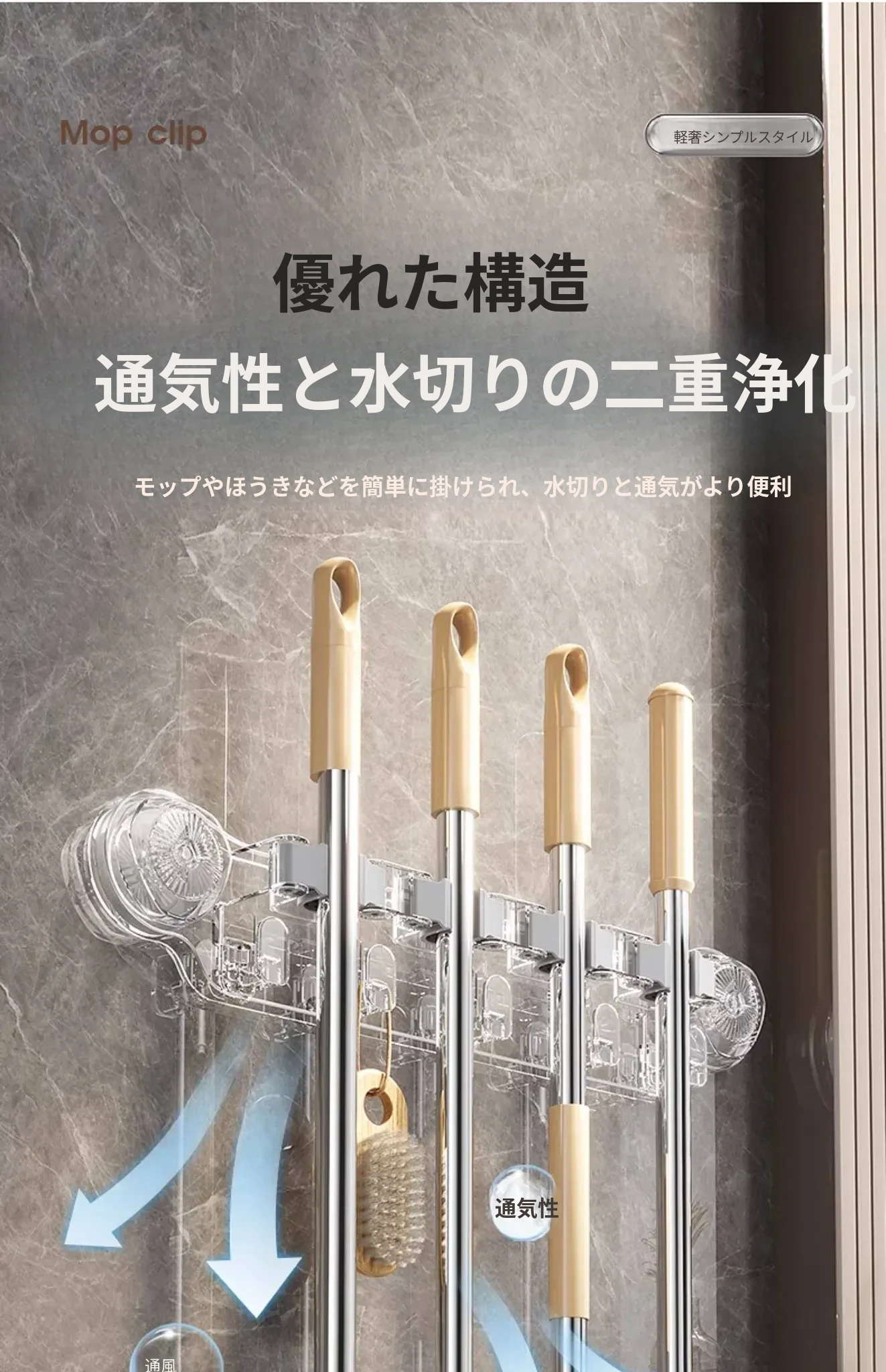 吸盤式モップ壁掛けクリップ、穴あけ不要の掃除道具!便利なモップホルダーで、トイレやバスルームの収納をスマートに!おしゃれで実用的な掃除用具ラックで、スペースを有効活用しましょう!