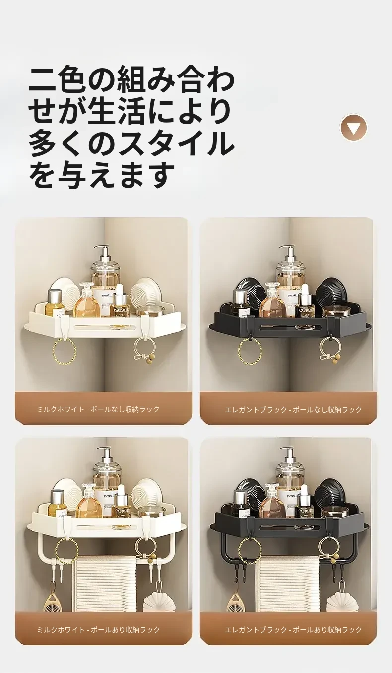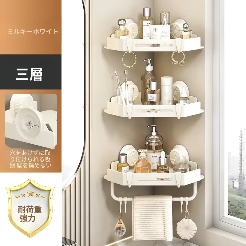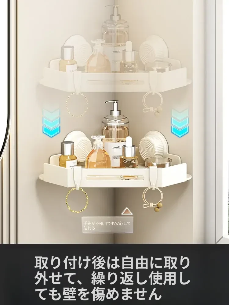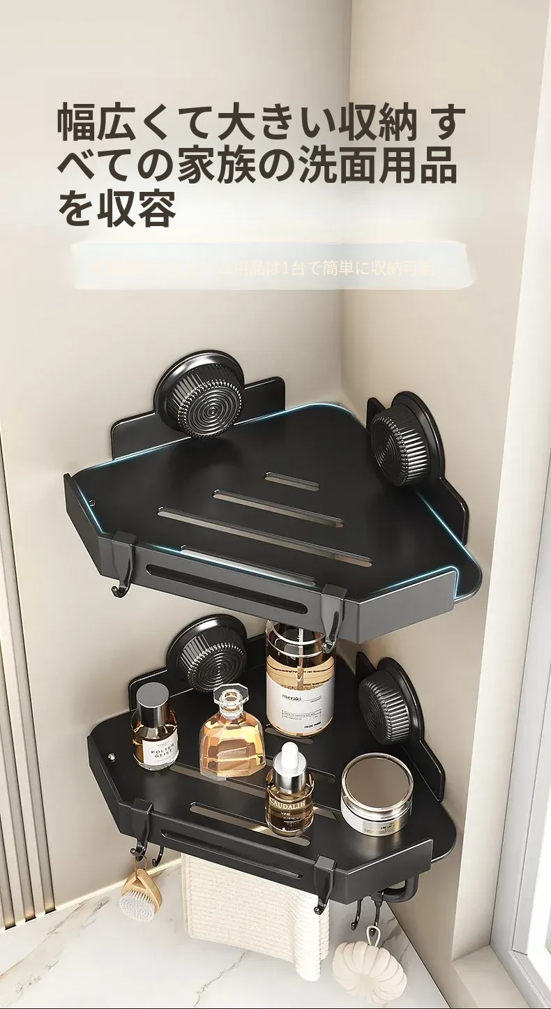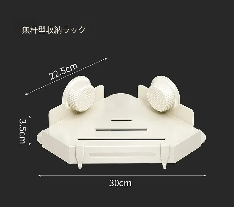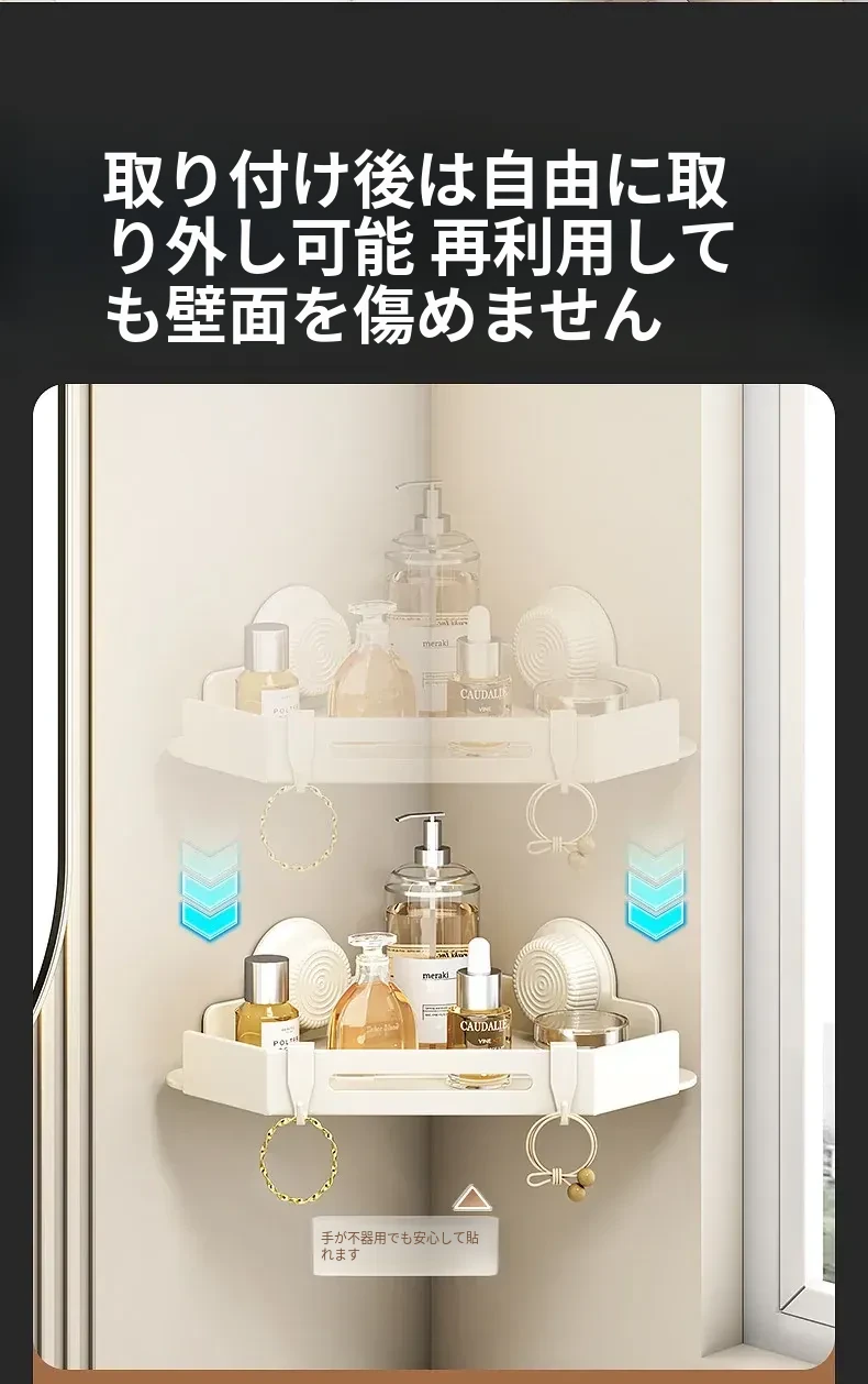 トイレ用吸盤三角収納ラック - 浴室の角にぴったり!穴を開けずに簡単取り付け、洗面台周りをスッキリ整理。使いやすさ抜群の壁掛け収納で、生活をもっと快適に!