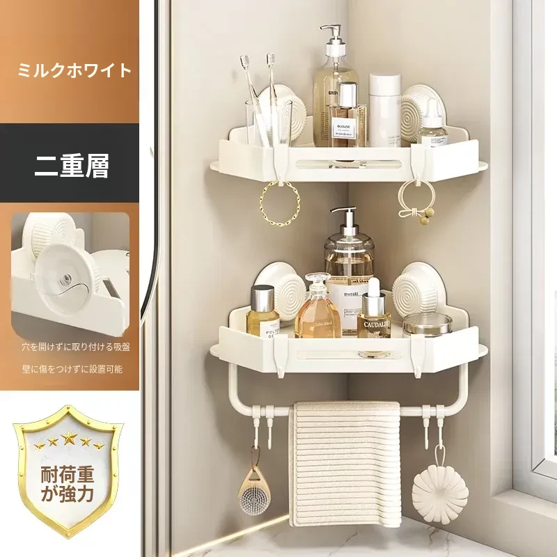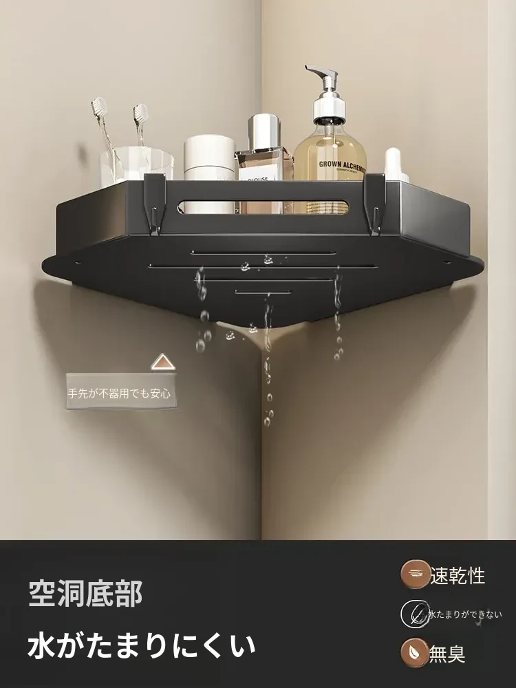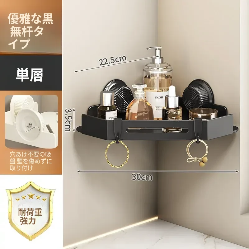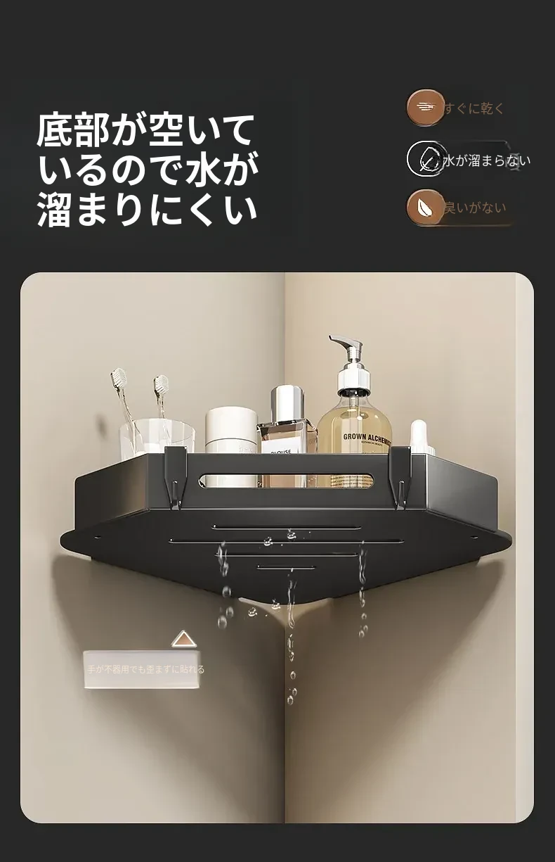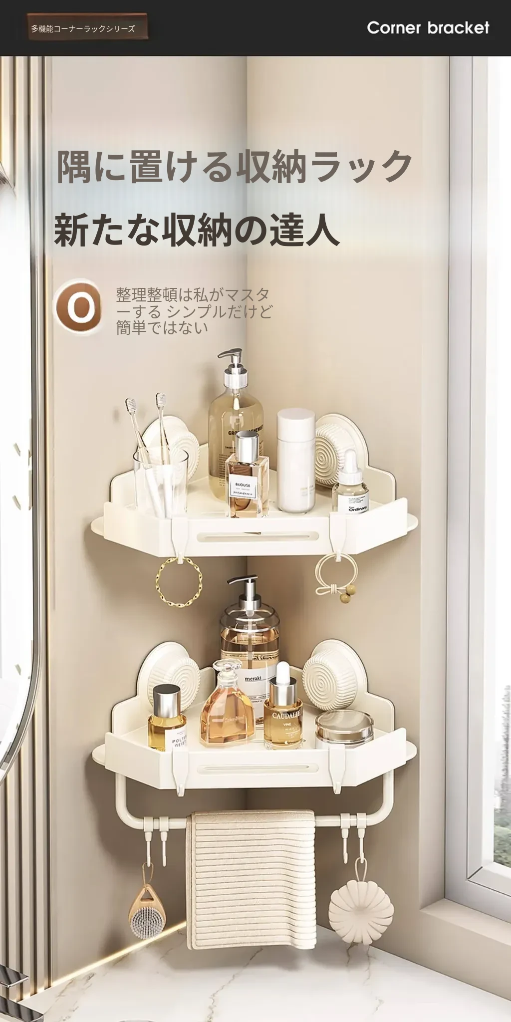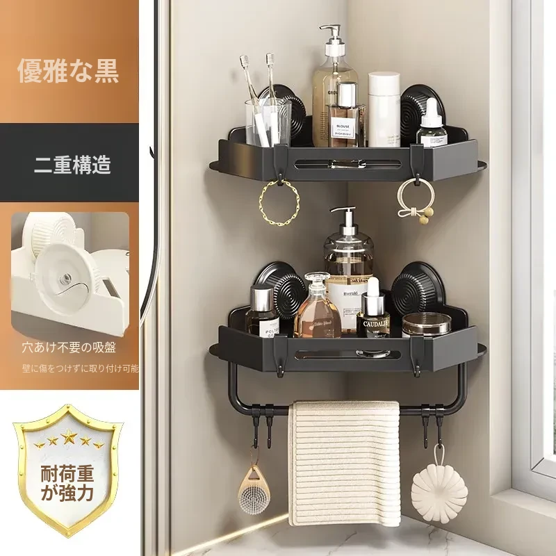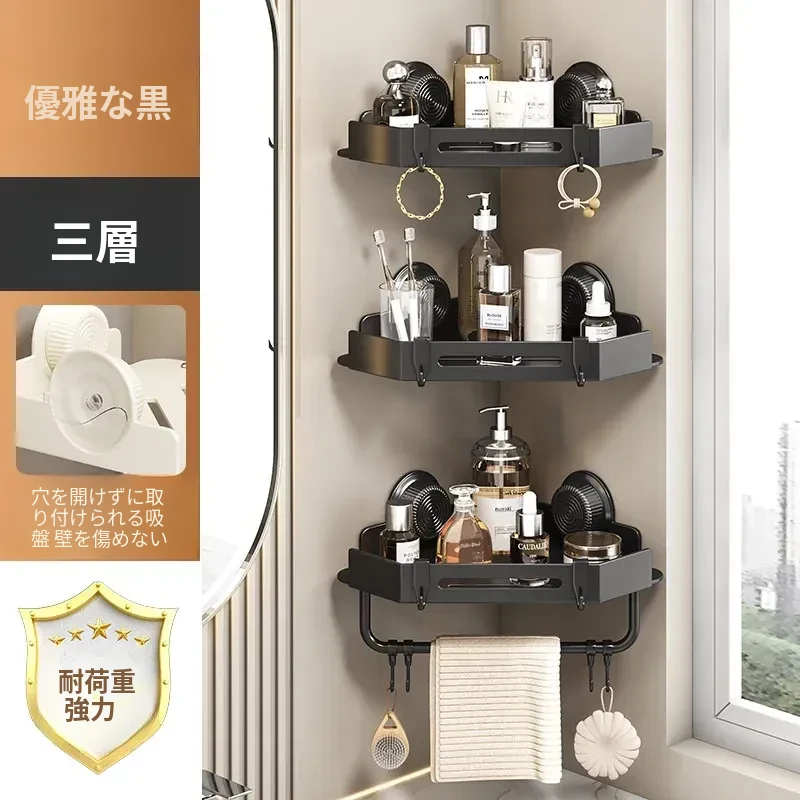 トイレ用吸盤三角収納ラック - 浴室の角にぴったり!穴を開けずに簡単取り付け、洗面台周りをスッキリ整理。使いやすさ抜群の壁掛け収納で、生活をもっと快適に!