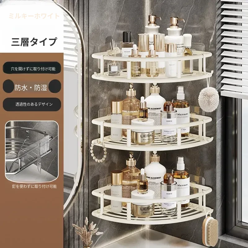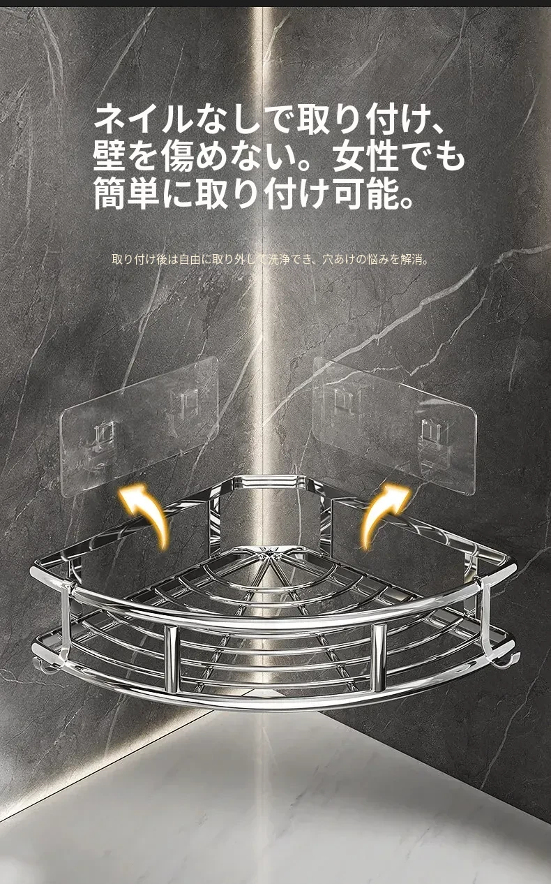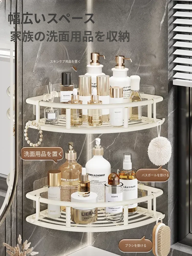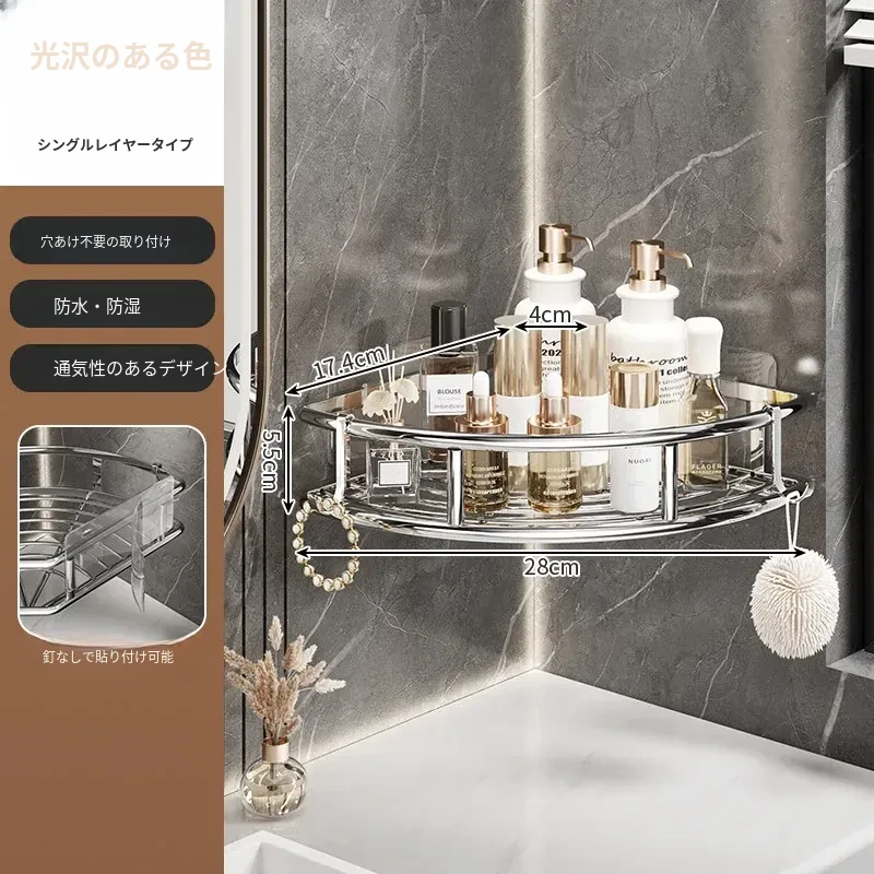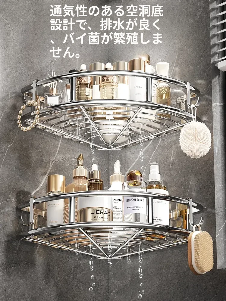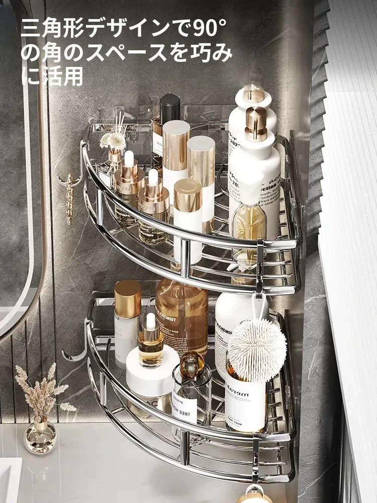 トイレやバスルームに最適!穴開け不要の三角形収納ラック - 洗面台やキッチンにぴったりの壁掛けコーナーシェルフで、スペースを有効活用してすっきり整理!