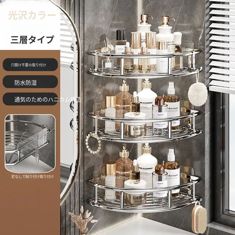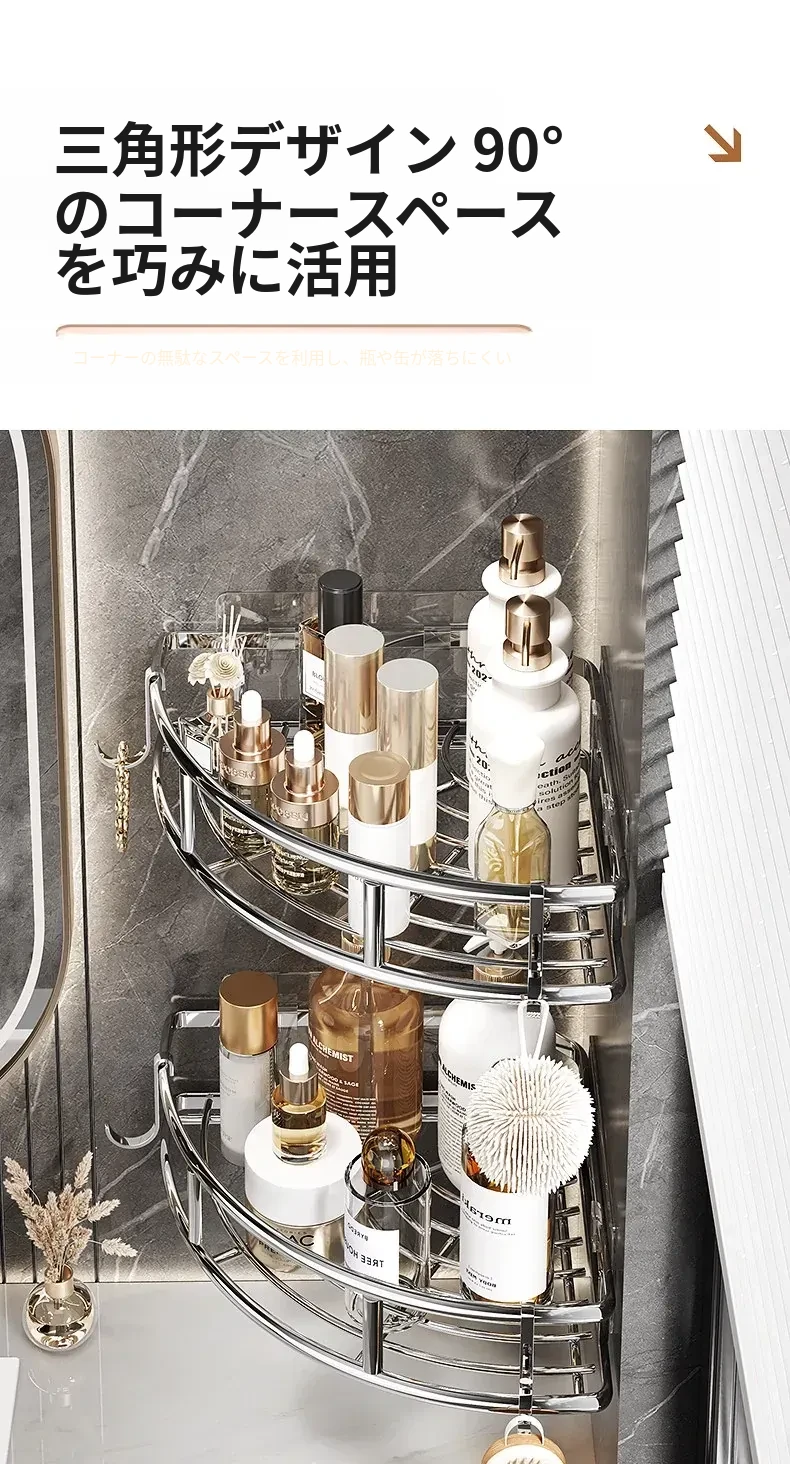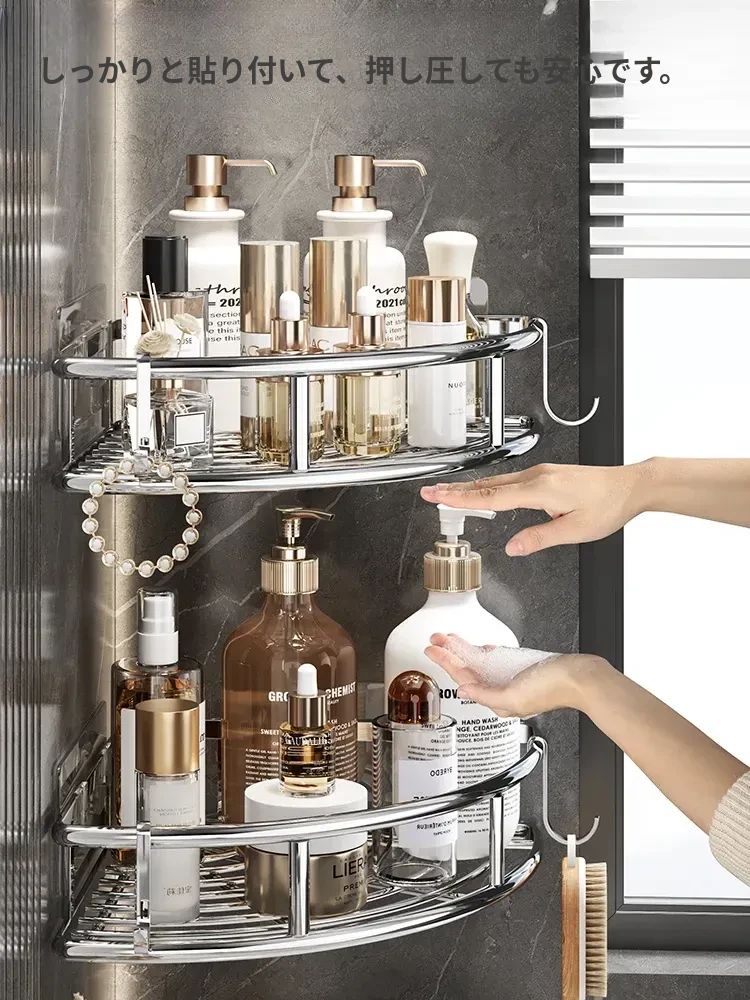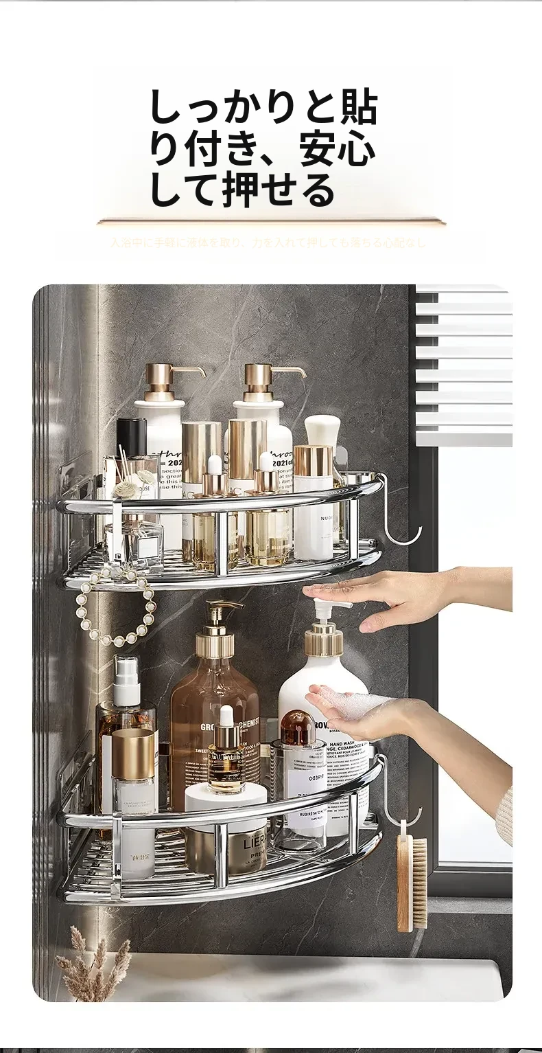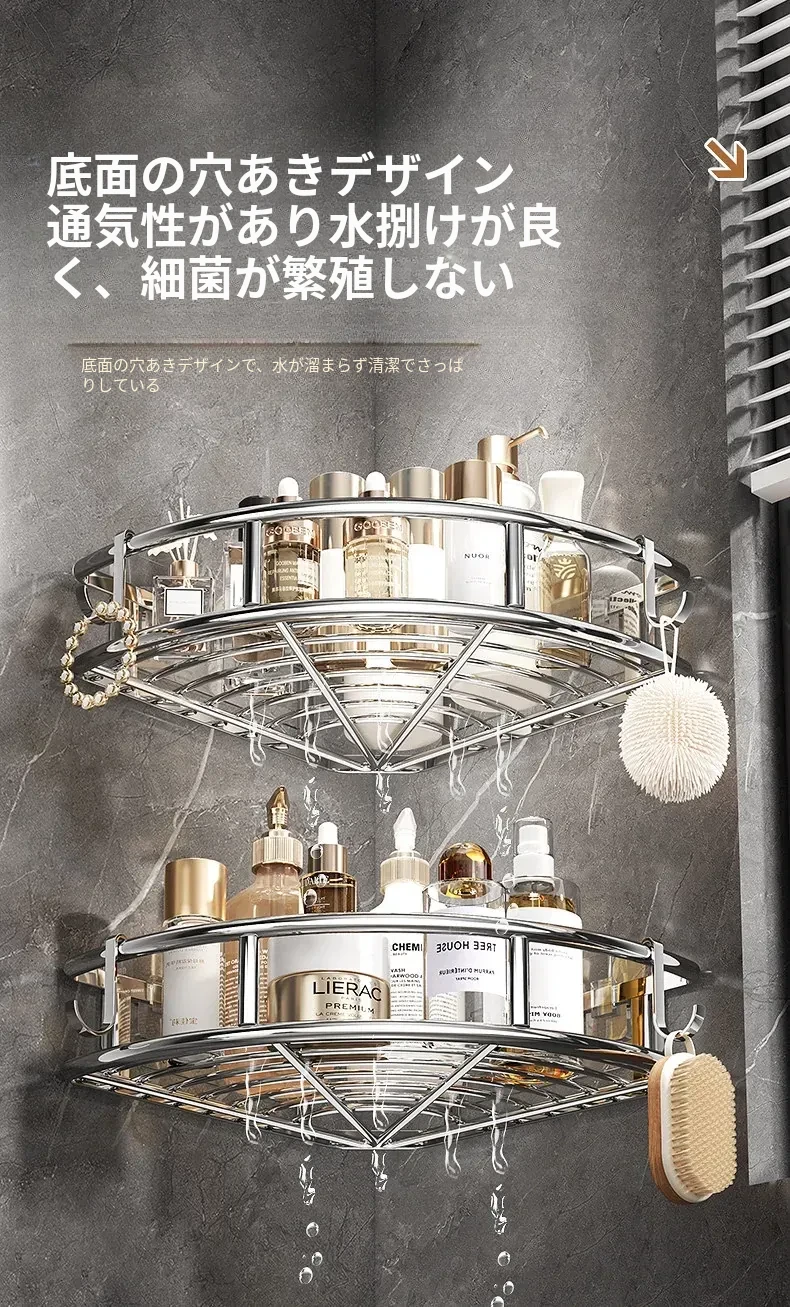 トイレやバスルームに最適!穴開け不要の三角形収納ラック - 洗面台やキッチンにぴったりの壁掛けコーナーシェルフで、スペースを有効活用してすっきり整理!