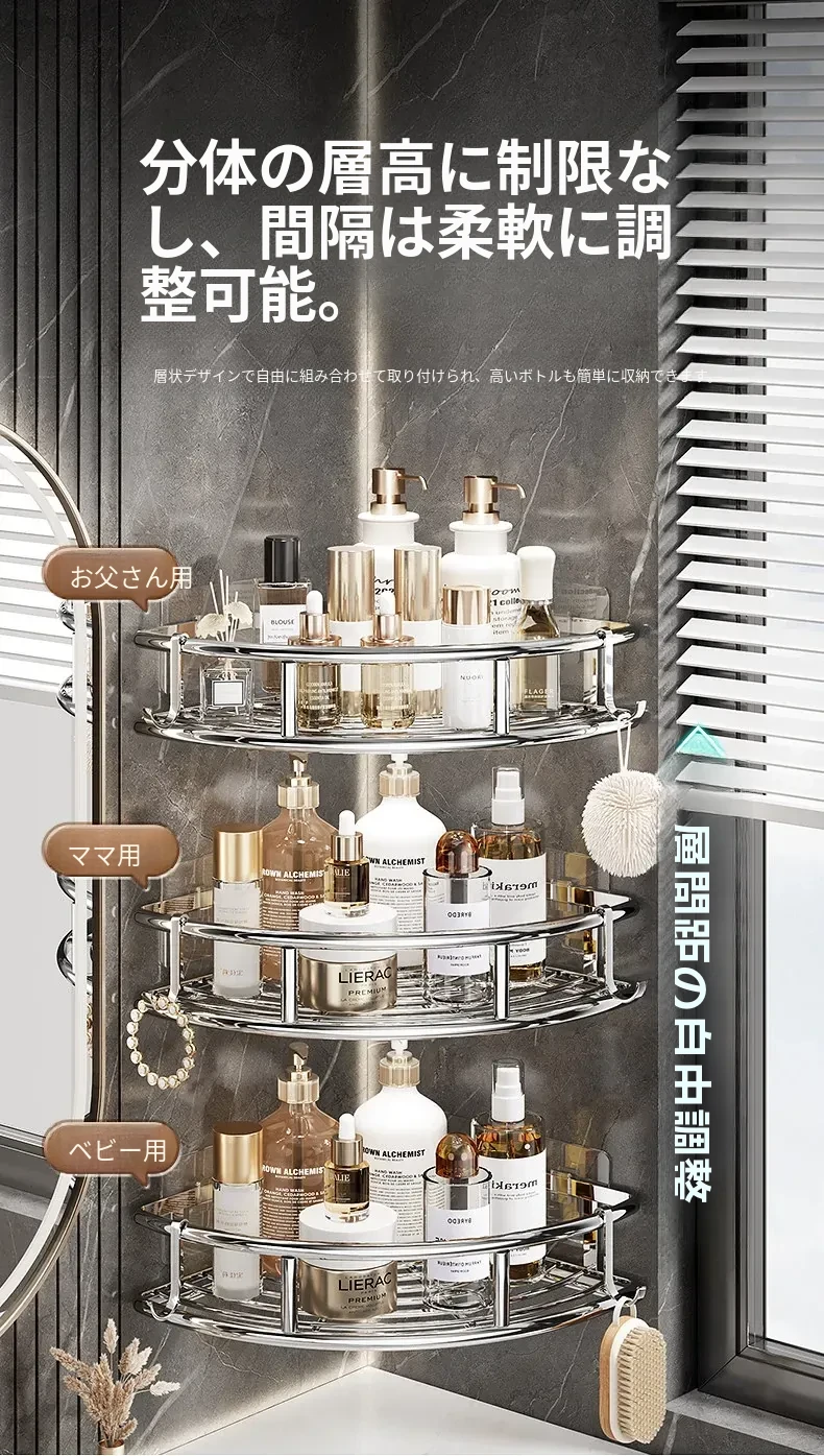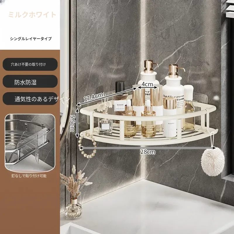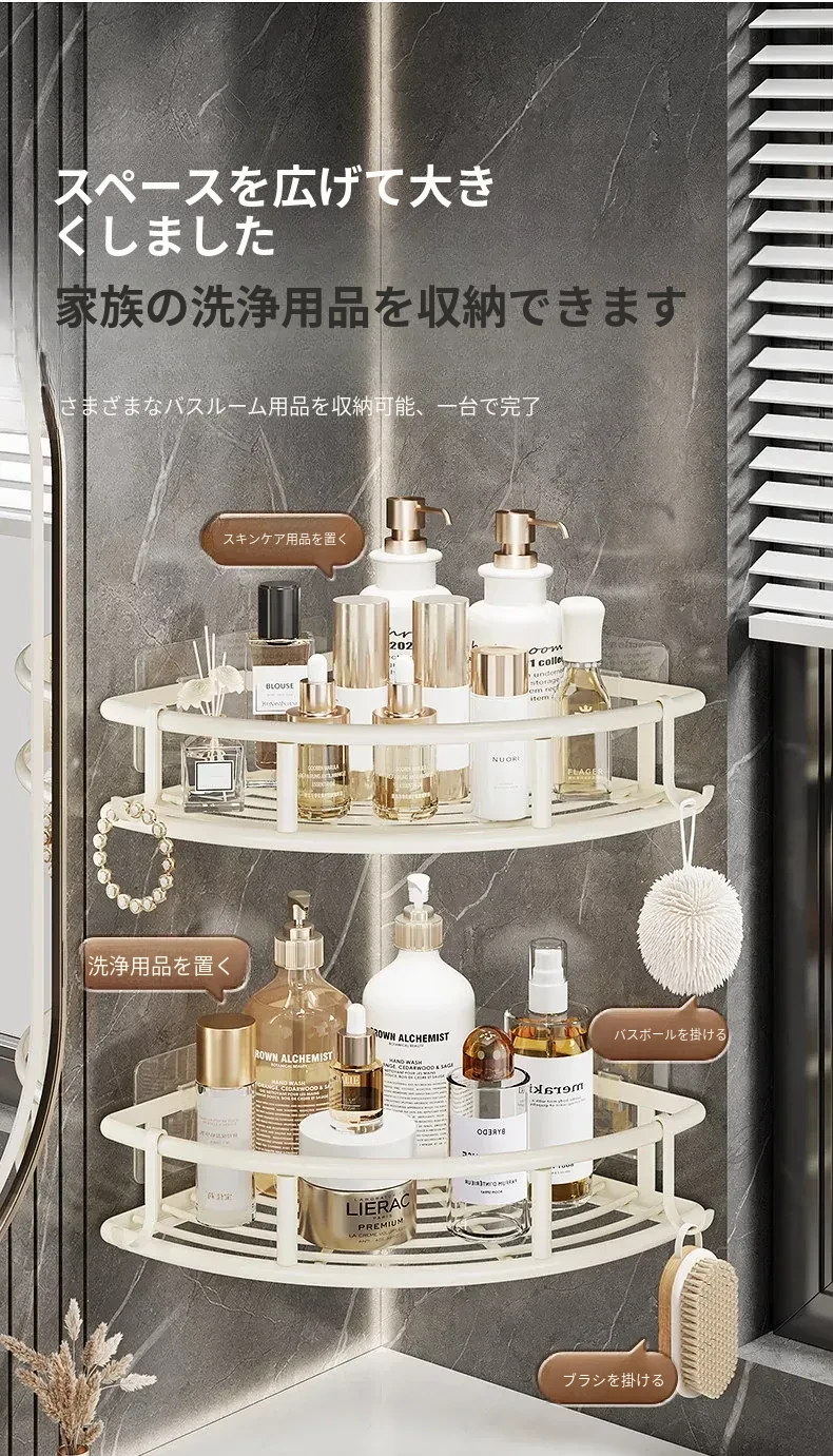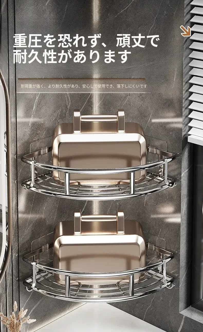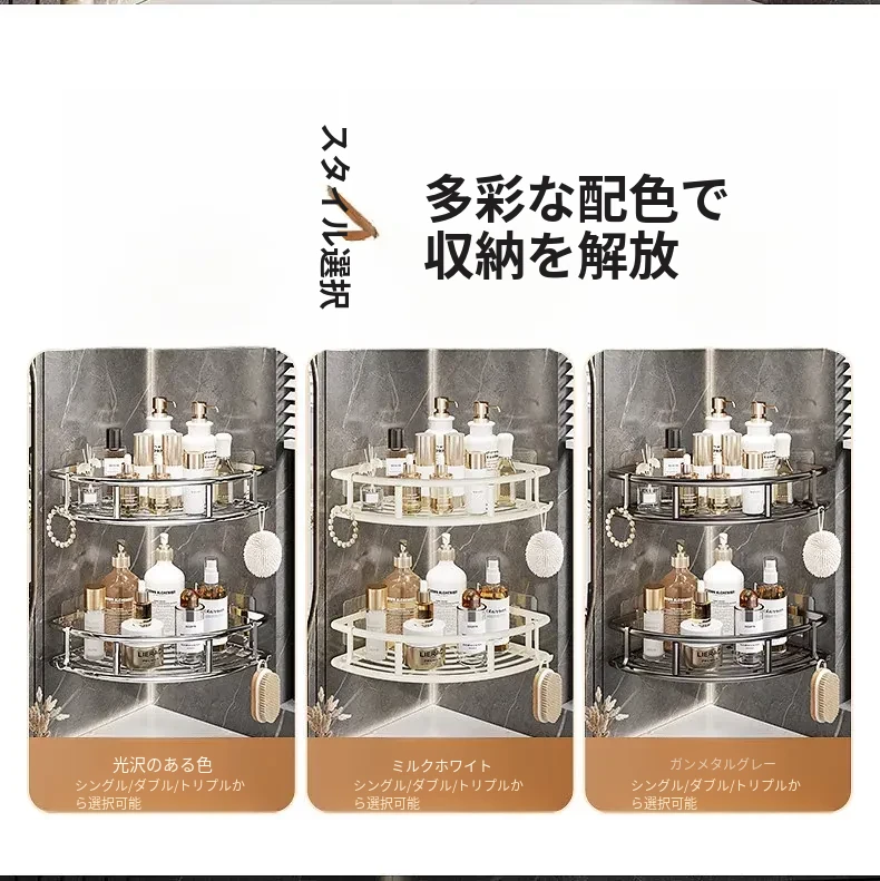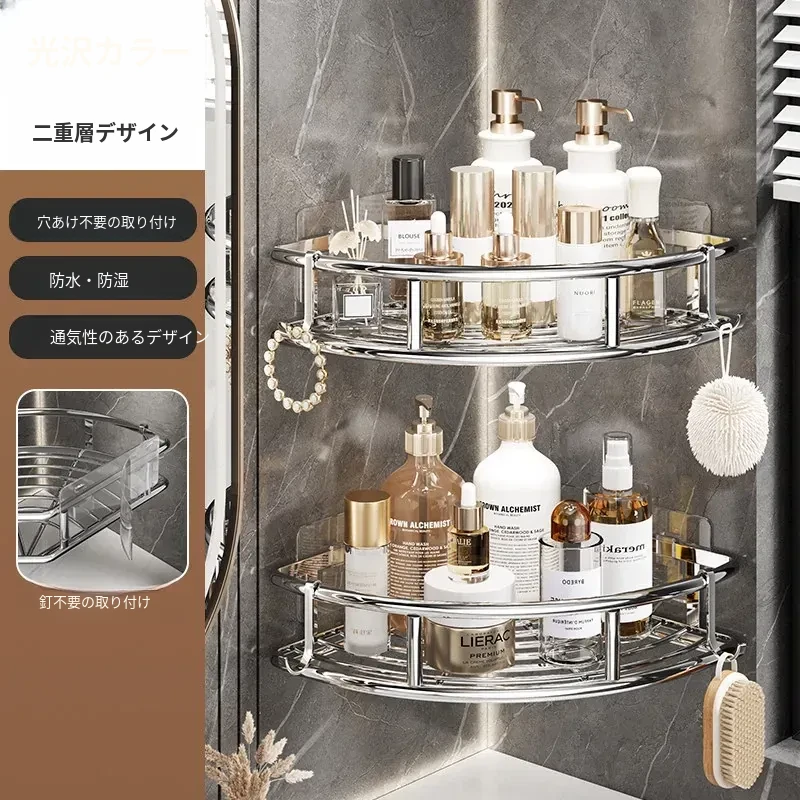 トイレやバスルームに最適!穴開け不要の三角形収納ラック - 洗面台やキッチンにぴったりの壁掛けコーナーシェルフで、スペースを有効活用してすっきり整理!