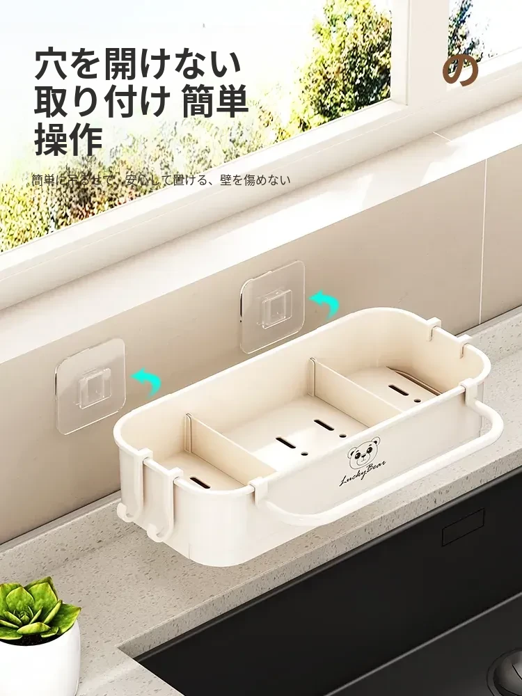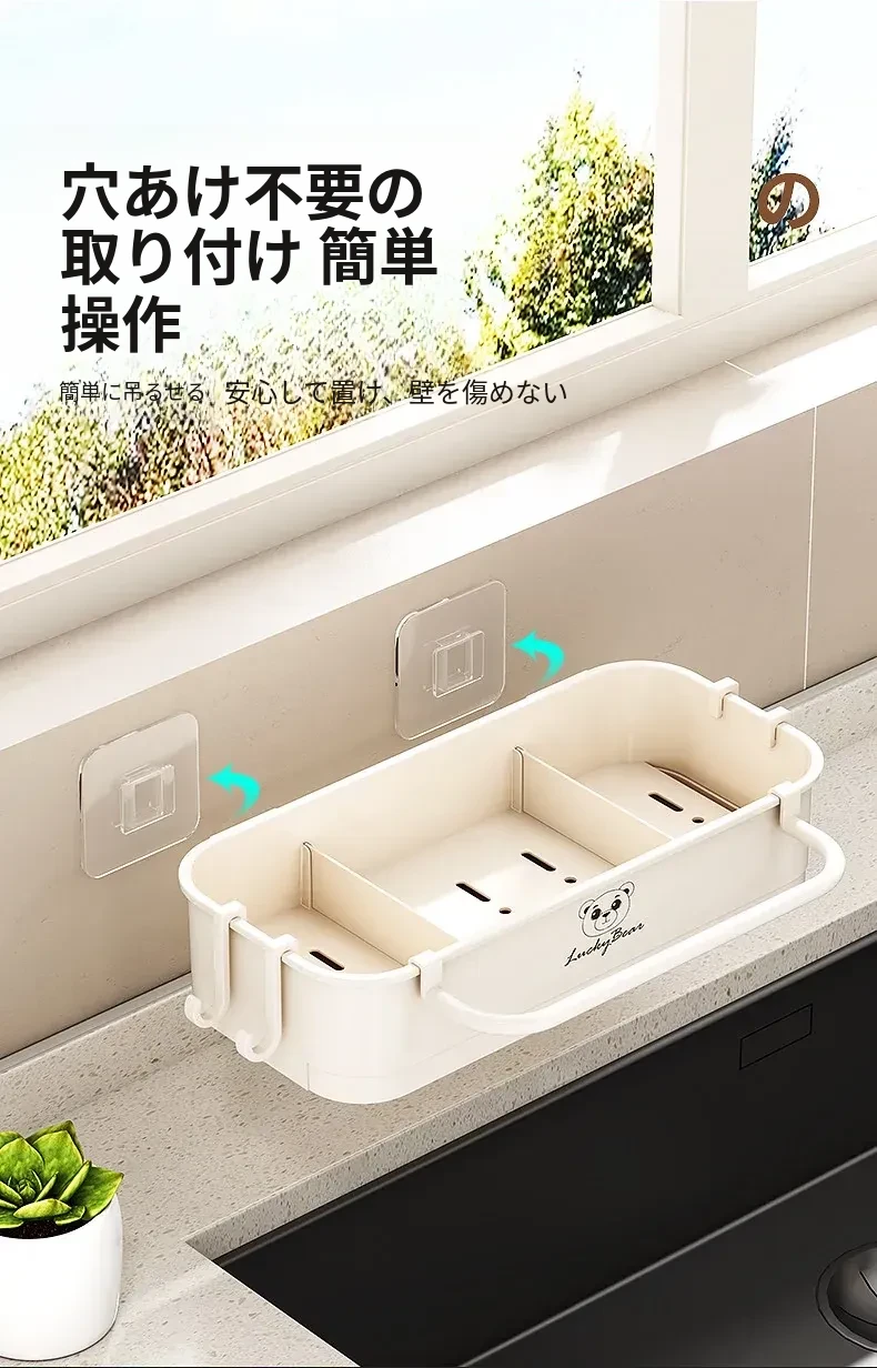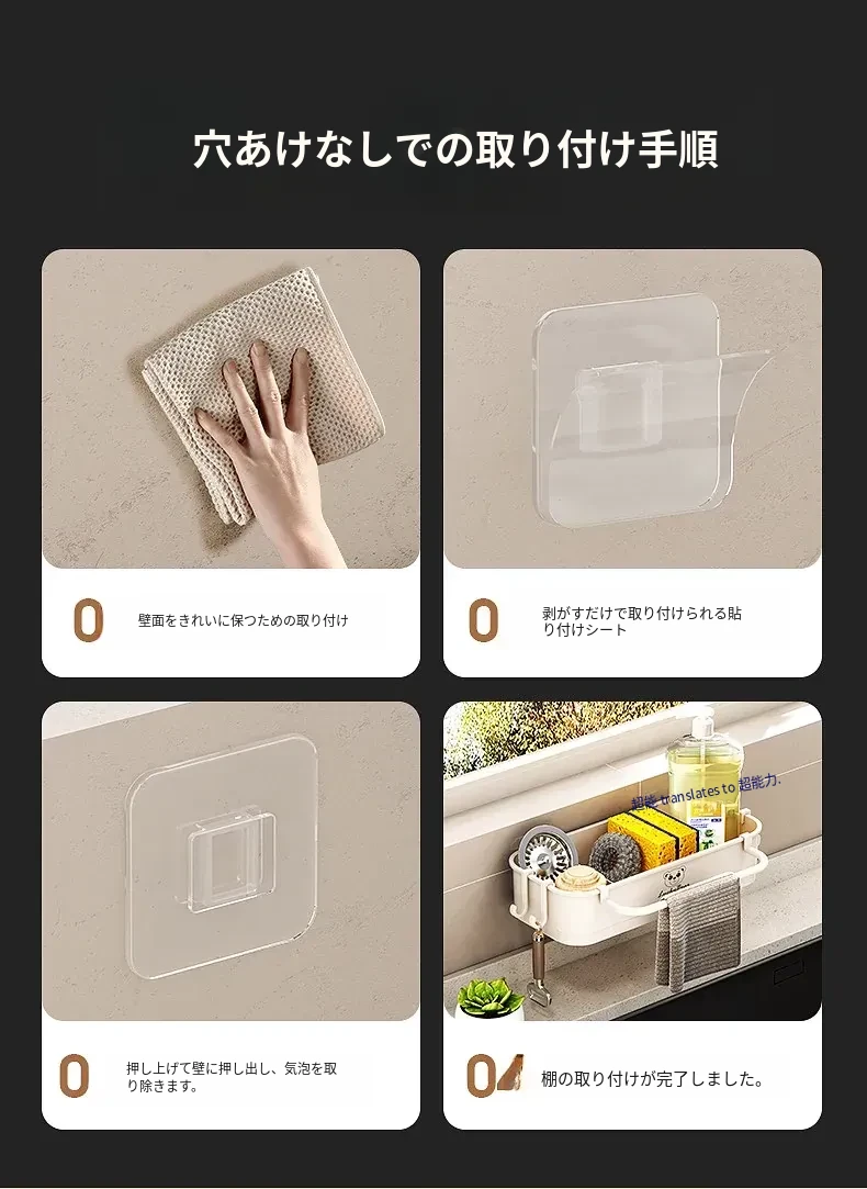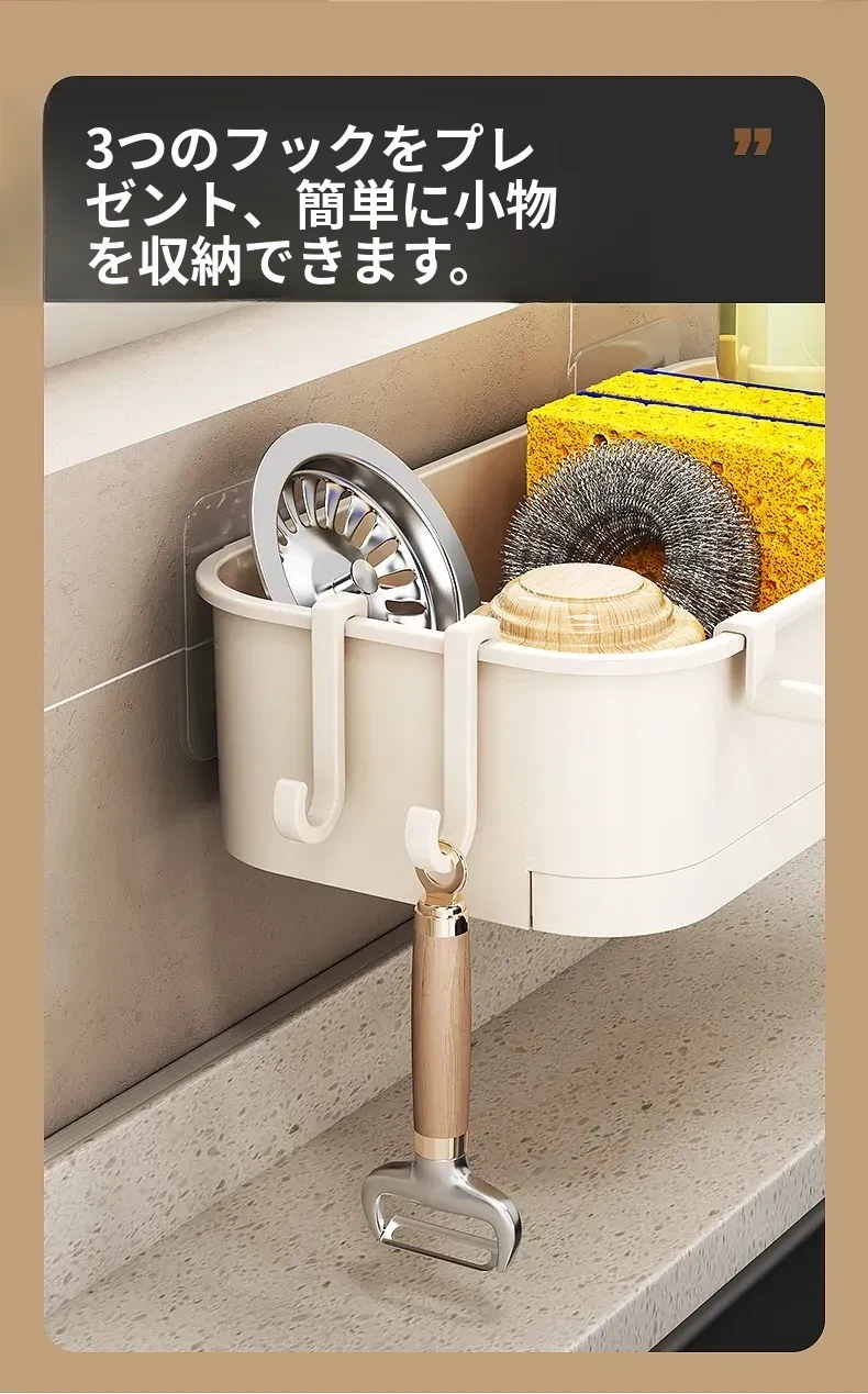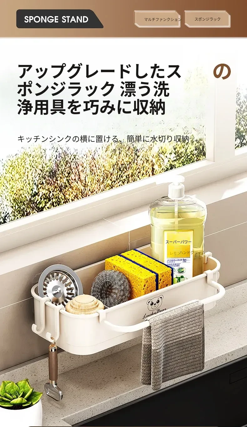 キッチン用取り付け不要のマルチ機能壁掛け収納ラック - 水切りバスケットとスポンジ収納に最適!省スペースで整理整頓も簡単!