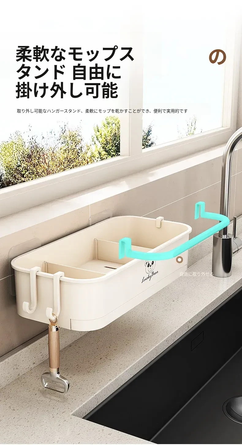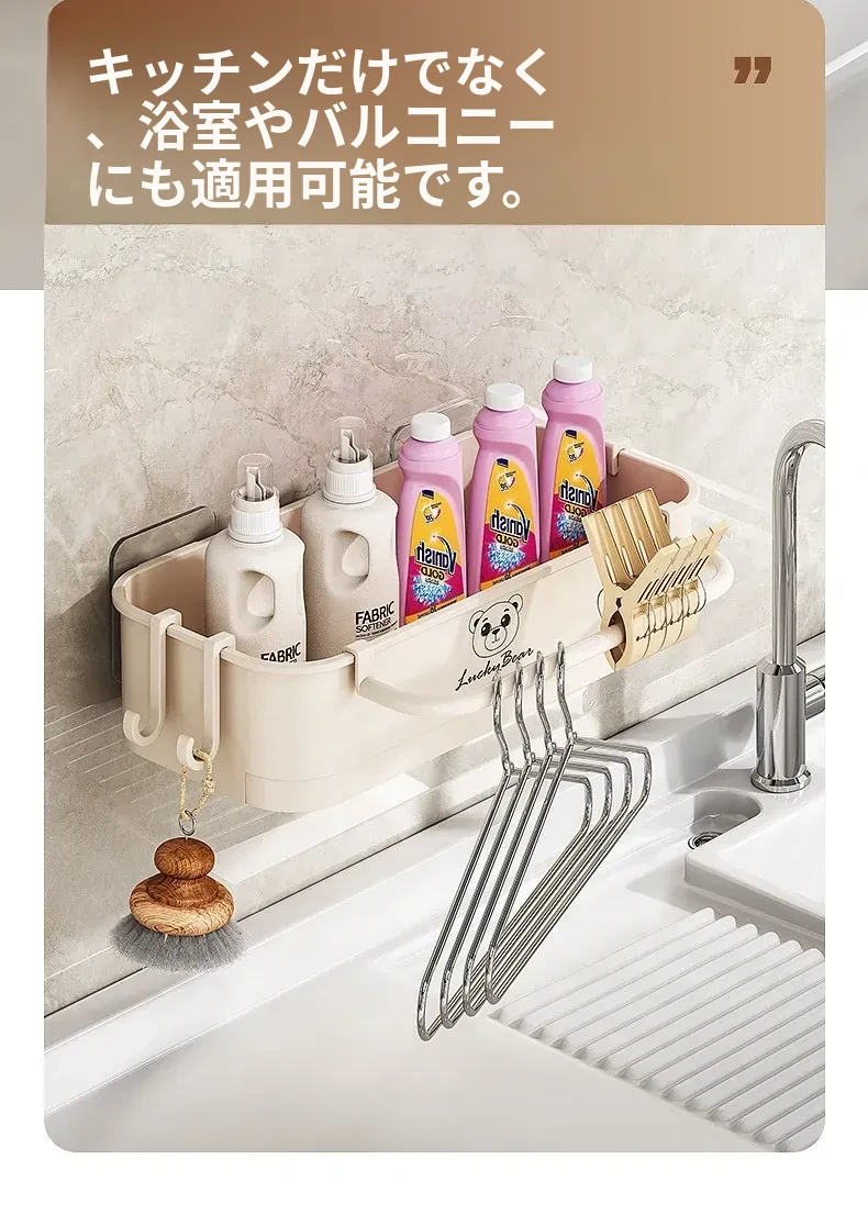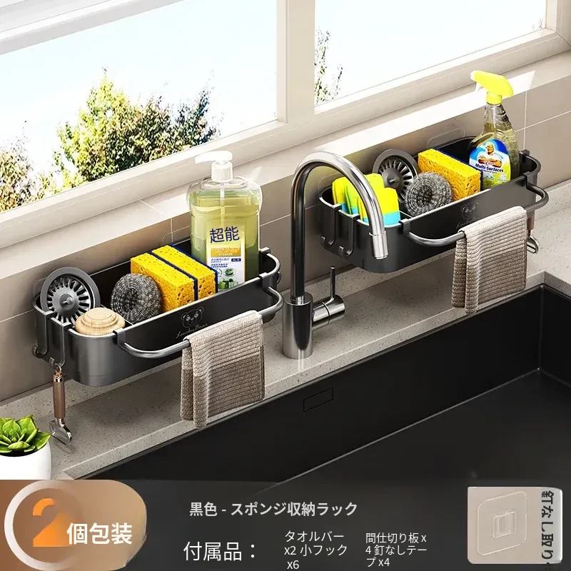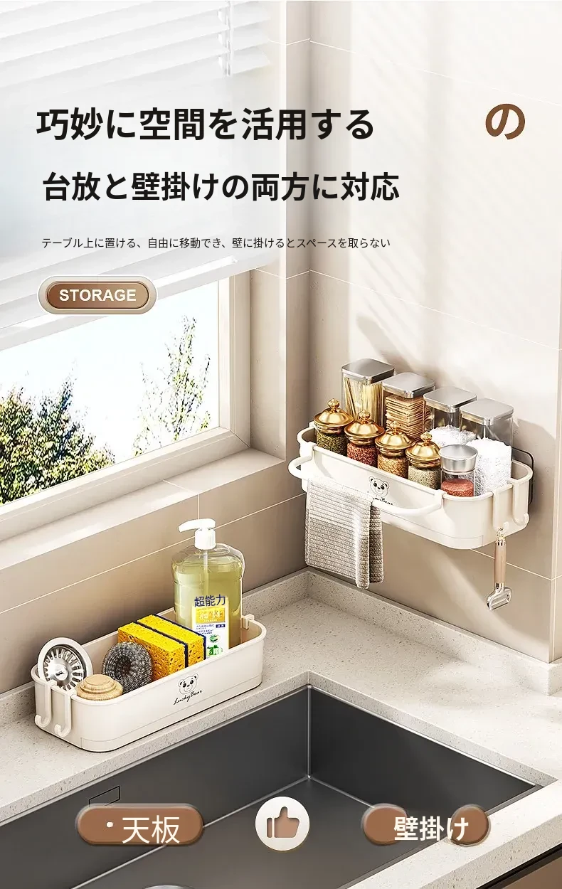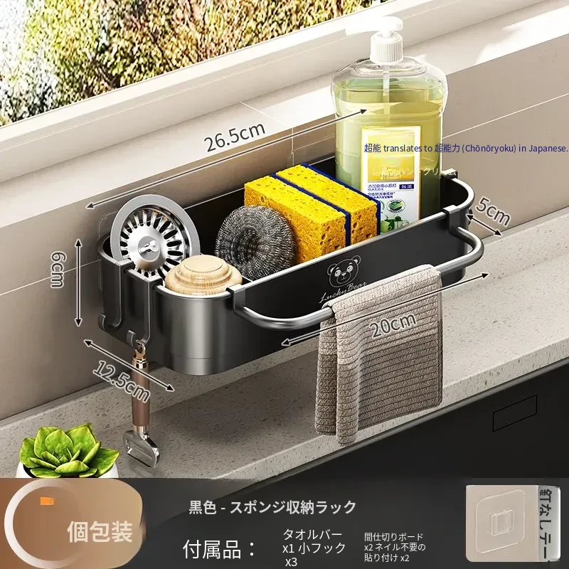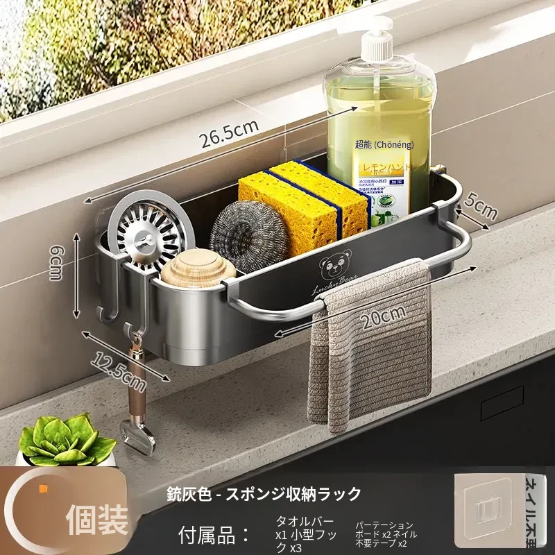 キッチン用取り付け不要のマルチ機能壁掛け収納ラック - 水切りバスケットとスポンジ収納に最適!省スペースで整理整頓も簡単!