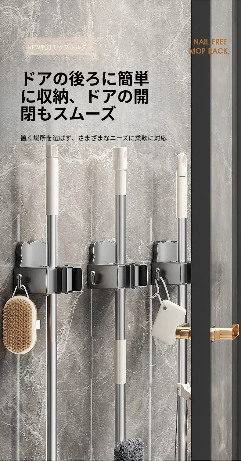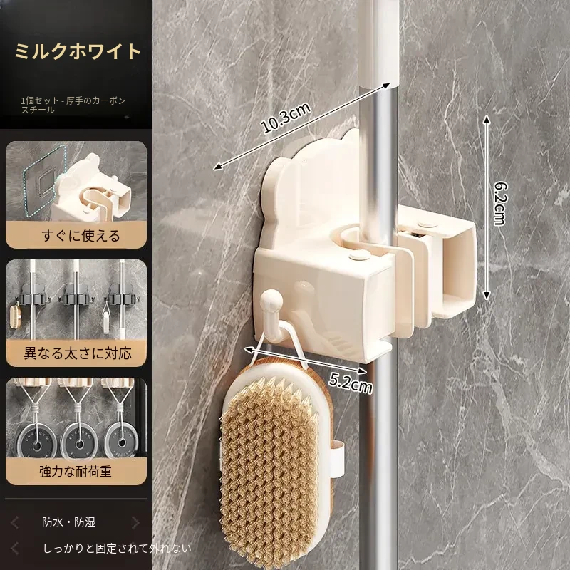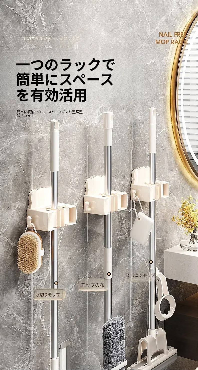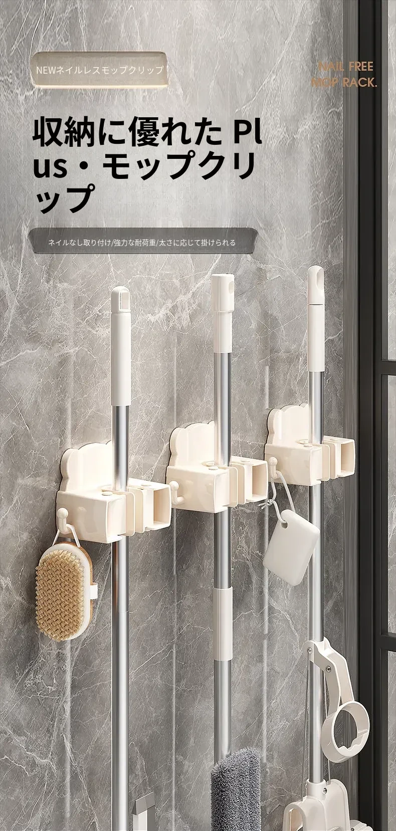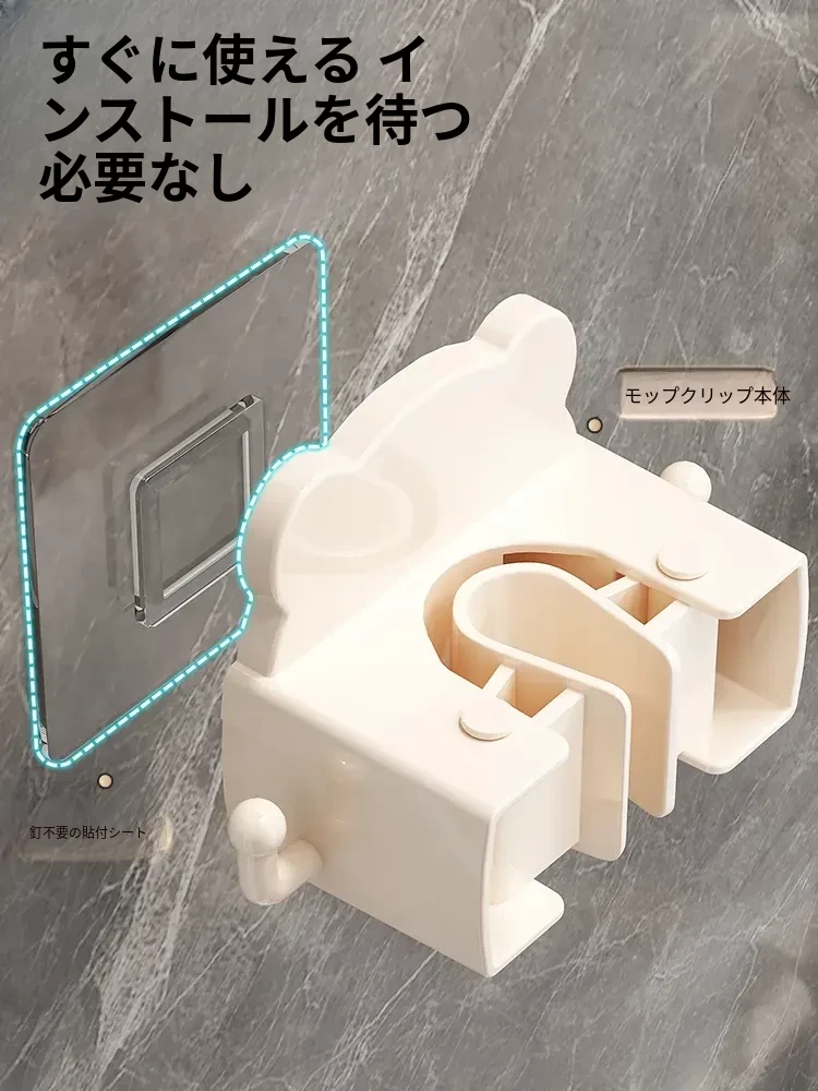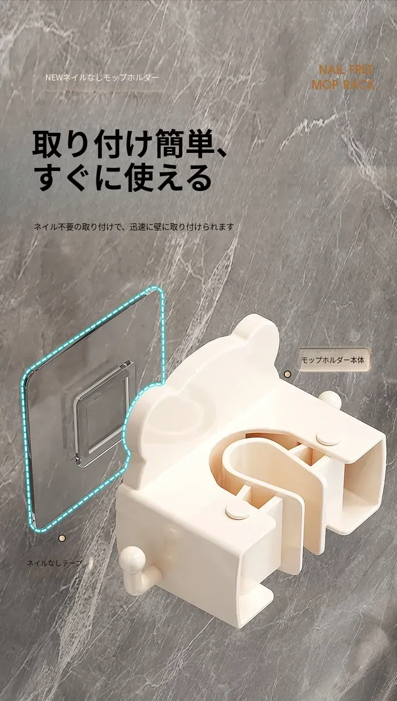トイレ用モップ壁掛けクリップ - 便利な粘着フックで、掃除道具をスマートに収納!穴あけ不要で取り付け簡単、浴室も整頓!お掃除がもっと楽しくなる必須アイテム!