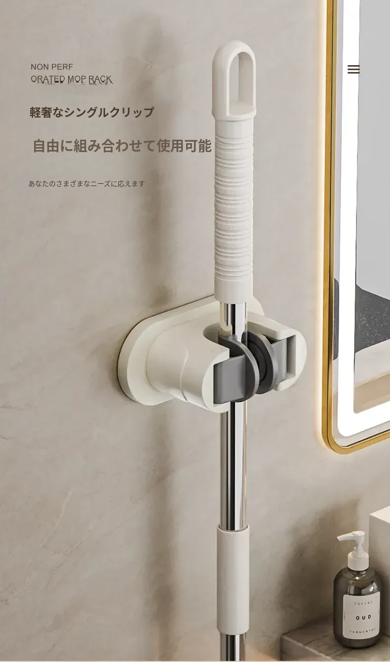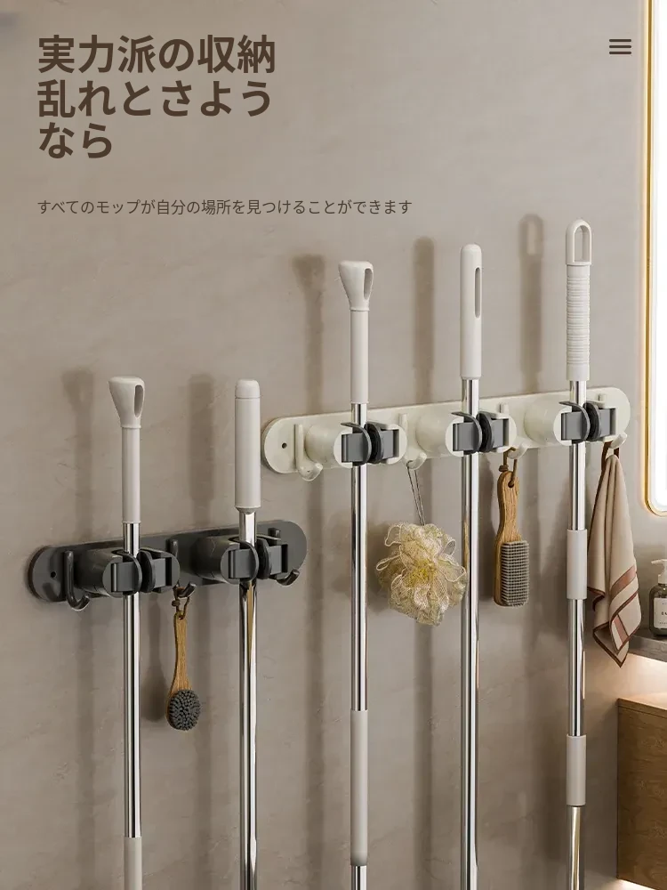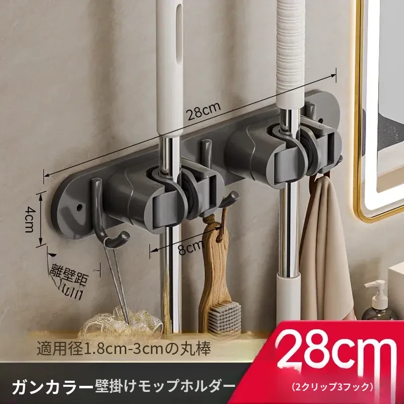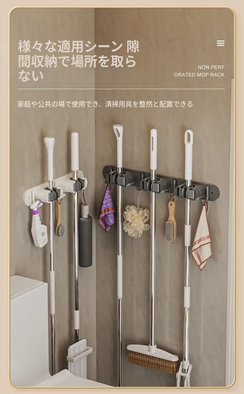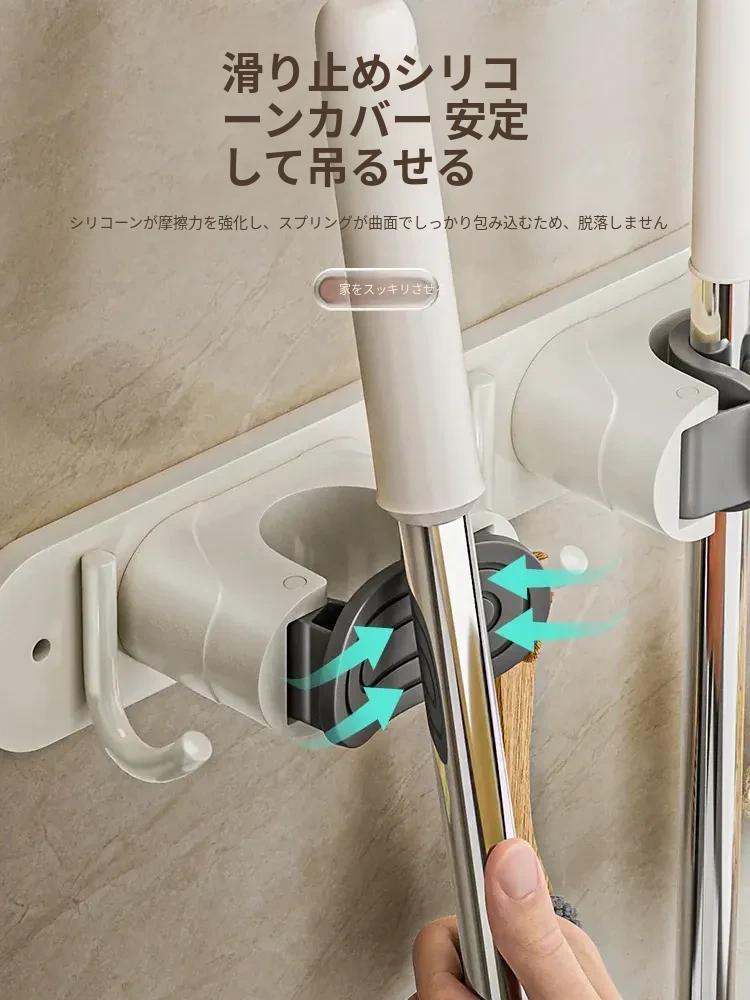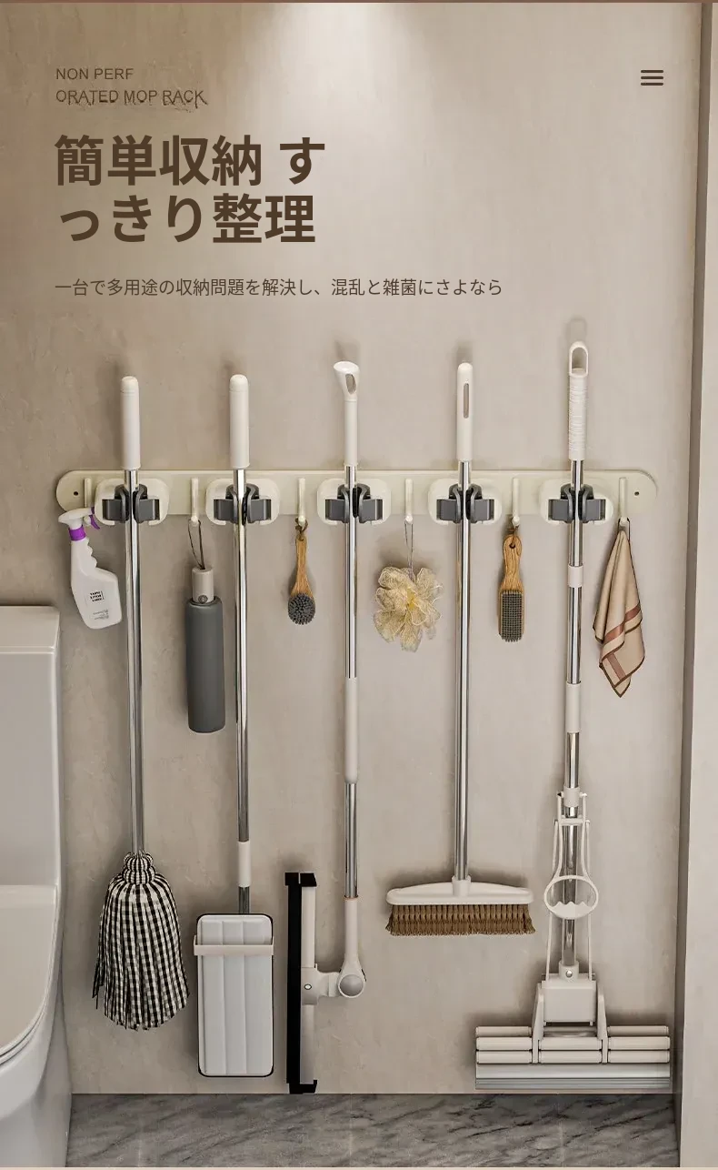 壁掛けモップクリップフック - 穴あけ不要!トイレ用モップやほうきをすっきり収納できる便利な収納ラック。省スペースで整理整頓を実現!お掃除がもっと楽になるアイテムです!