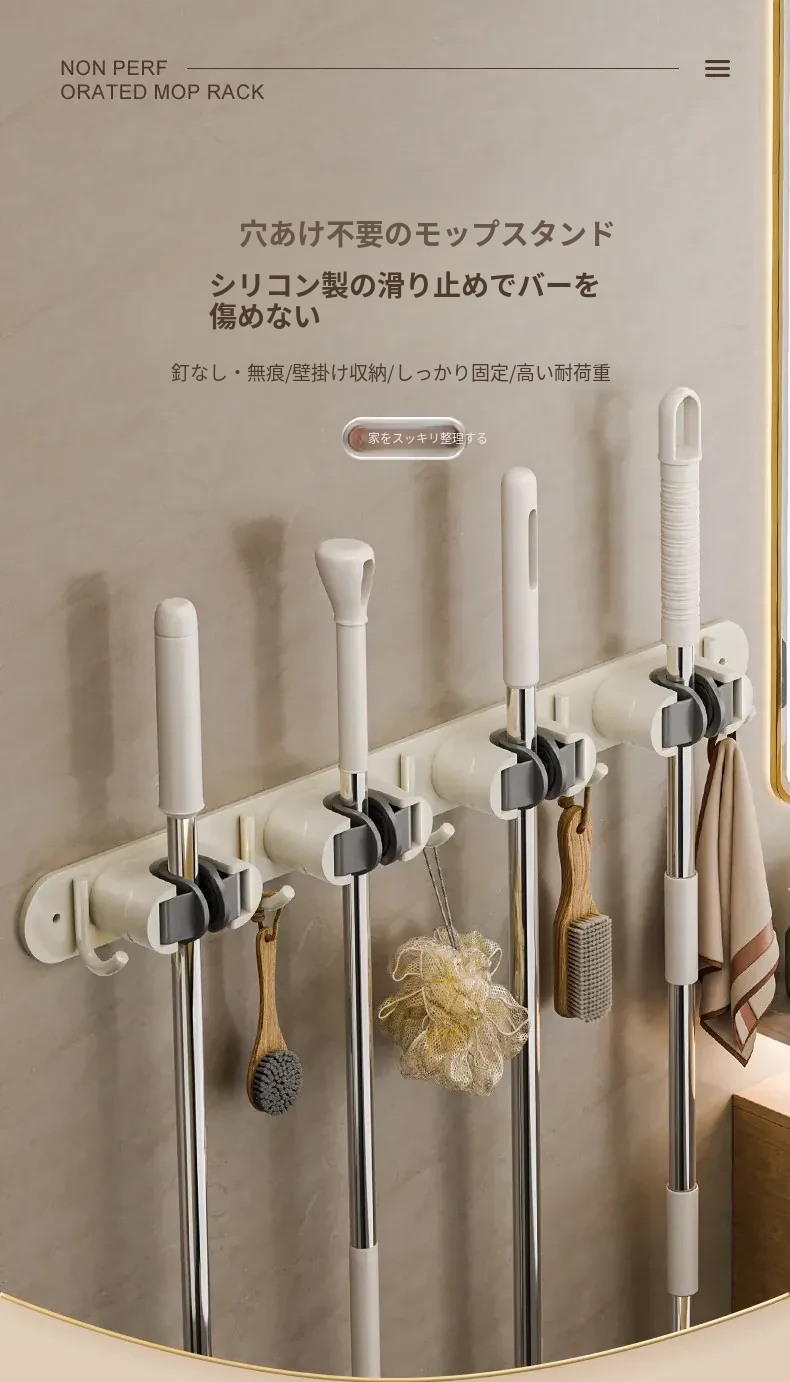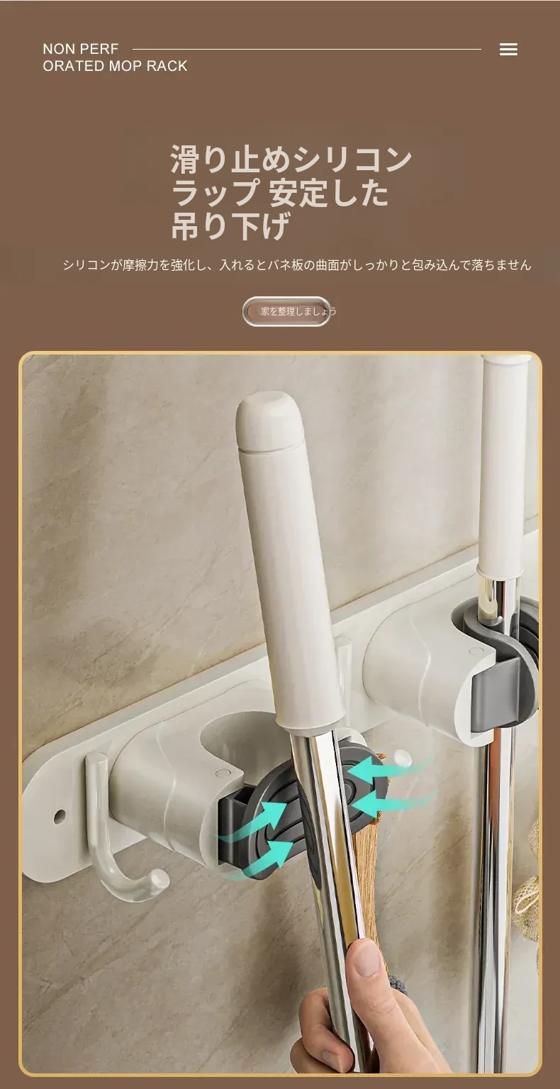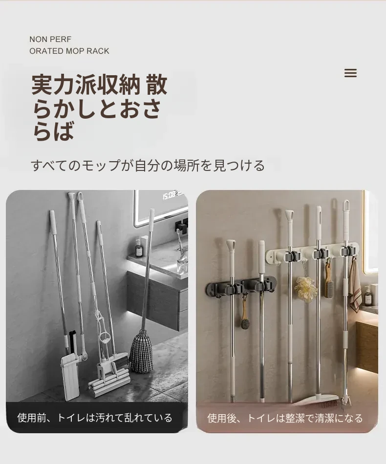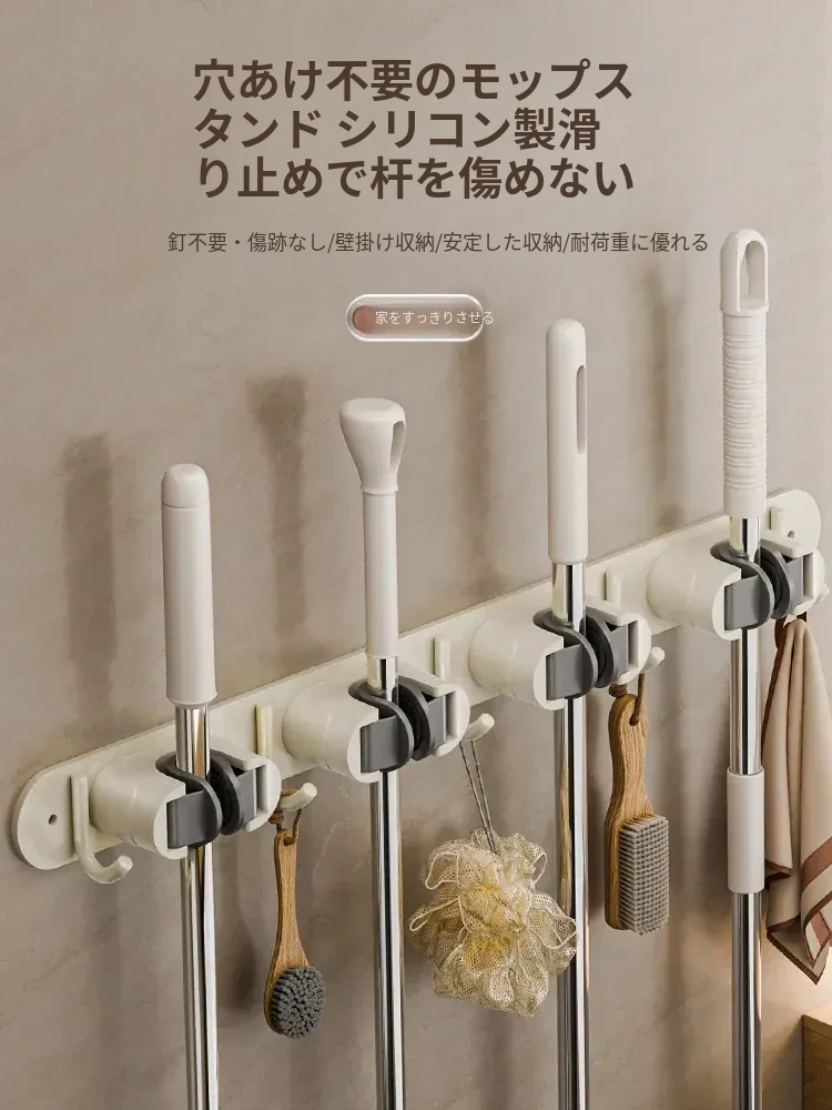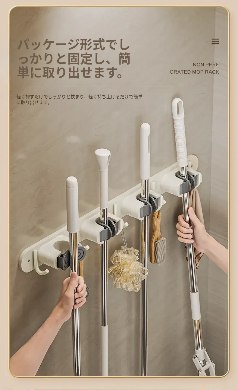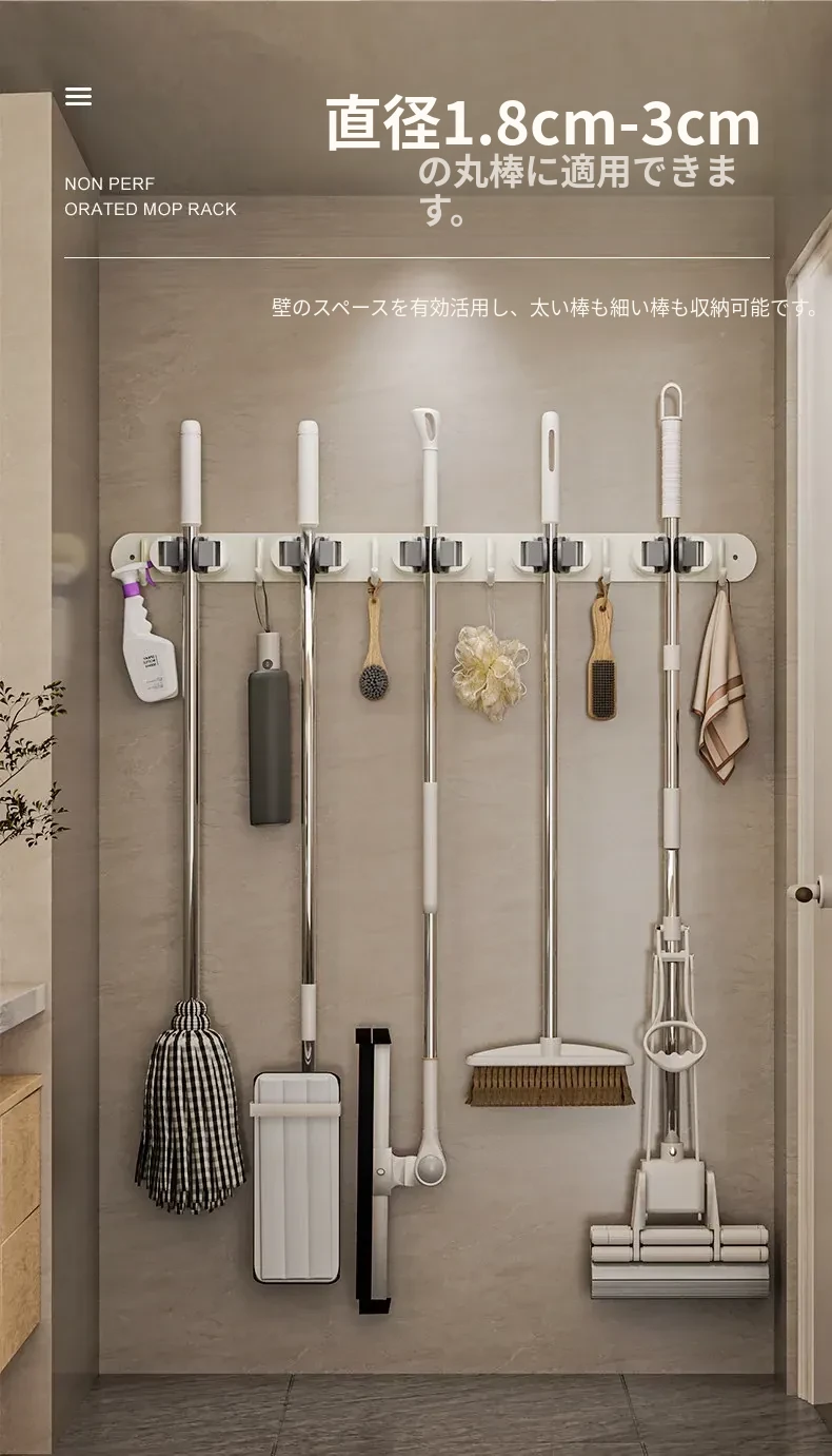 壁掛けモップクリップフック - 穴あけ不要!トイレ用モップやほうきをすっきり収納できる便利な収納ラック。省スペースで整理整頓を実現!お掃除がもっと楽になるアイテムです!