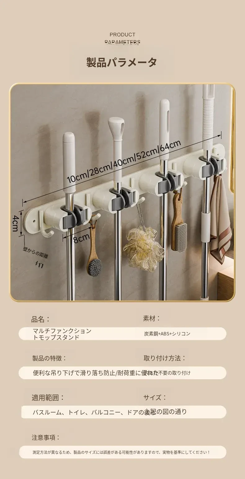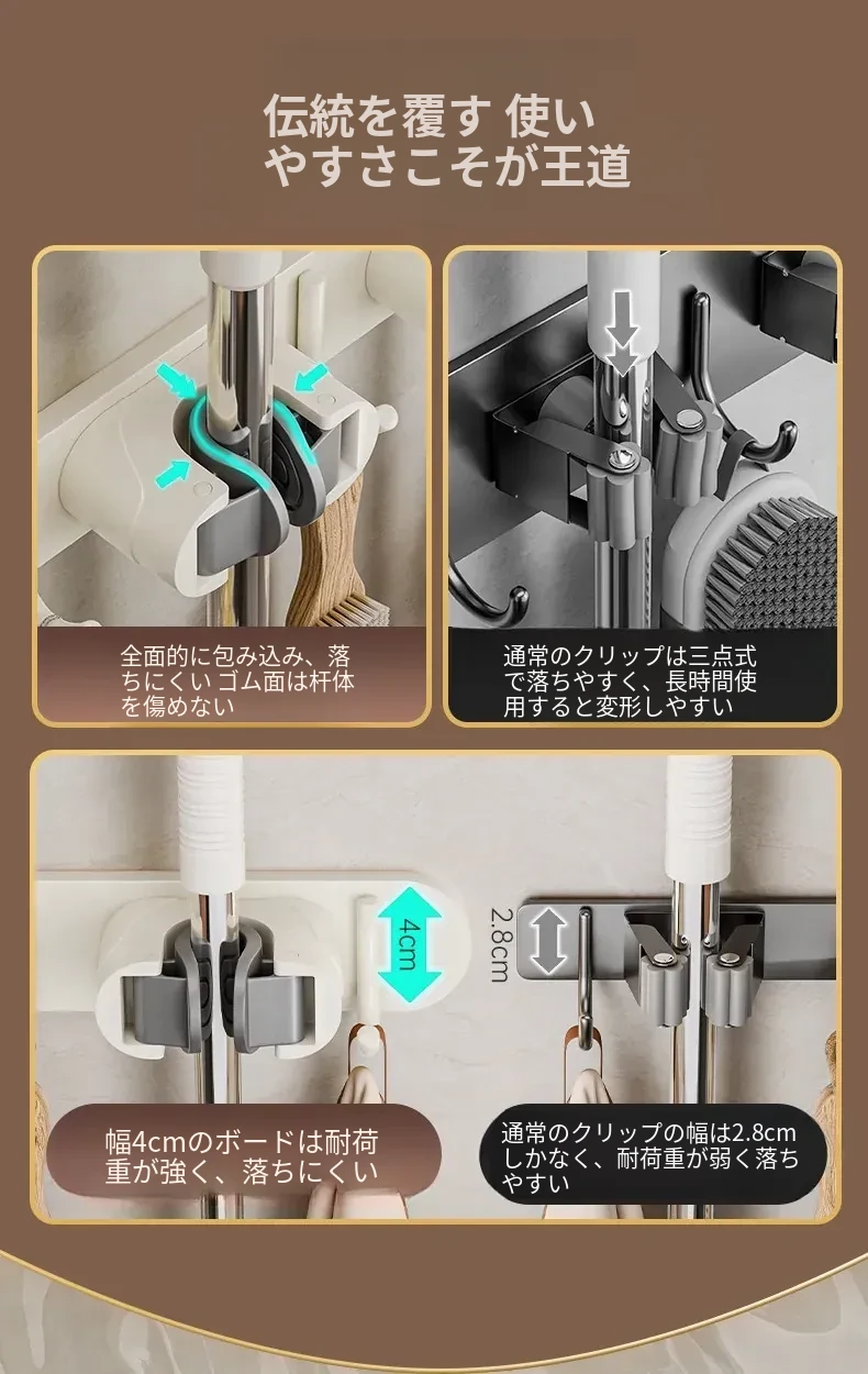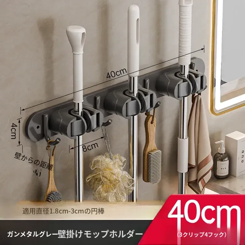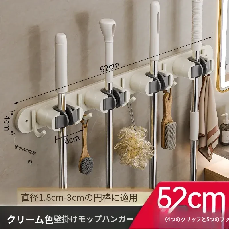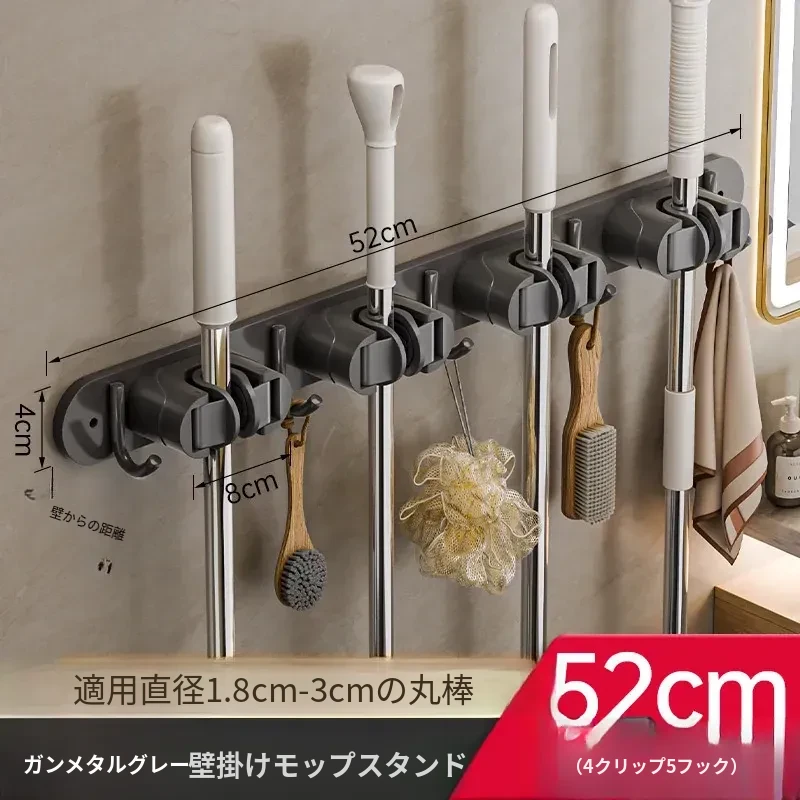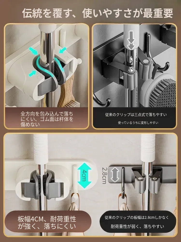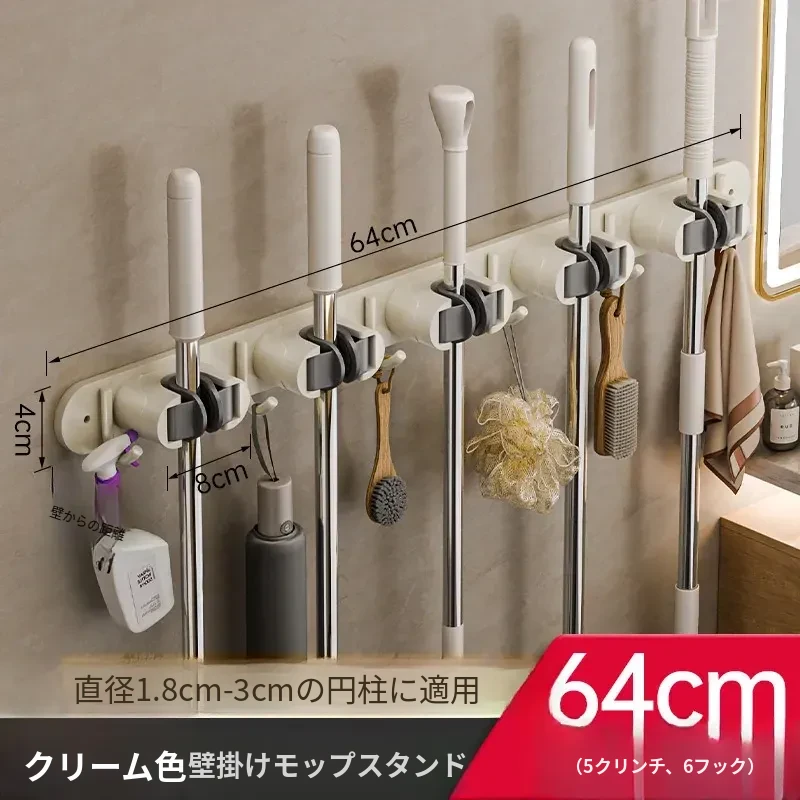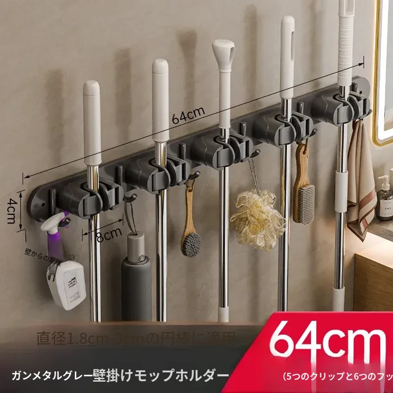 壁掛けモップクリップフック - 穴あけ不要!トイレ用モップやほうきをすっきり収納できる便利な収納ラック。省スペースで整理整頓を実現!お掃除がもっと楽になるアイテムです!