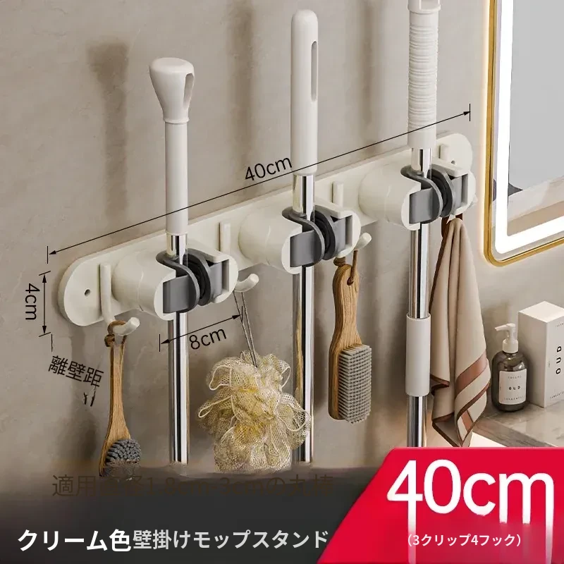 クリームホワイト【3クリップ4フック】多機能モップスタンド