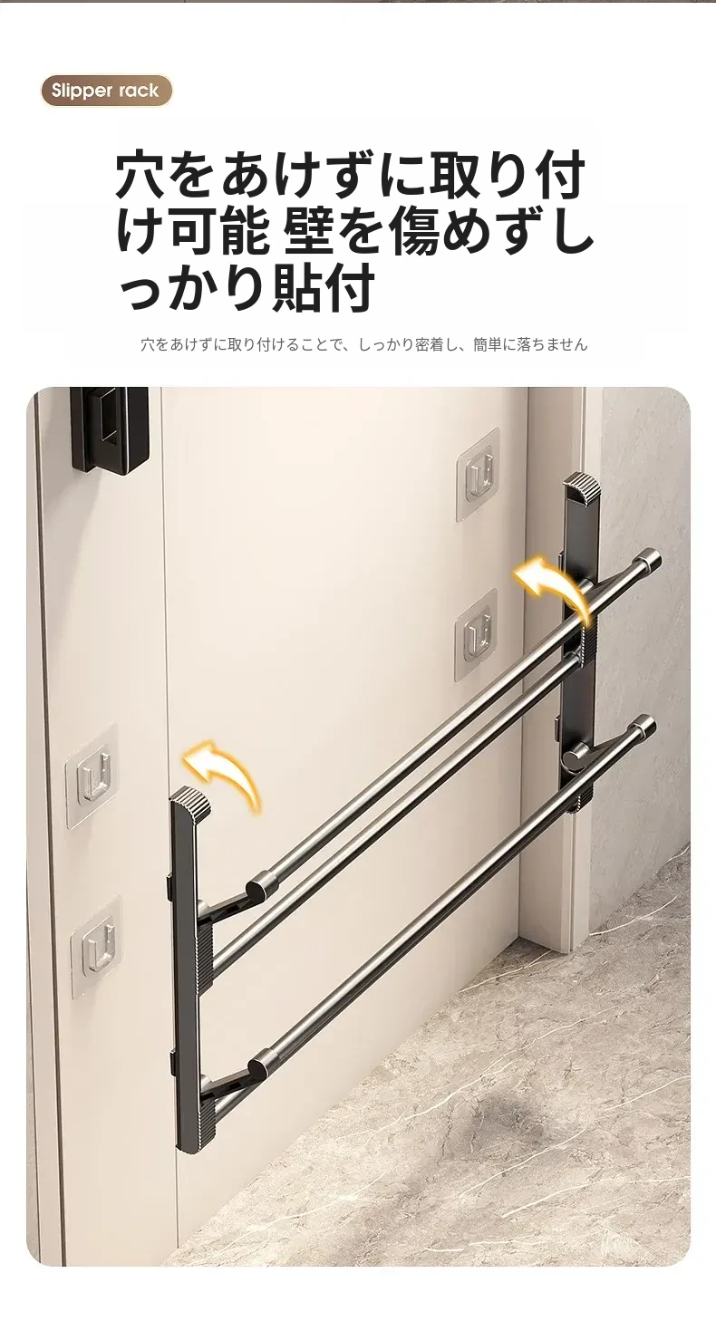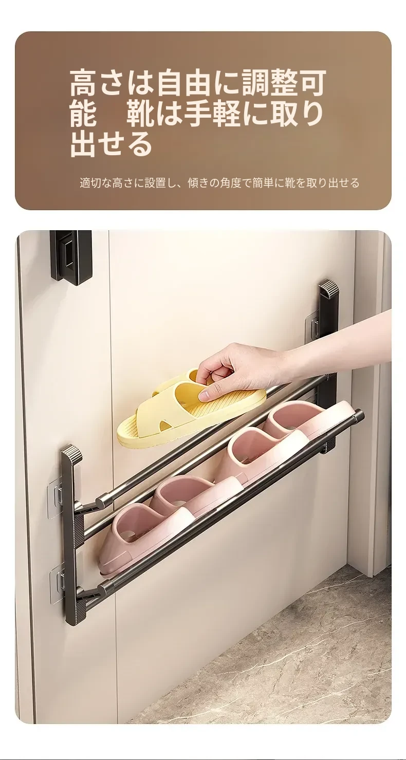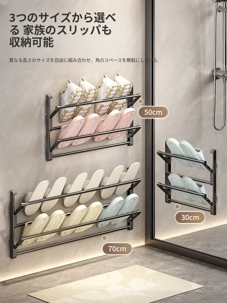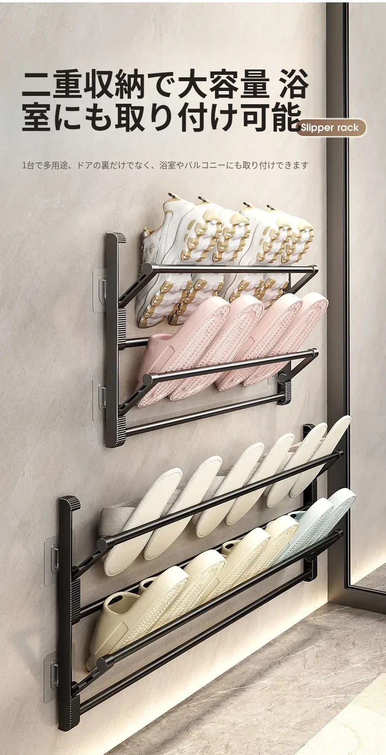 バスルーム用スリッパラック 壁掛け式・ドア裏設置・水切り機能付き 折りたたみ二段収納シューズオーガナイザー!スペースを有効活用して、清潔で整理整頓されたバスルームを実現!
