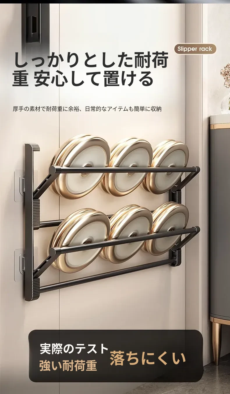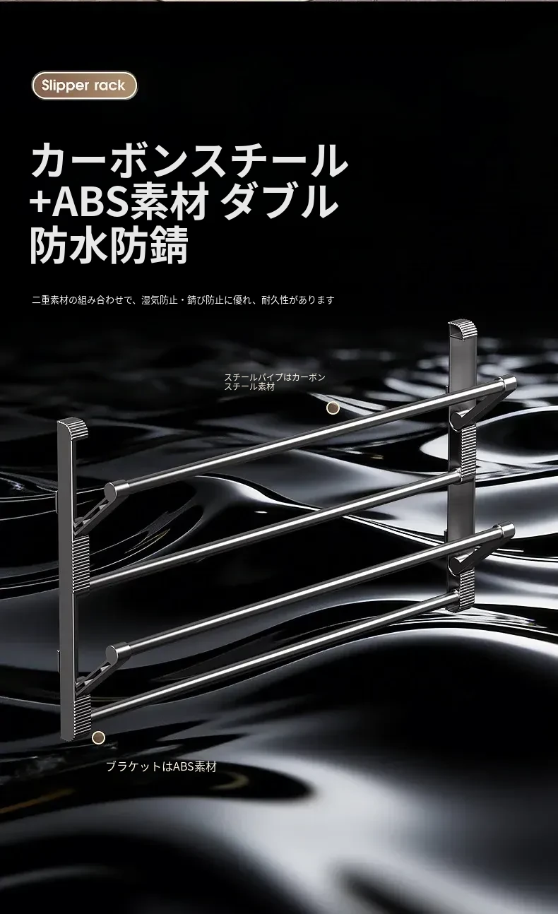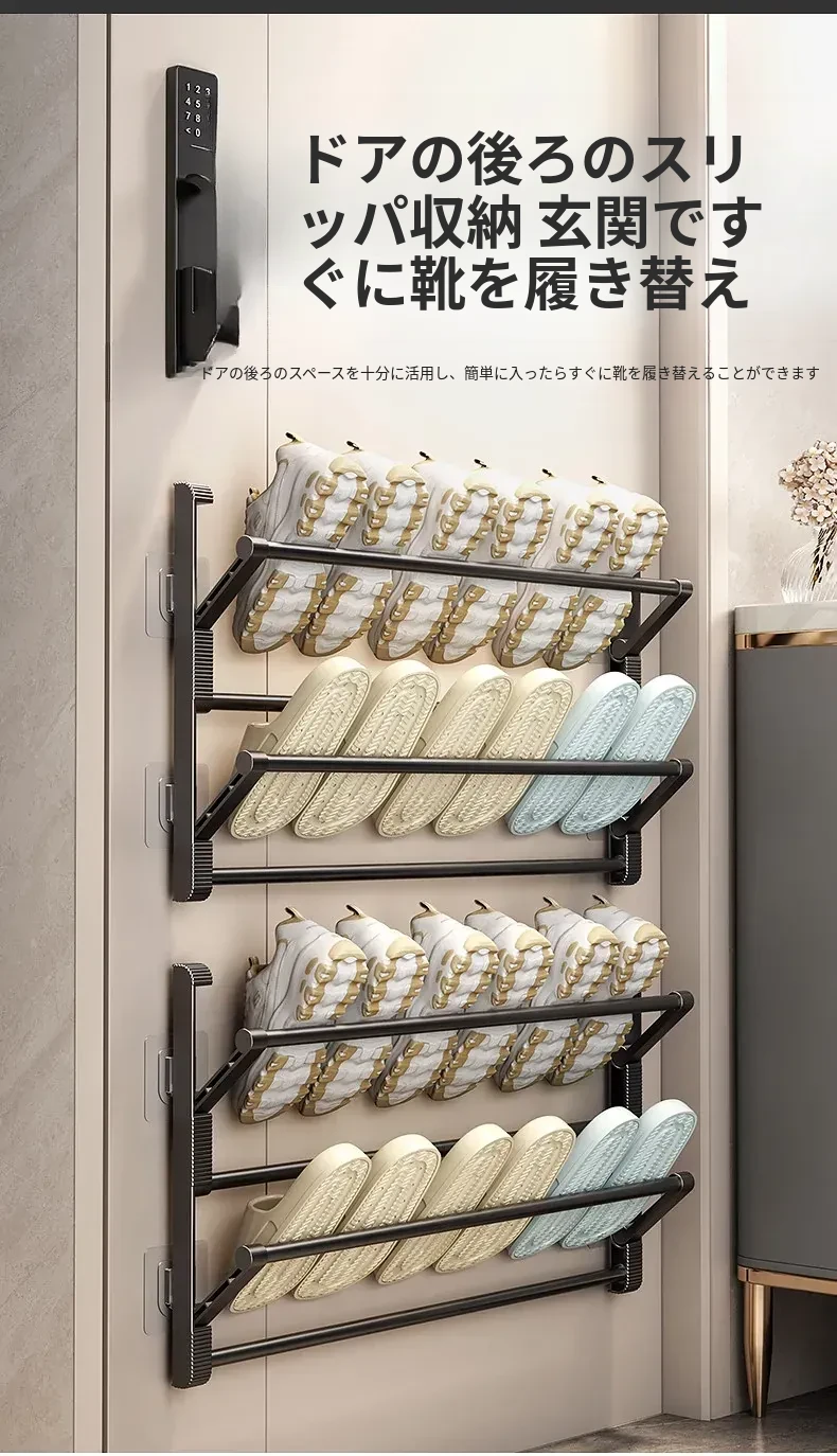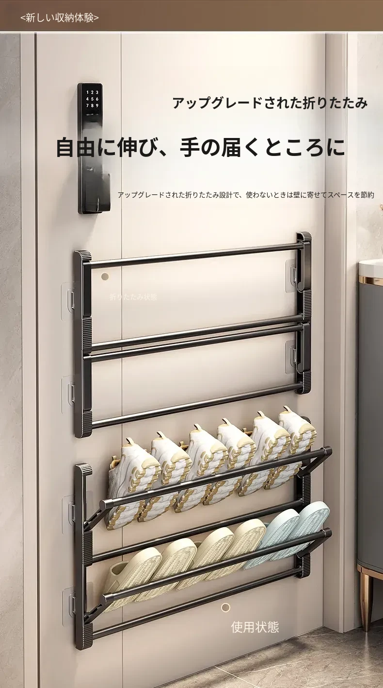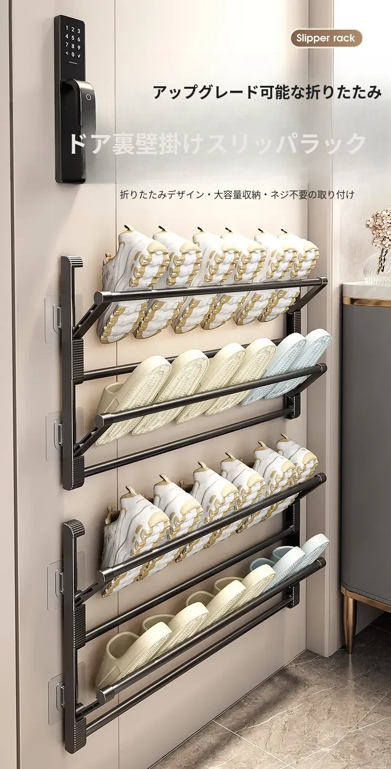 バスルーム用スリッパラック 壁掛け式・ドア裏設置・水切り機能付き 折りたたみ二段収納シューズオーガナイザー!スペースを有効活用して、清潔で整理整頓されたバスルームを実現!