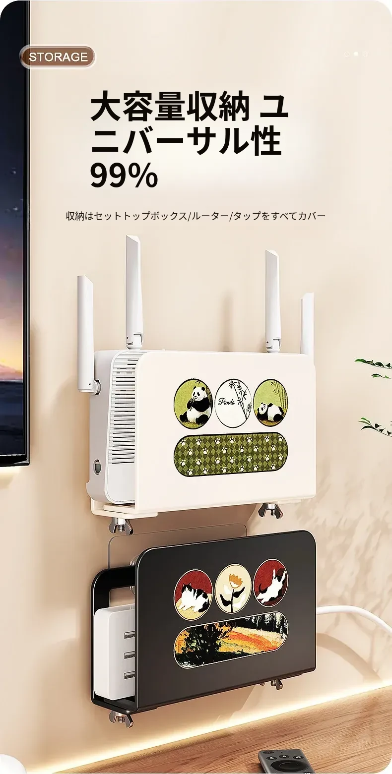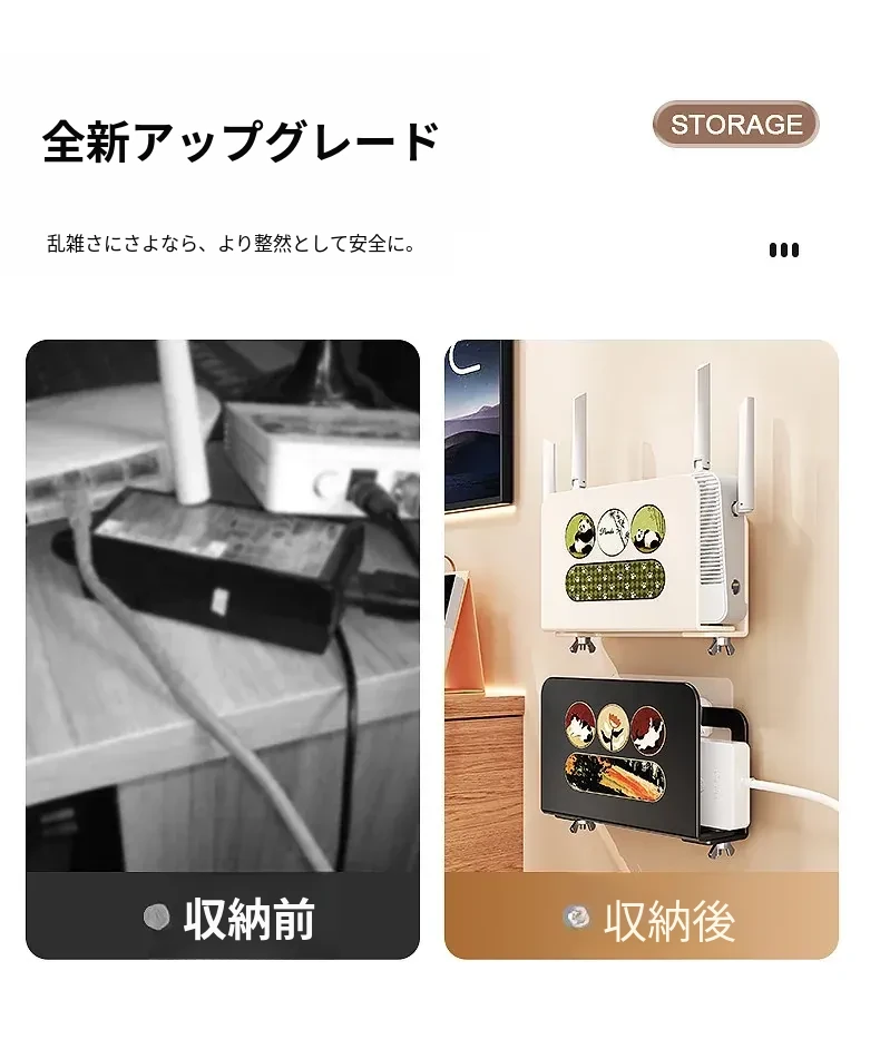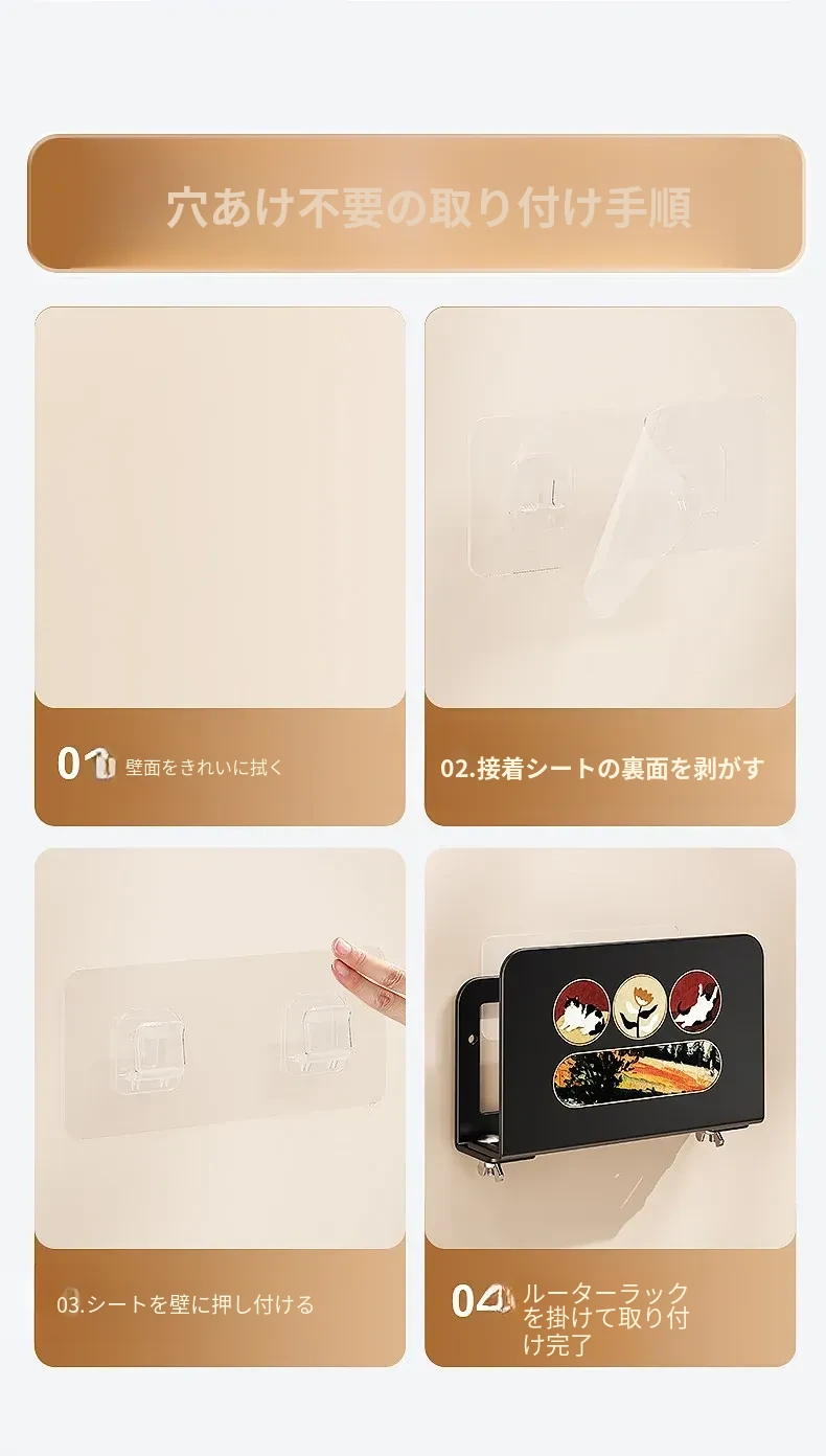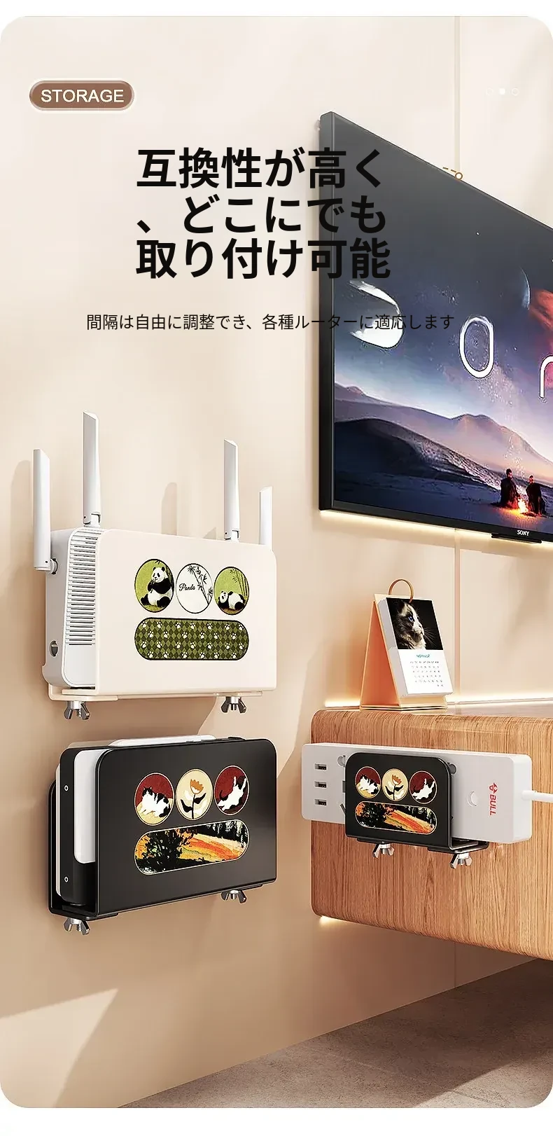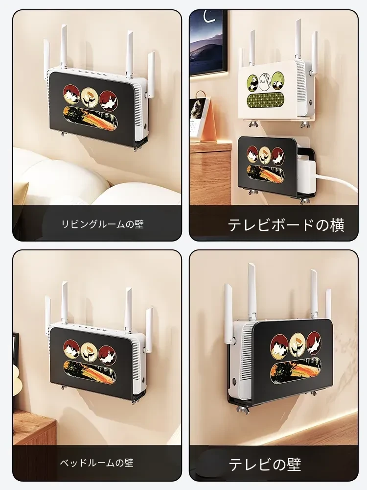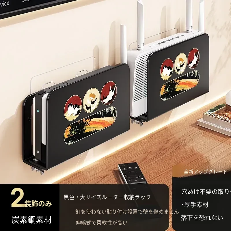 穴あけ不要のルーター収納ラック!壁掛け式でスッキリ収納、機器をしっかり固定。Wi-Fiと電源タップを一元管理できる便利なアイテム。お部屋をスッキリ整頓し、快適なネット環境を実現!