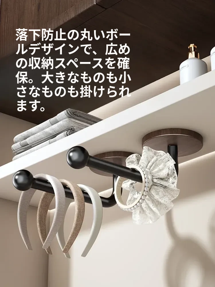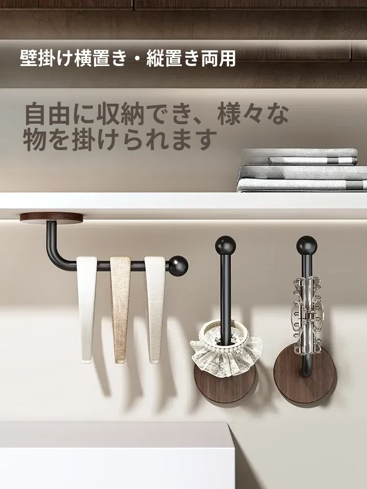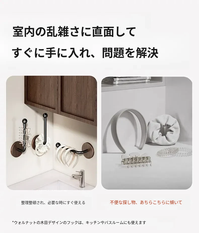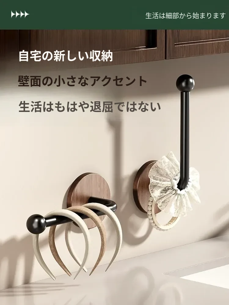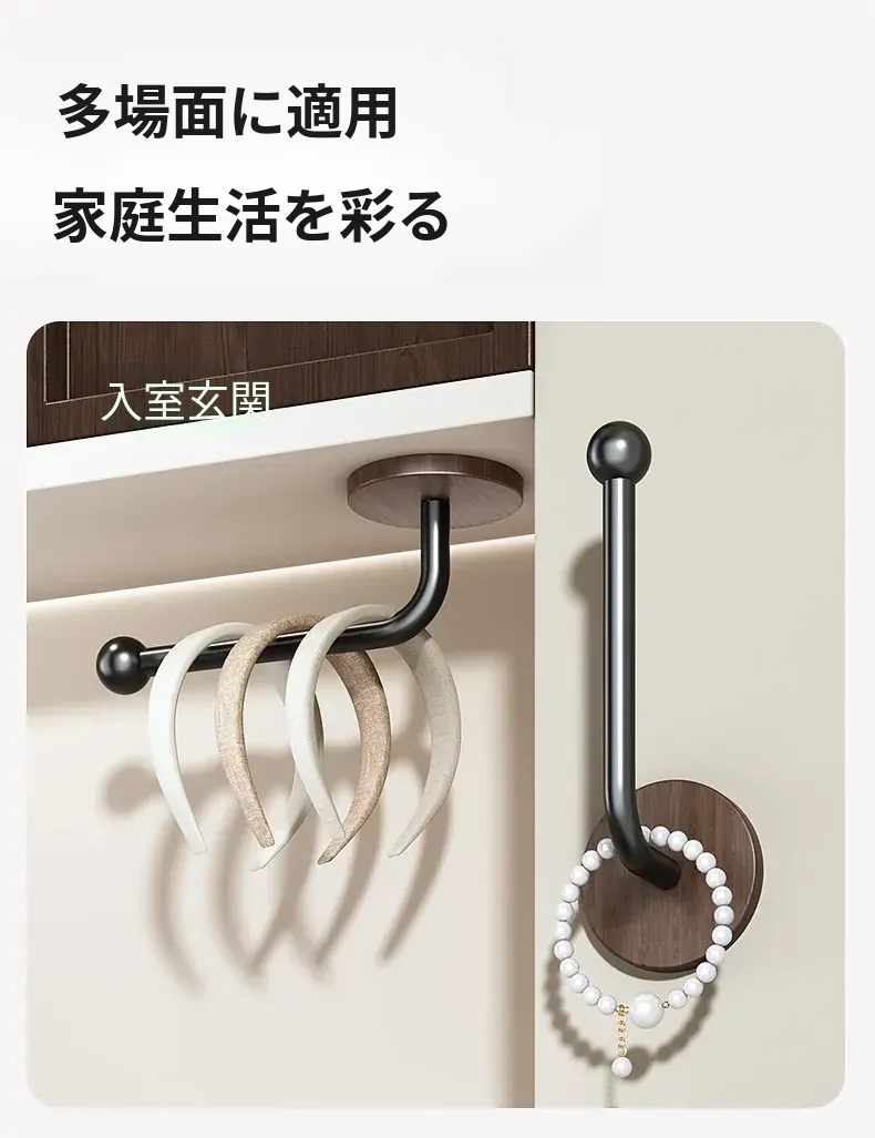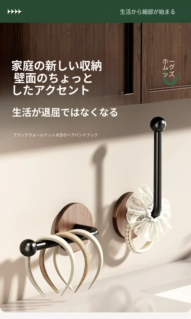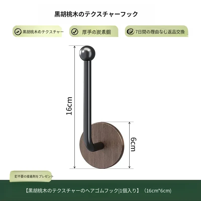 くるみ材のヘアバンドフック付き壁掛け収納!穴あけ不要で簡単取り付け、ヘアゴムやヘアアクセサリーをスッキリ整理。おしゃれなデザインでバスルームを美しく飾ります!