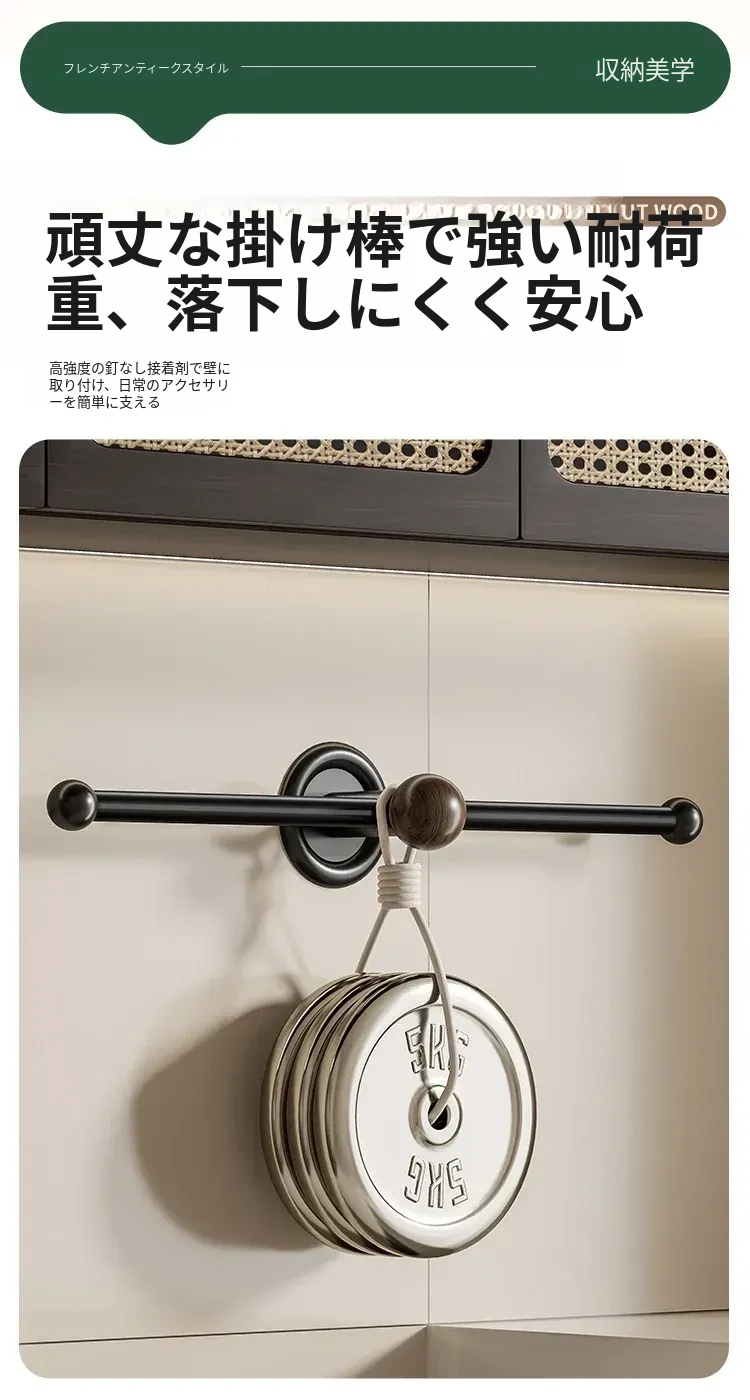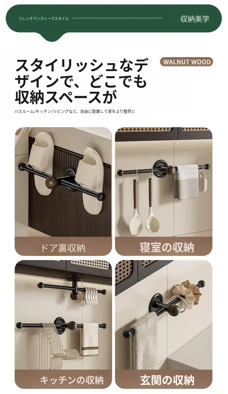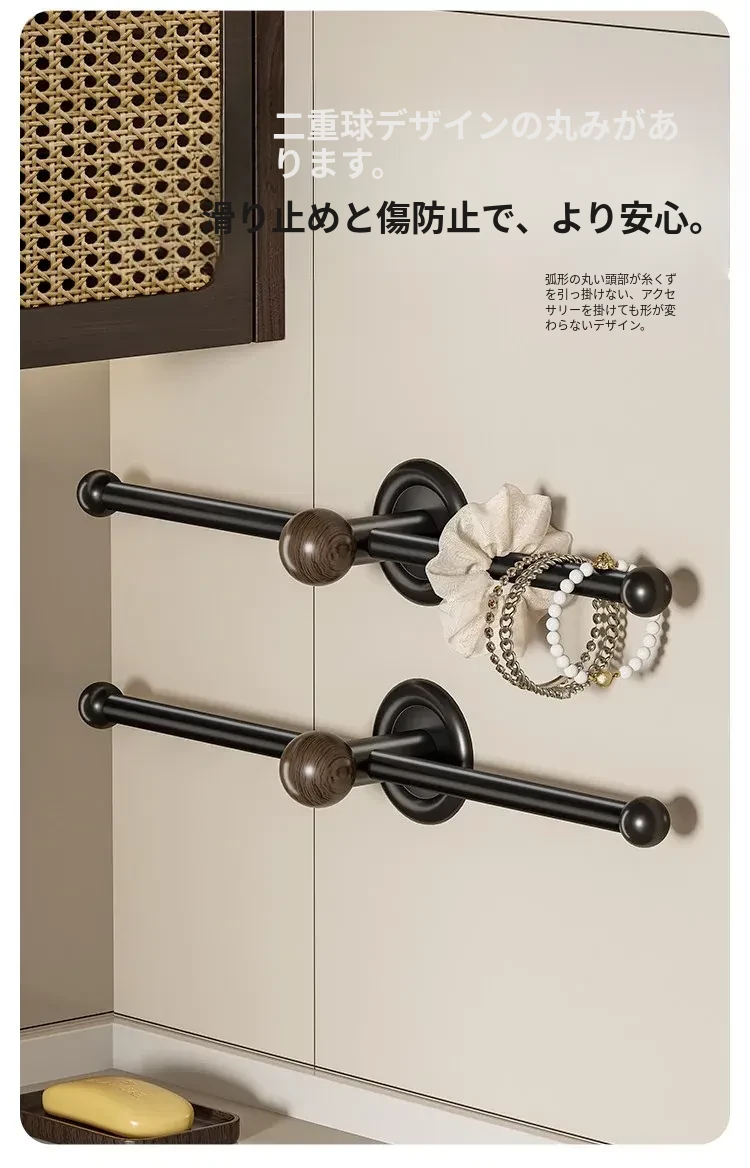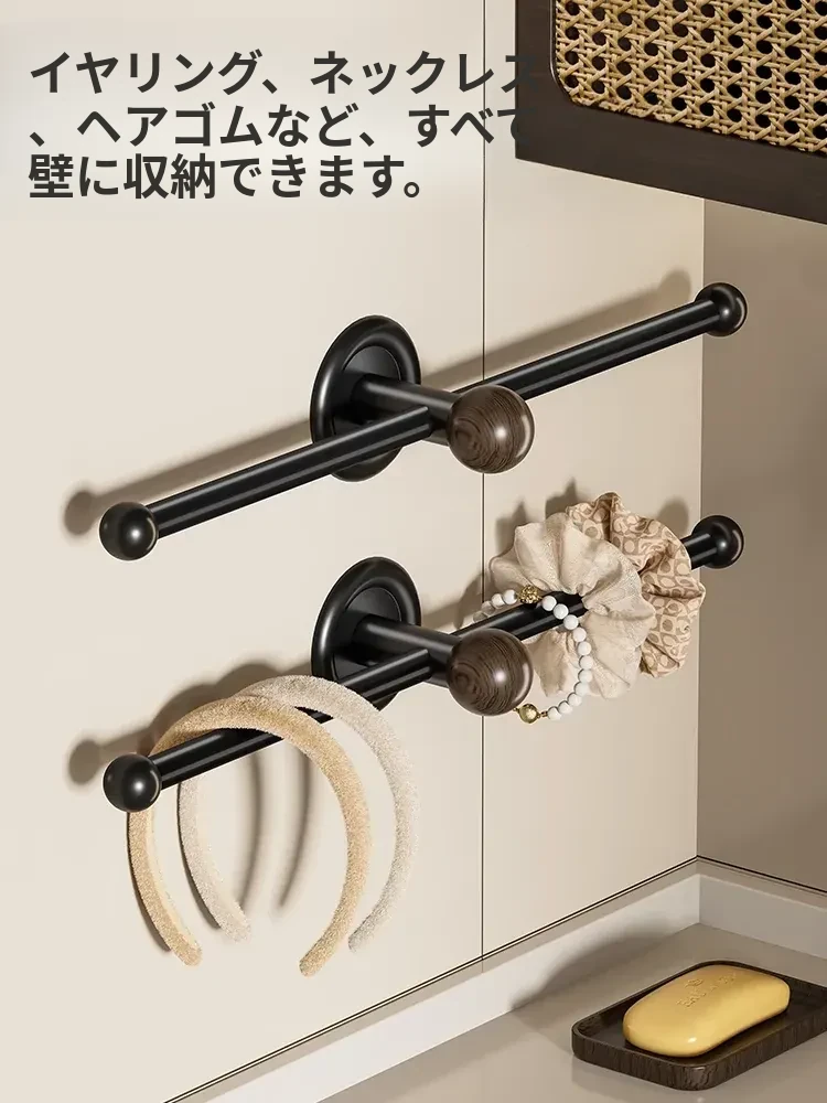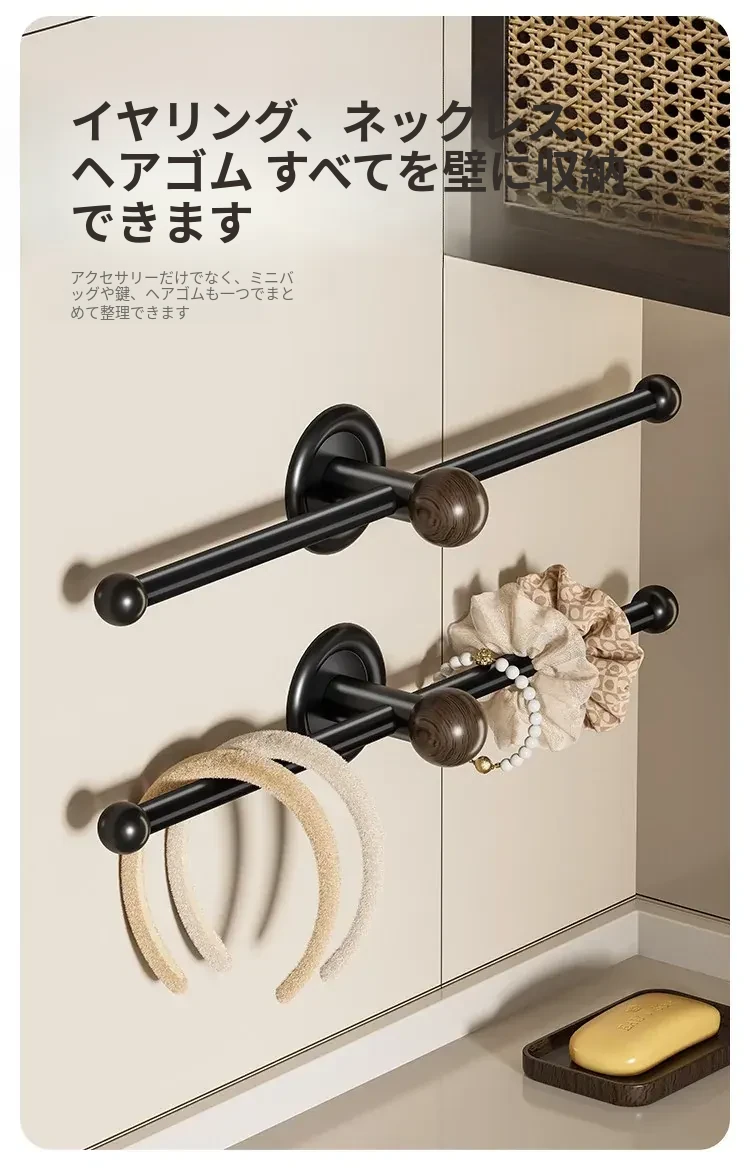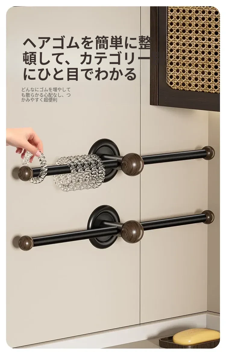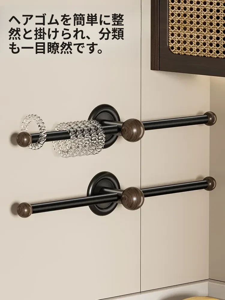 ウォールマウント式くるみの木製ヘアアクセサリー収納ラック - 穴あけ不要!おしゃれに髪のゴムやヘアピンを整理整頓。バスルームやお部屋にぴったりな便利なフック!