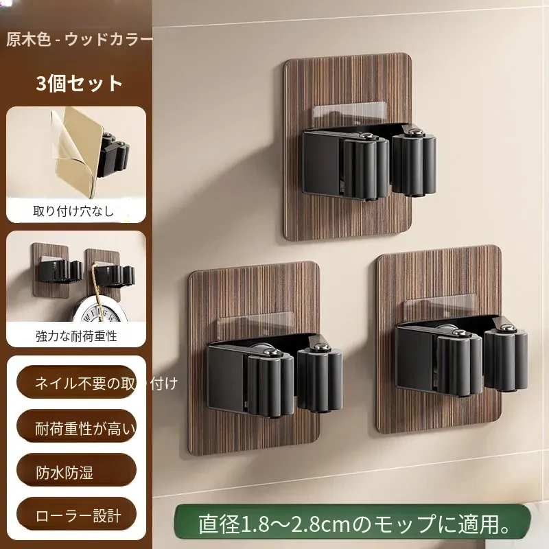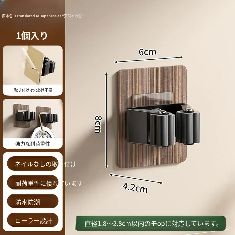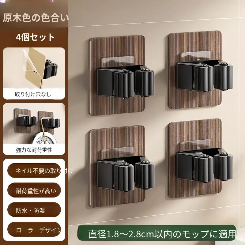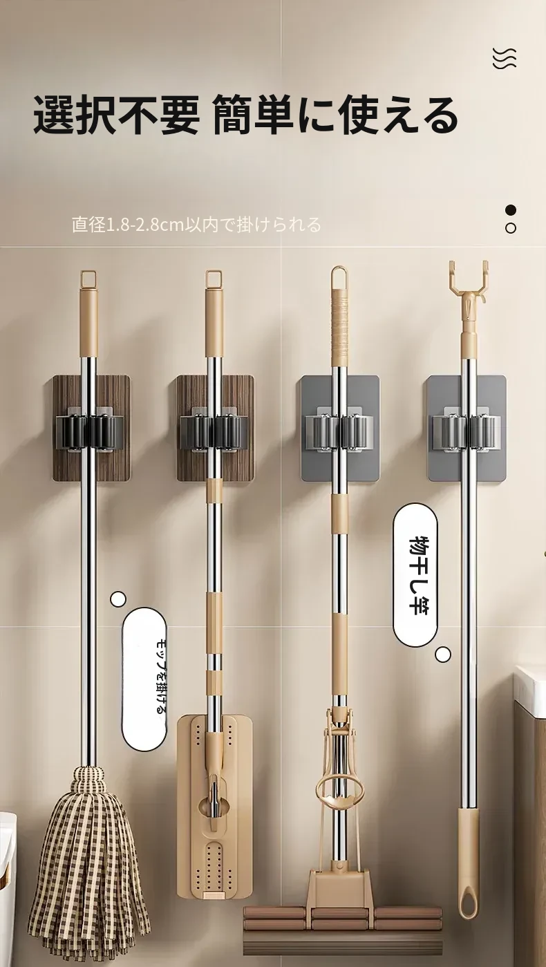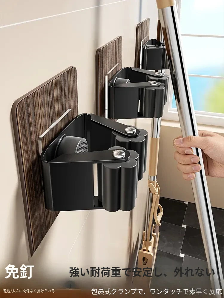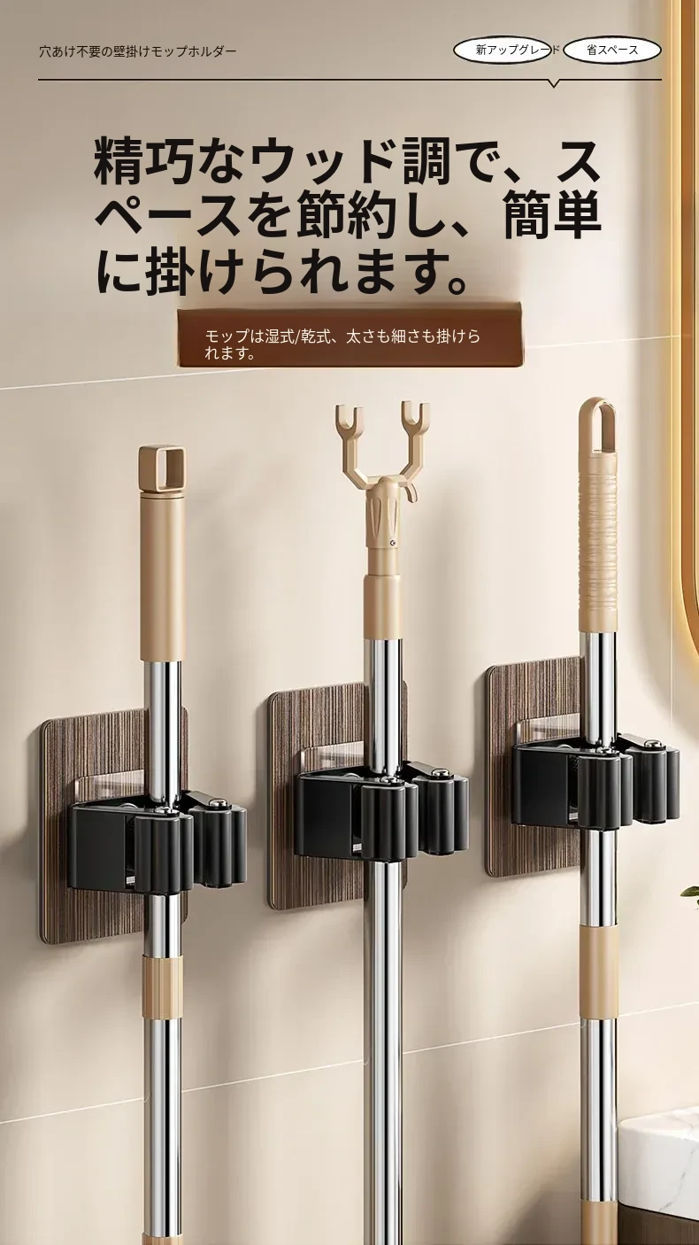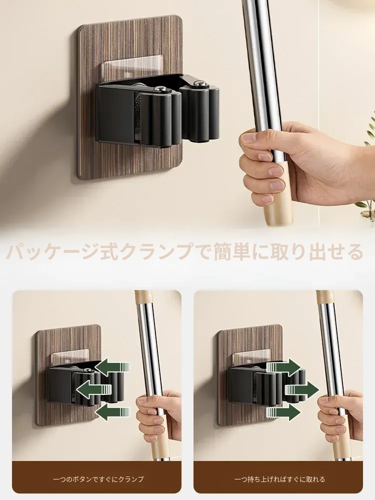 木目調モップ・ほうき壁掛けクリップ、穴あけ不要の便利フック!バスルームや家の整理整頓に最適なマジックフックで、掃除道具をスマートに収納!