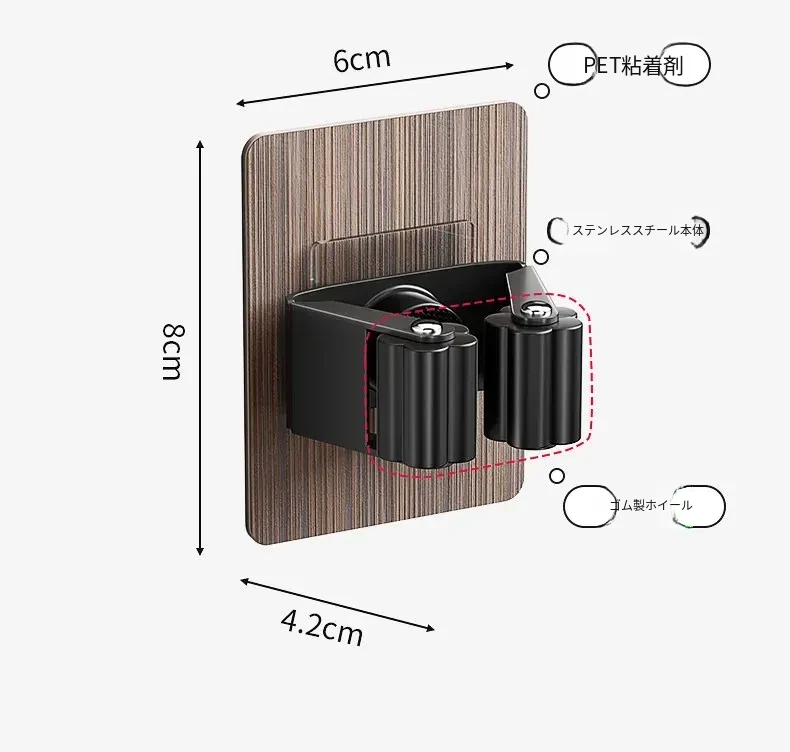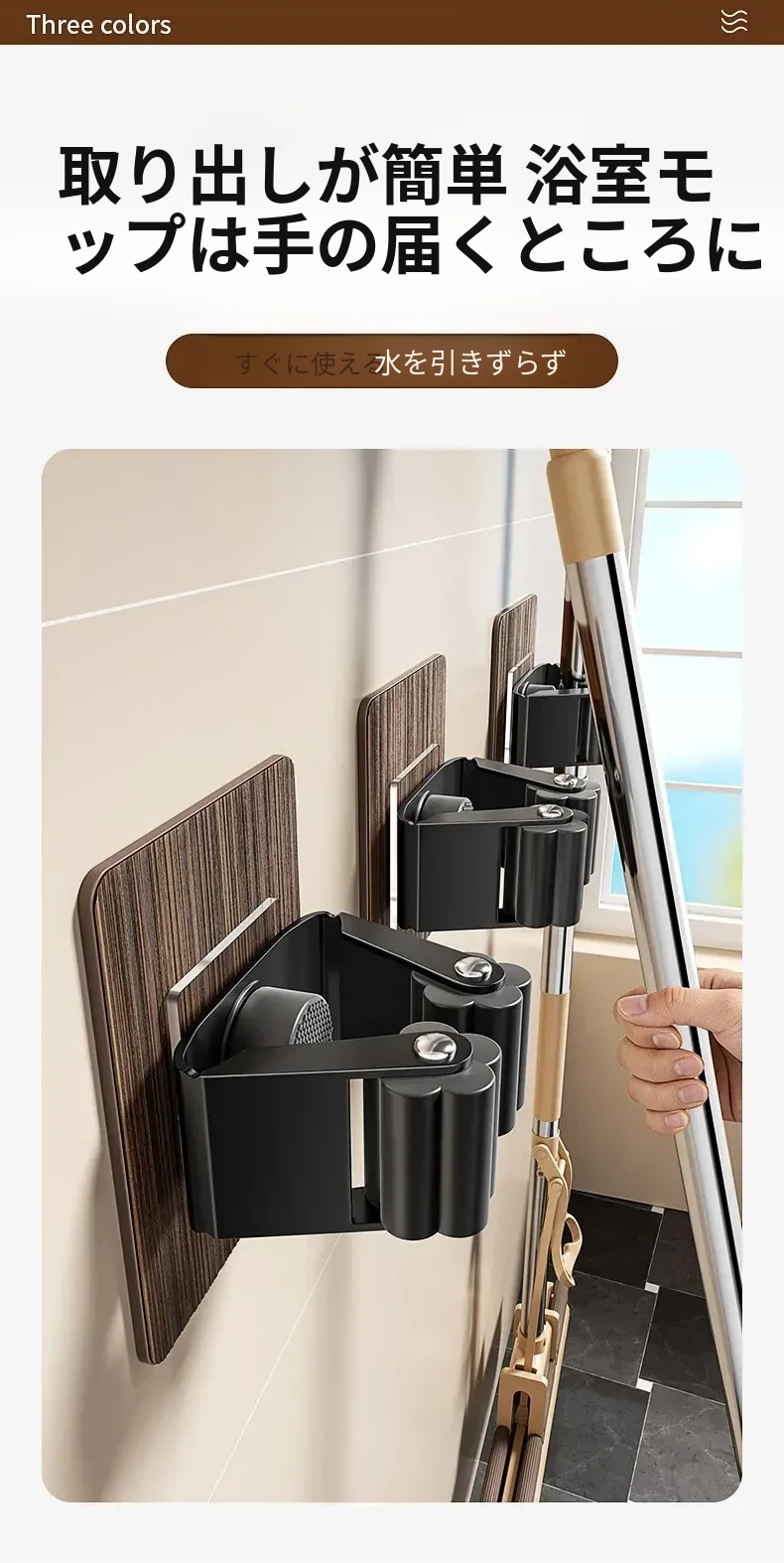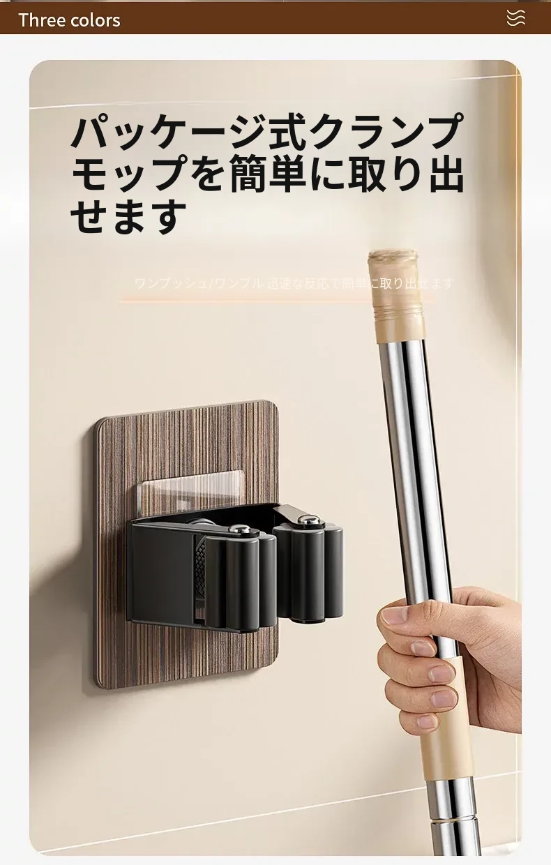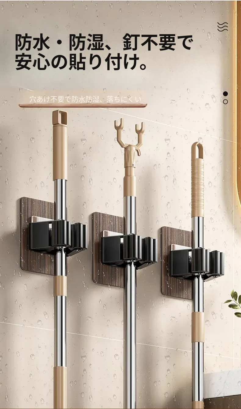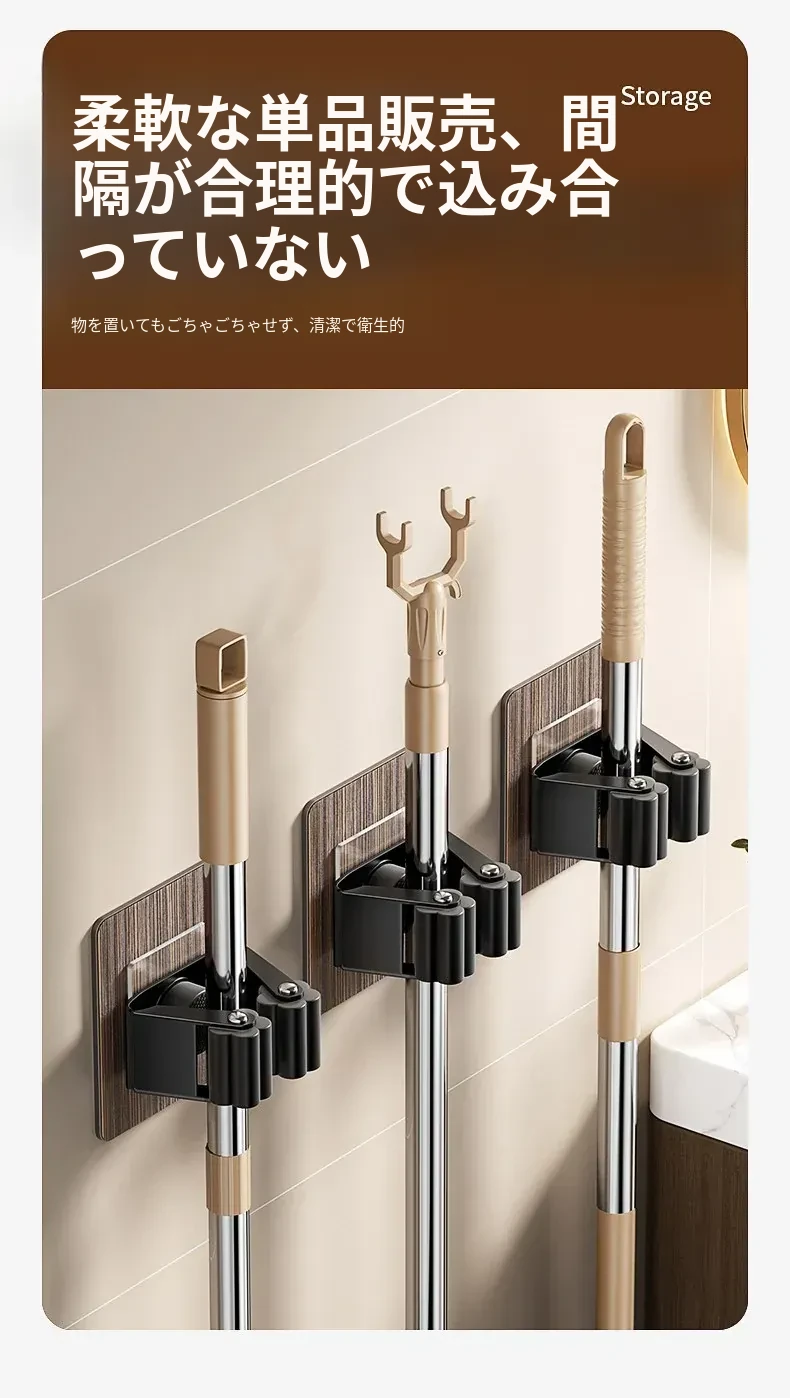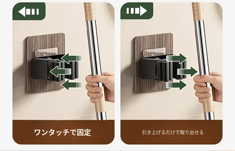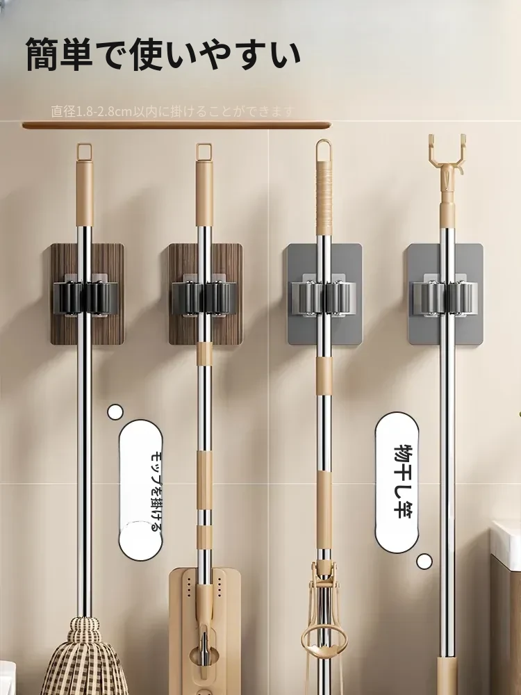 木目調モップ・ほうき壁掛けクリップ、穴あけ不要の便利フック!バスルームや家の整理整頓に最適なマジックフックで、掃除道具をスマートに収納!