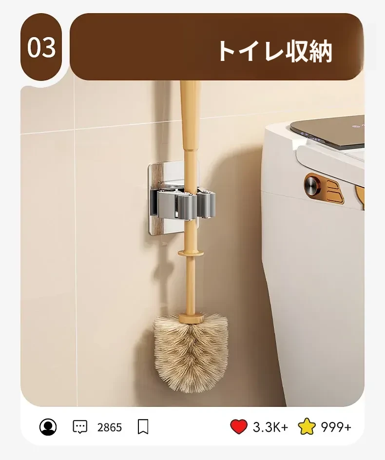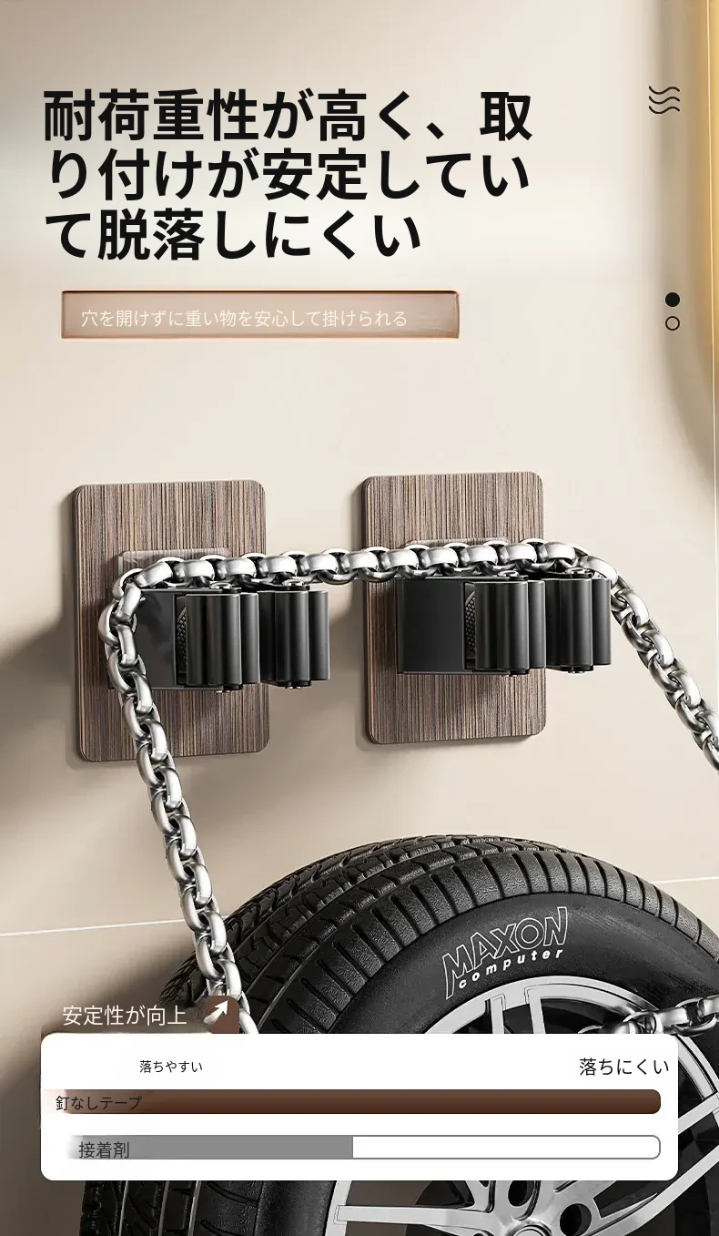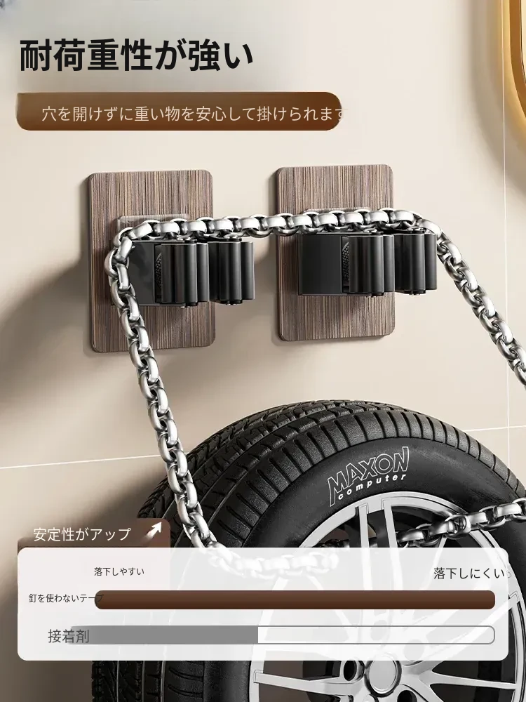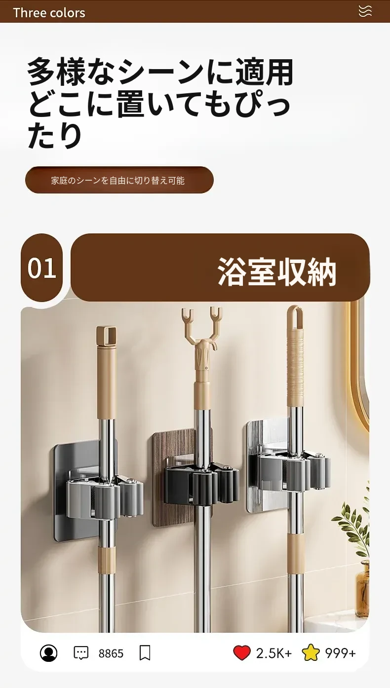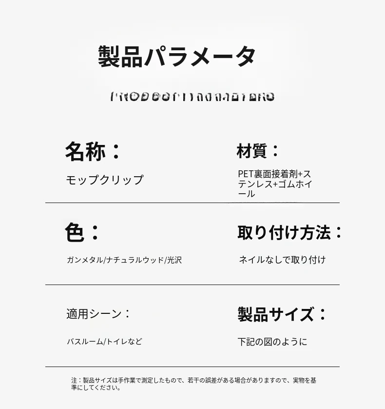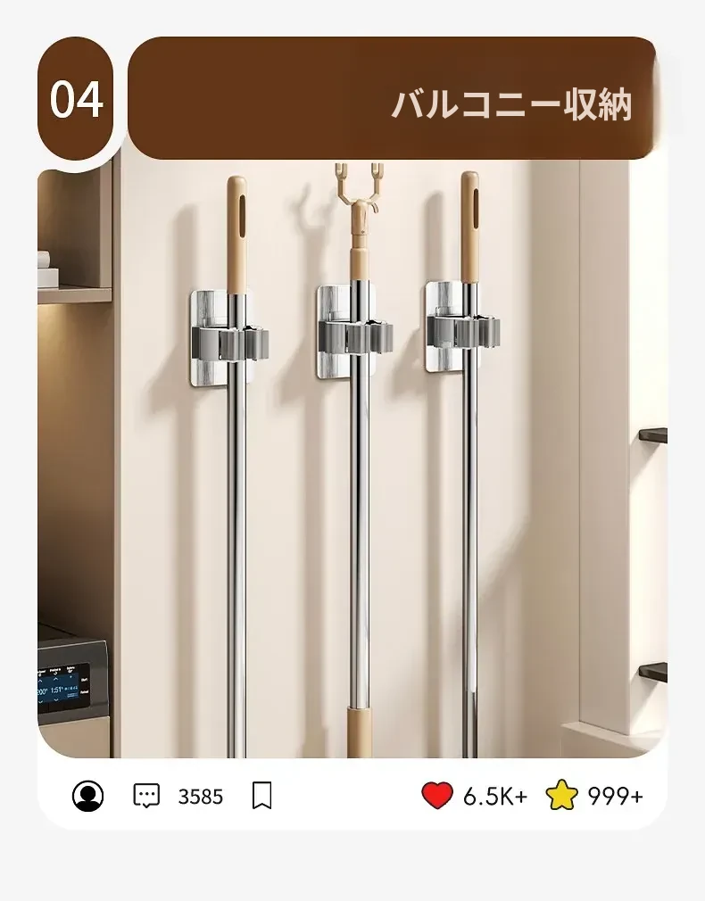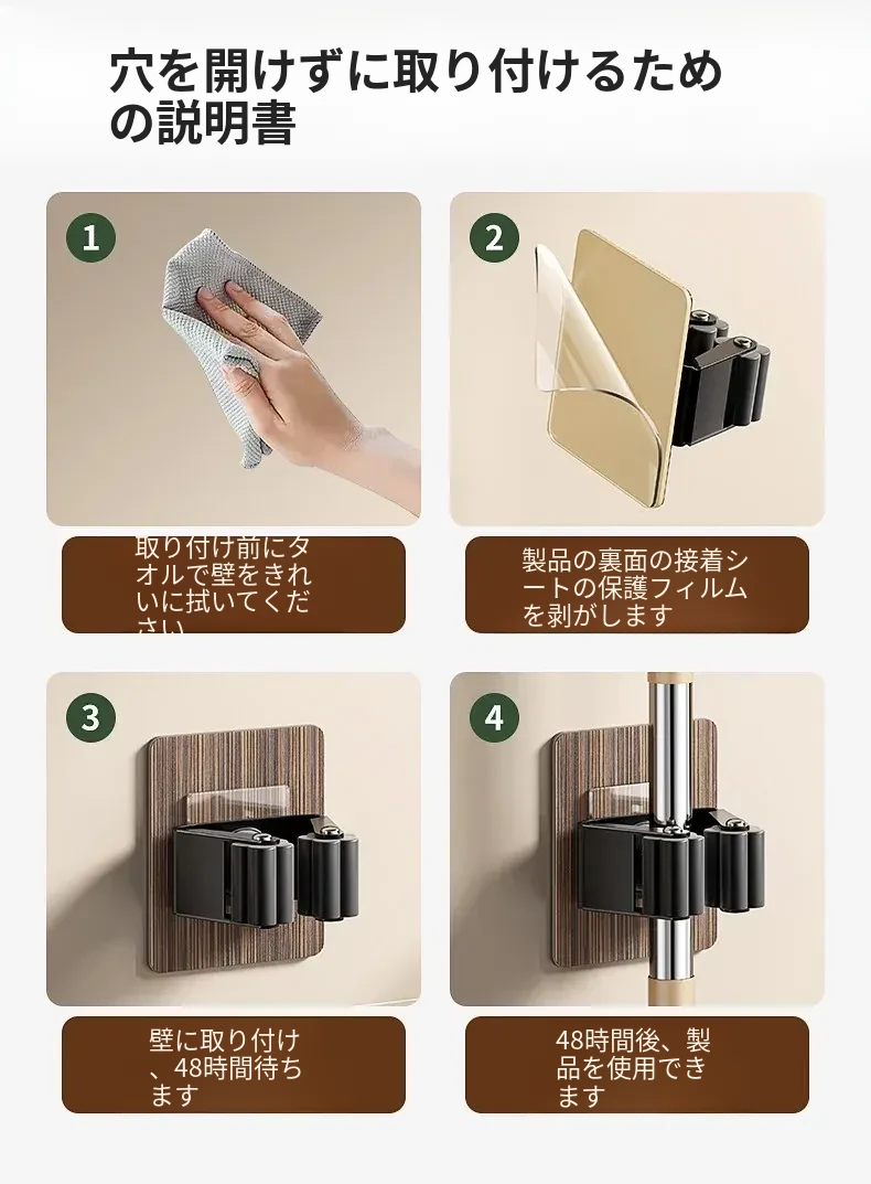 木目調モップ・ほうき壁掛けクリップ、穴あけ不要の便利フック!バスルームや家の整理整頓に最適なマジックフックで、掃除道具をスマートに収納!
