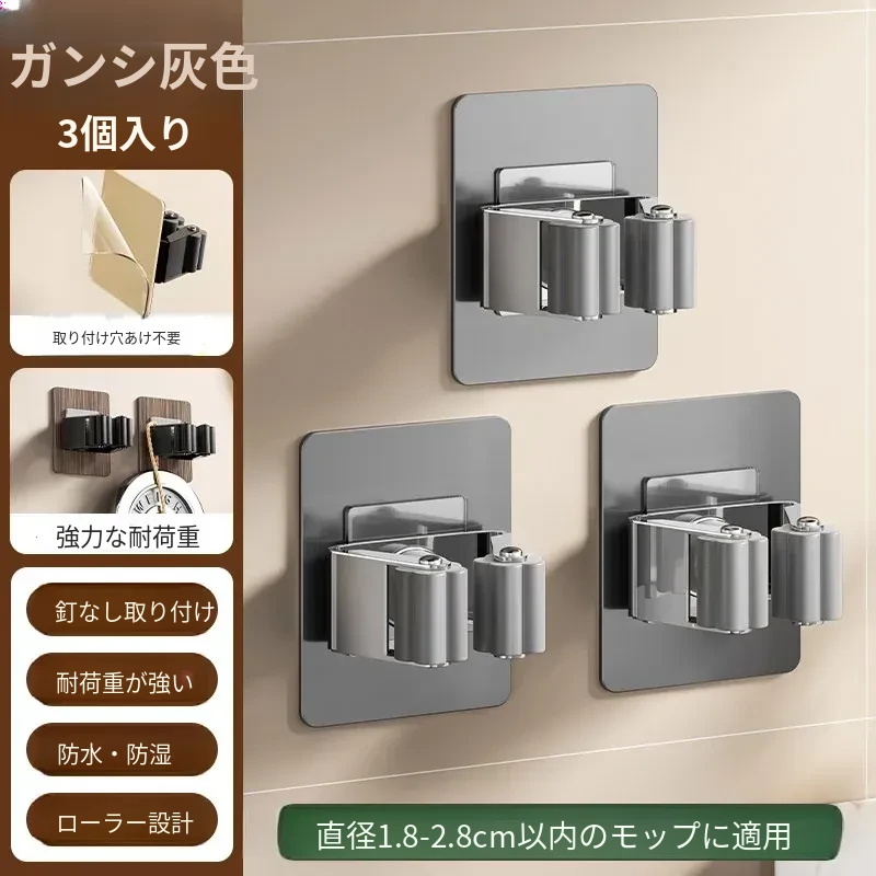 【ガンメタルカラー】モップ壁掛けクリップ✅3個入り