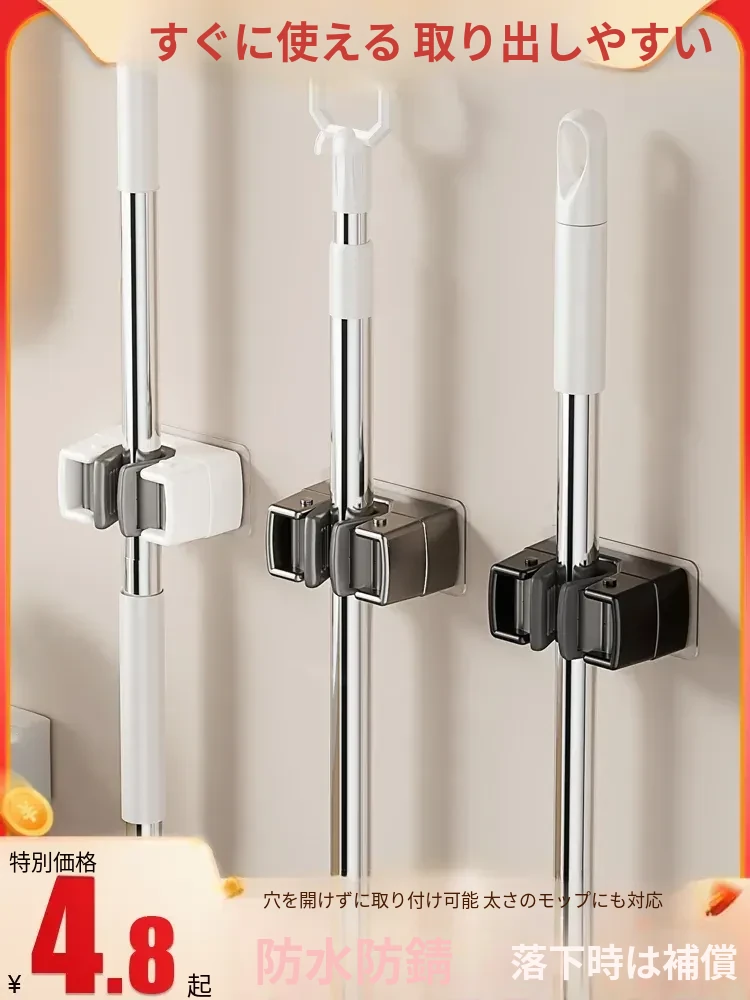 壁掛けモップホルダー - 穴あけ不要で簡単取り付け!掃除道具をスッキリ収納できる衛生的なバスルーム収納ラック。壁面を有効活用して、快適な掃除環境を実現!