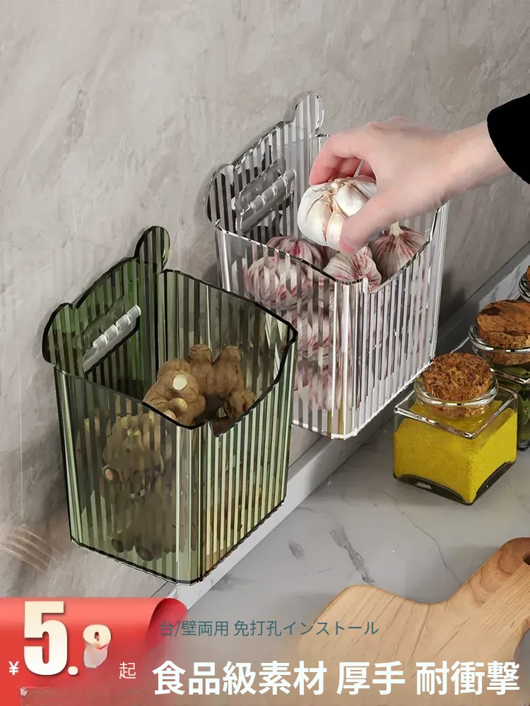 キッチン用ネギ、生姜、ニンニク収納ボックス 壁掛け式生姜・ニンニクハンギングバスケット アクリル製調味料・野菜ラックでスッキリ整理!おしゃれで実用的なキッチン収納アイテムです。