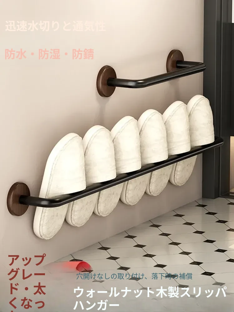 くるみの木製バスルームスリッパラック - 穴あけ不要!おしゃれなトイレ収納ラックで、靴をすっきり整理。壁掛け式で水切れもバッチリ。清潔感あふれるトイレ空間を実現します!