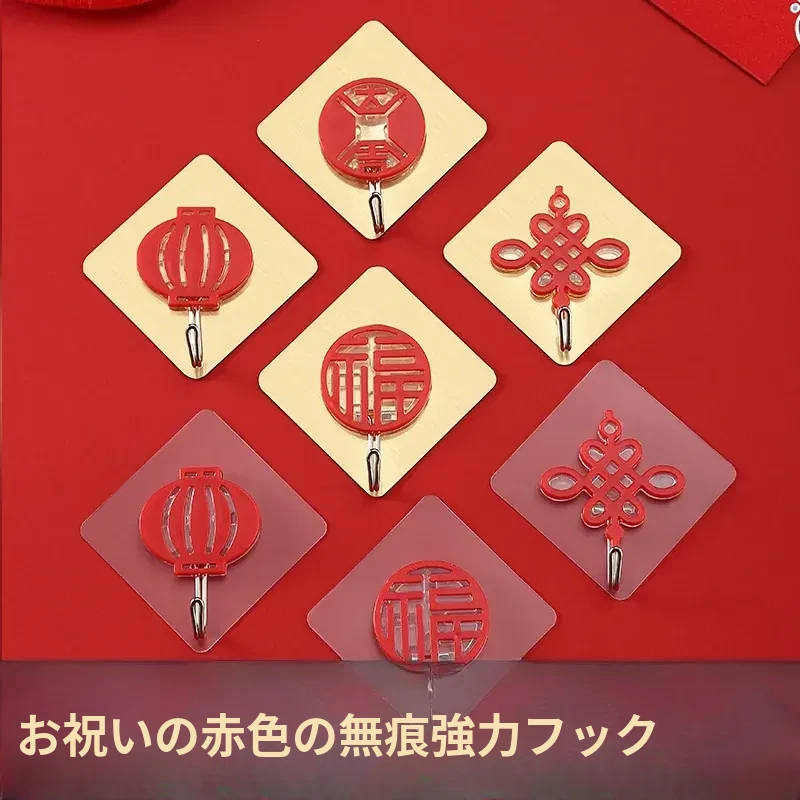 新年を祝う!福字デザインの強力粘着フック - 壁に穴を開けずに簡単取り付け、跡が残らない赤い粘着フックでおしゃれに飾ろう!