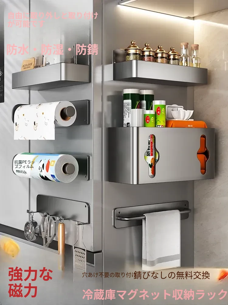 冷蔵庫用マグネット収納ラック!穴を開けずに取り付け可能なキッチン用ペーパータオルホルダー、ラップや調味料の収納に最適!整理整頓が簡単で、スペースを有効活用!