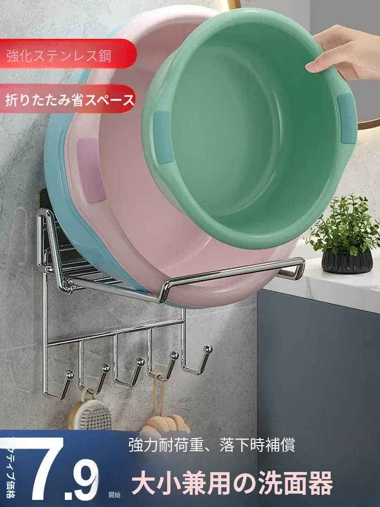 折りたたみ式洗面器収納ラック - バスルームに最適!壁掛けタイプでトイレや洗面台のスペースを有効活用。穴を開けずに簡単設置、整理整頓がスムーズに!
