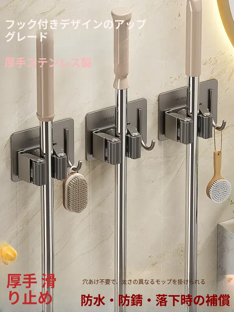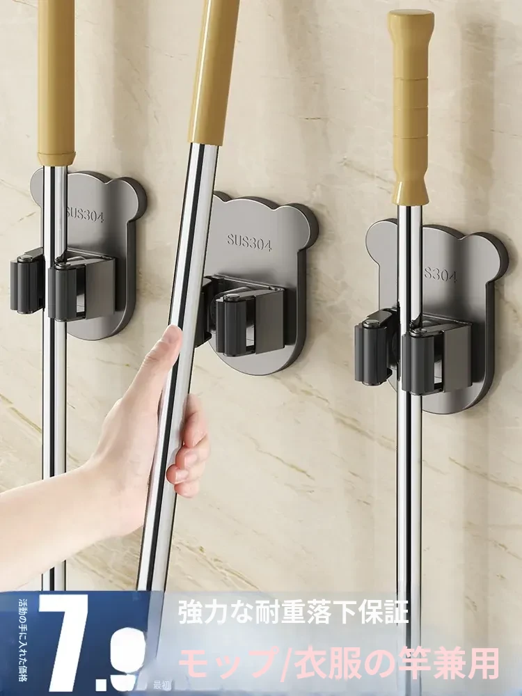 トイレ用壁掛けモップホルダー・強力粘着フック・穴あけ不要の便利グッズ・バスルームに最適な掃除道具・モップやほうきをしっかり固定!