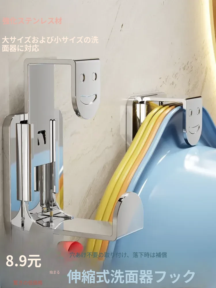 ステンレス製洗面器フック付きバスルーム収納ラック - 穴あけ不要!洗面器やバスボウルをスタイリッシュに収納できる便利なアイテムです。清潔感溢れるデザインで、狭いスペースも有効活用!