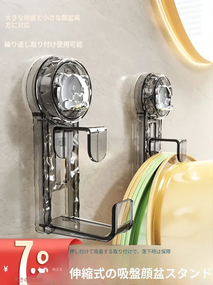 吸盤付き洗面器収納ラック - 穴あけ不要!おしゃれなバスルーム用壁掛け収納、洗面器フック&バスケットでスペースを有効活用!