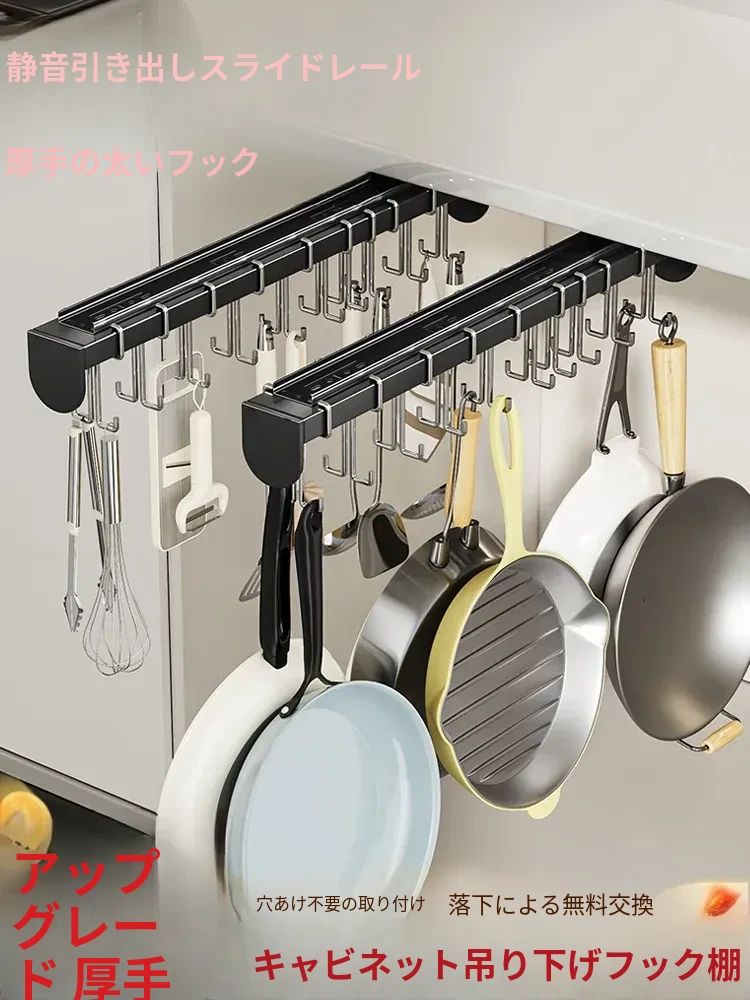 キッチンに最適!穴あけ不要のスライドトラックフック - 鍋やヘラをスマートに収納できる壁掛けラック。整理整頓が簡単に!