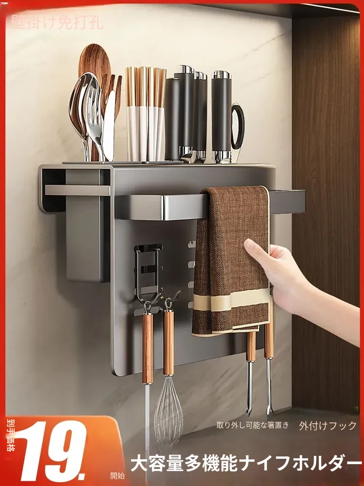 壁掛け式キッチン収納ラック|ネジ不要で簡単設置!多機能スペース節約型ナイフ・箸・スプーンホルダー|家庭用の全てをすっきり整理整頓!