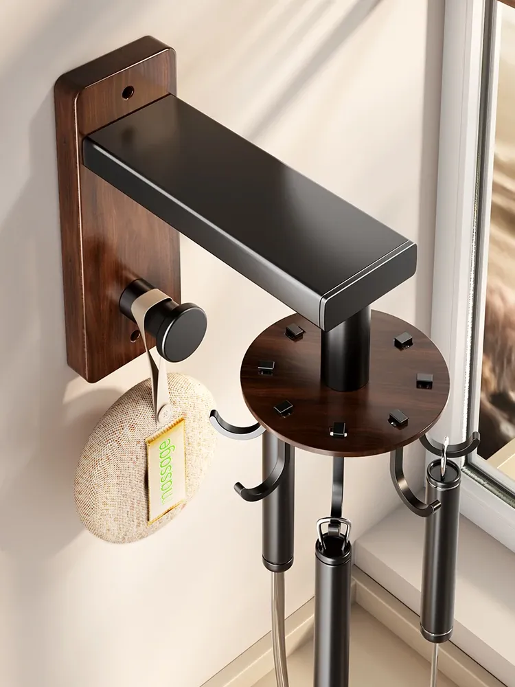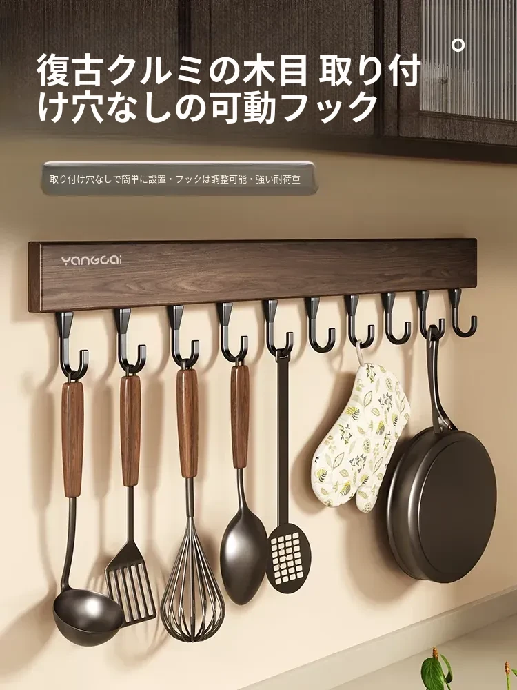 ウォールマウントフックキッチン収納ラック・無穴取り付け可能・くるくる回るクルミ木目デザイン・お玉やフライ返しをスマートに収納・おしゃれで便利なキッチンツールオーガナイザー