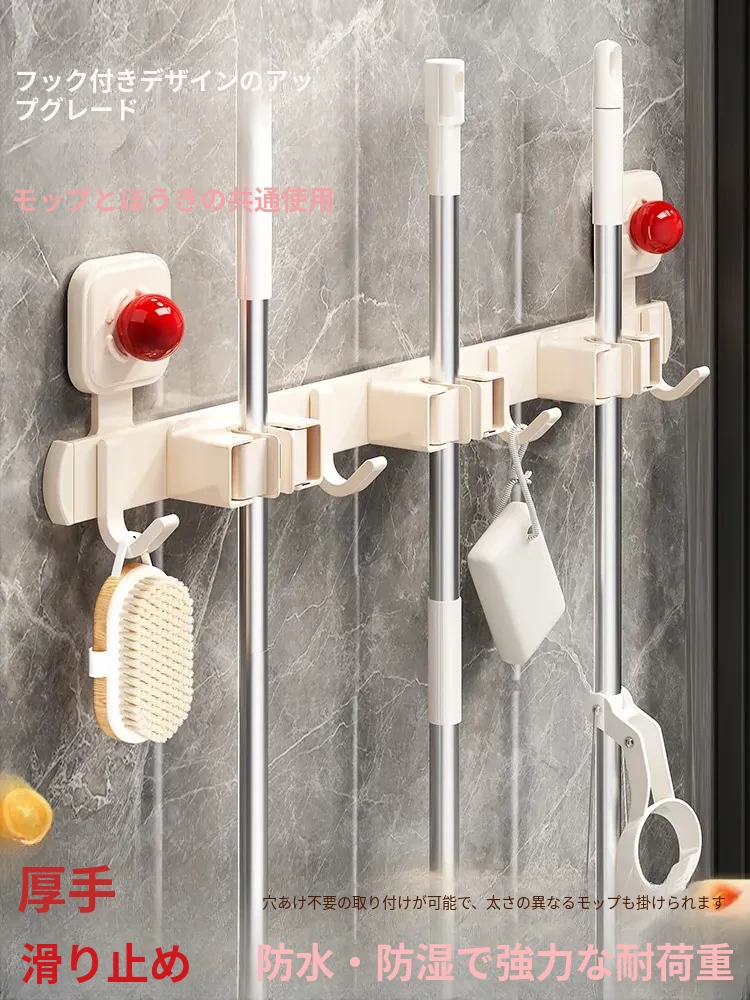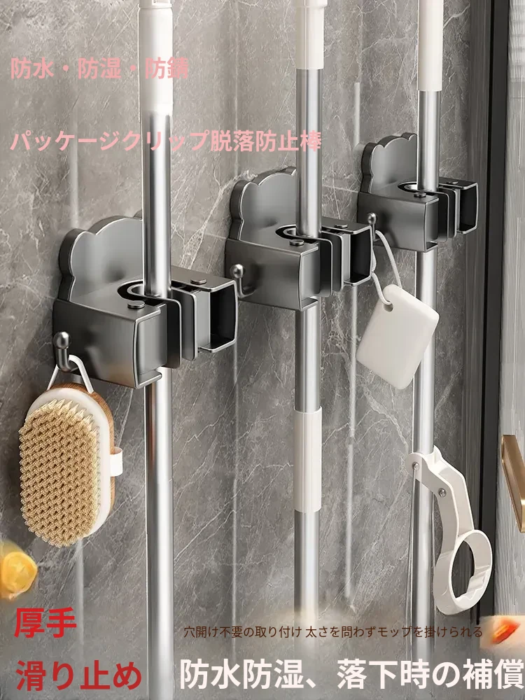 吸盤モップ壁掛けクリップ、穴あけ不要で簡単取り付け!トイレ掃除に最適な掃除道具の収納ハンガー。モップや掃除道具をすっきり整理できる便利な収納アイテム!